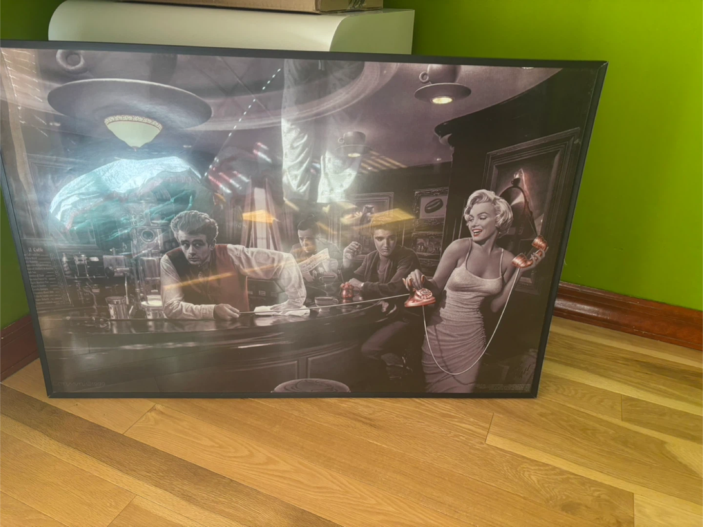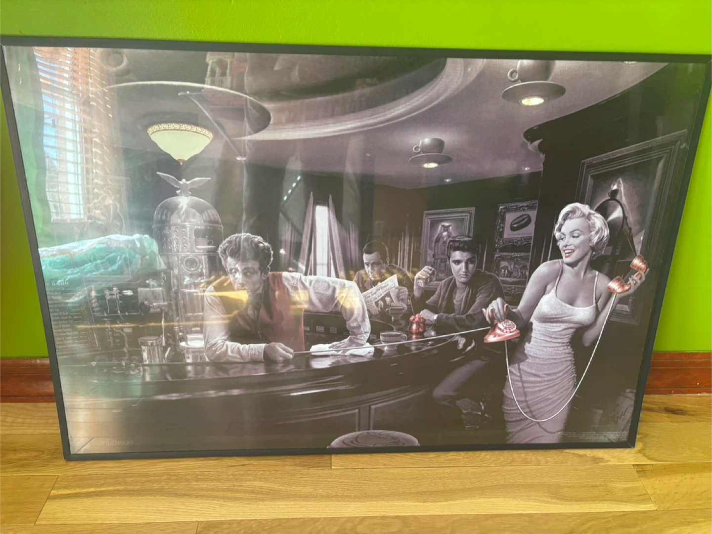 This is a framed print featuring James Dean, Elvis Presley, and Marilyn Monroe at a bar. It's a really cool piece of art!
