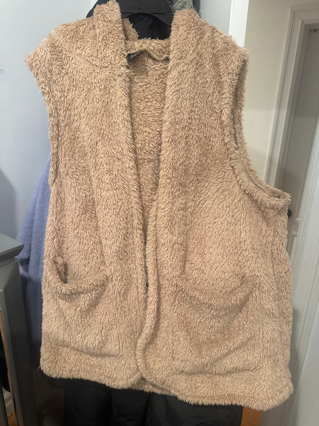 Here's a cozy, fuzzy sleeveless cardigan! It's a great layering piece for fall or winter and features convenient pockets