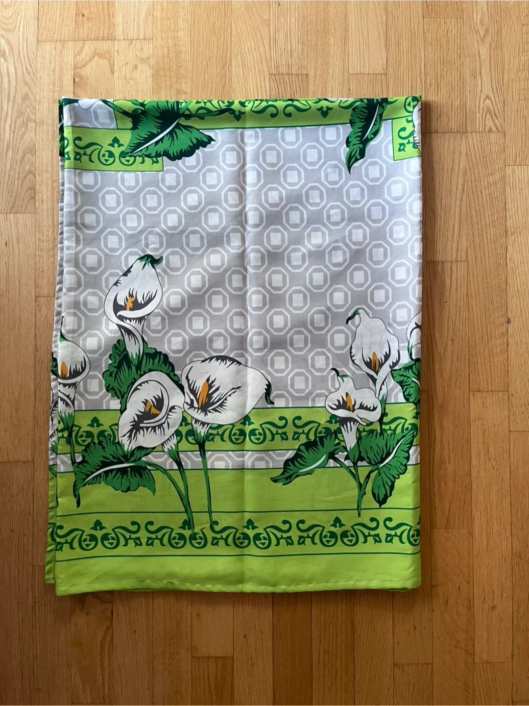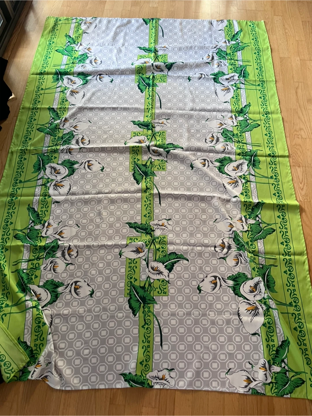 Selling a lovely tablecloth with a floral print! The design features white calla lilies with green foliage on a gray and green patterned background. It's perfect for adding a touch of elegance to your dining table or any special occasion