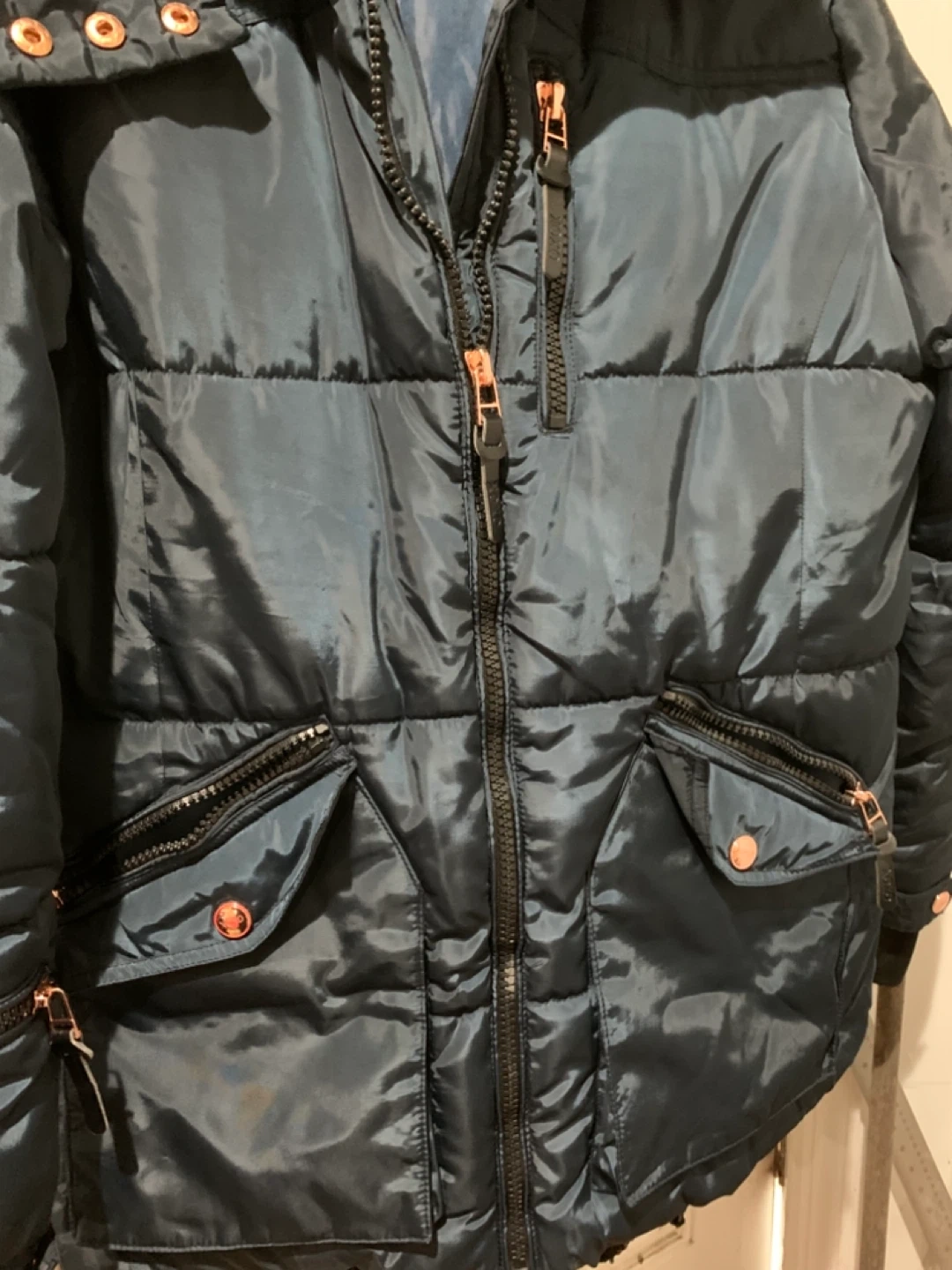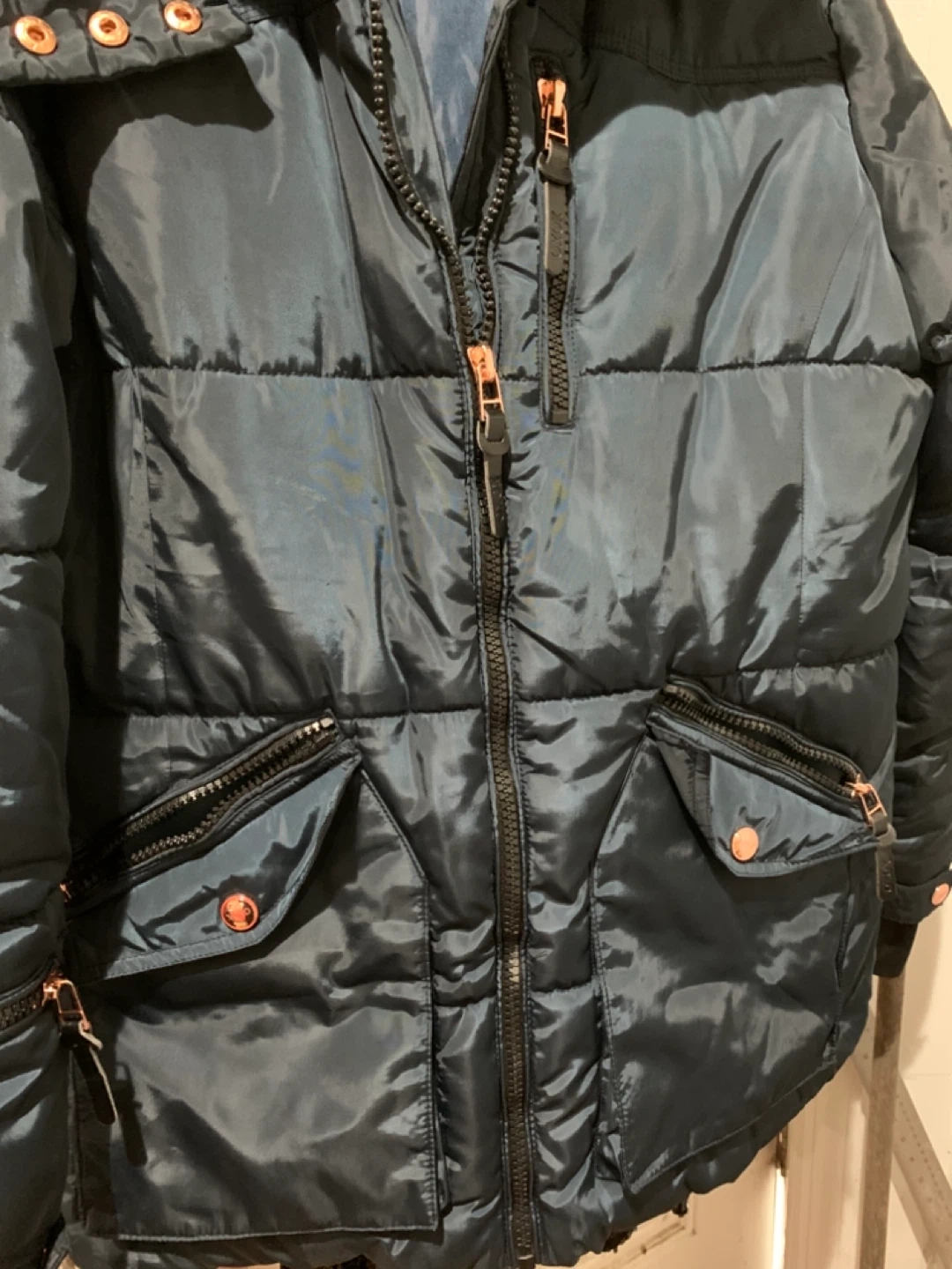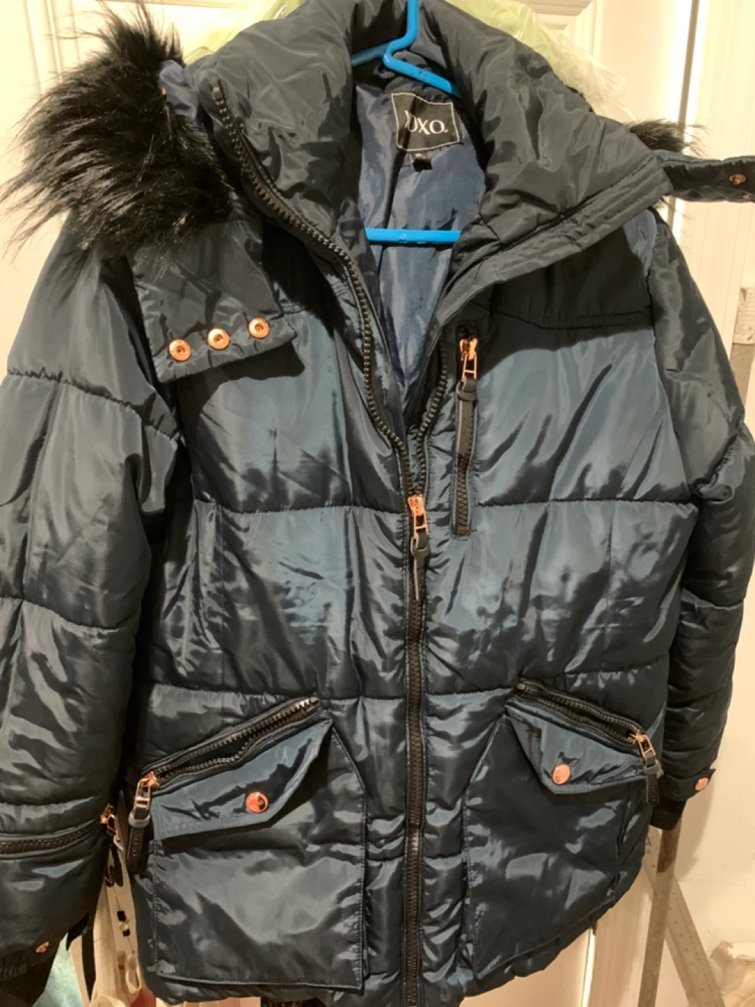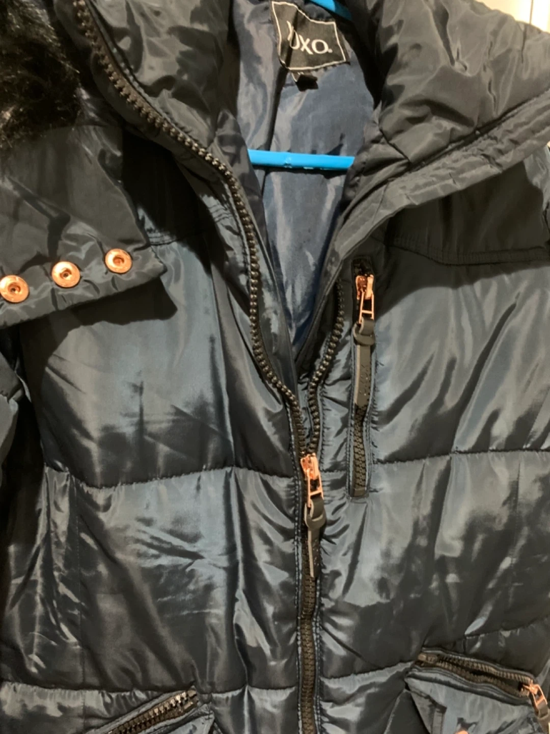 This is a UXO puffer jacket that's in great condition! It's a stylish and warm option for colder weather. The jacket features a full zipper, multiple pockets, and a fur-trimmed hood.