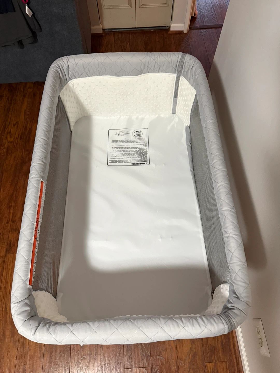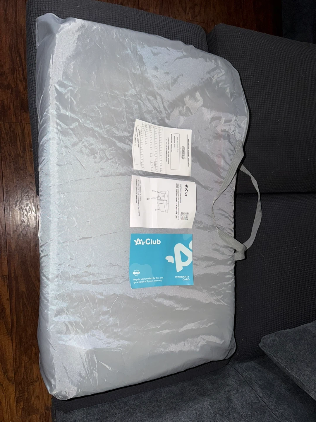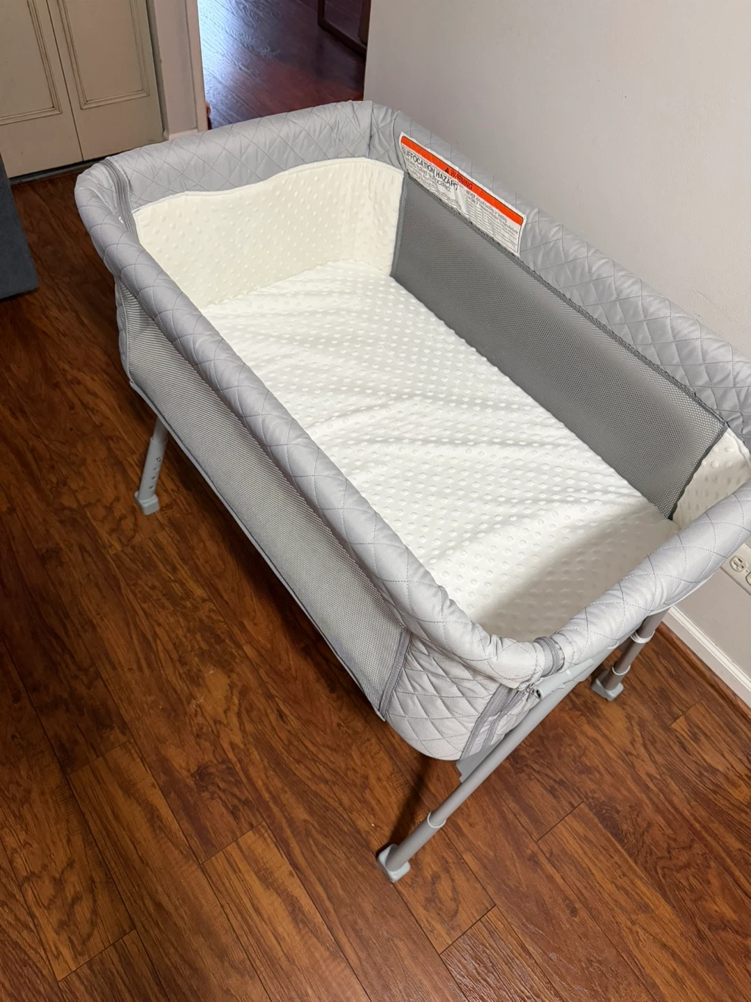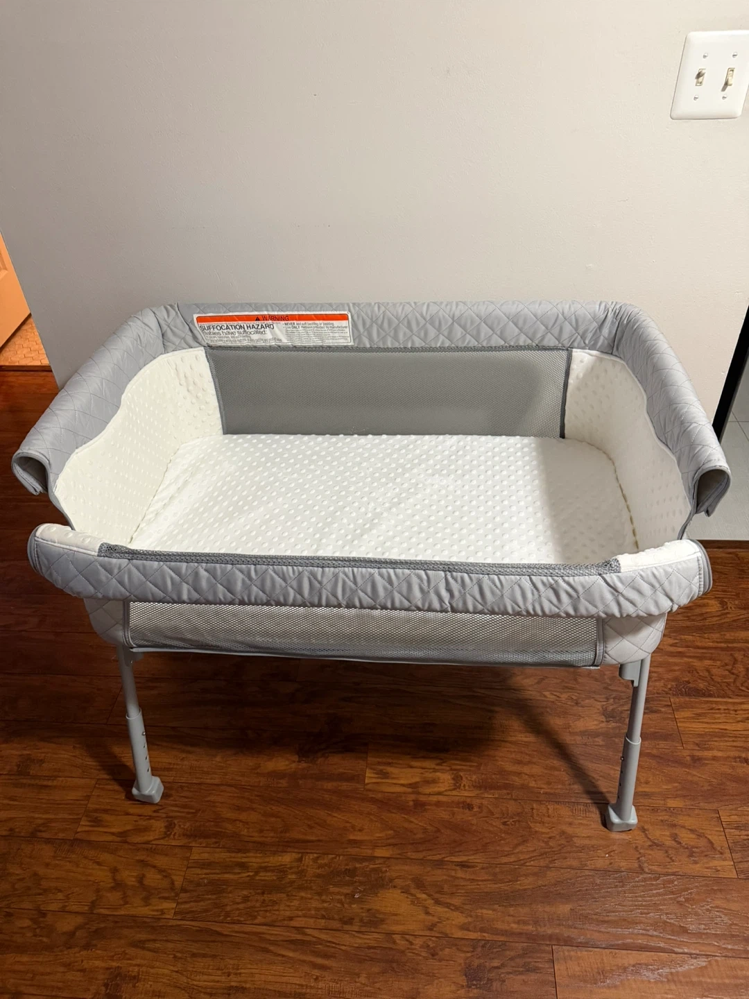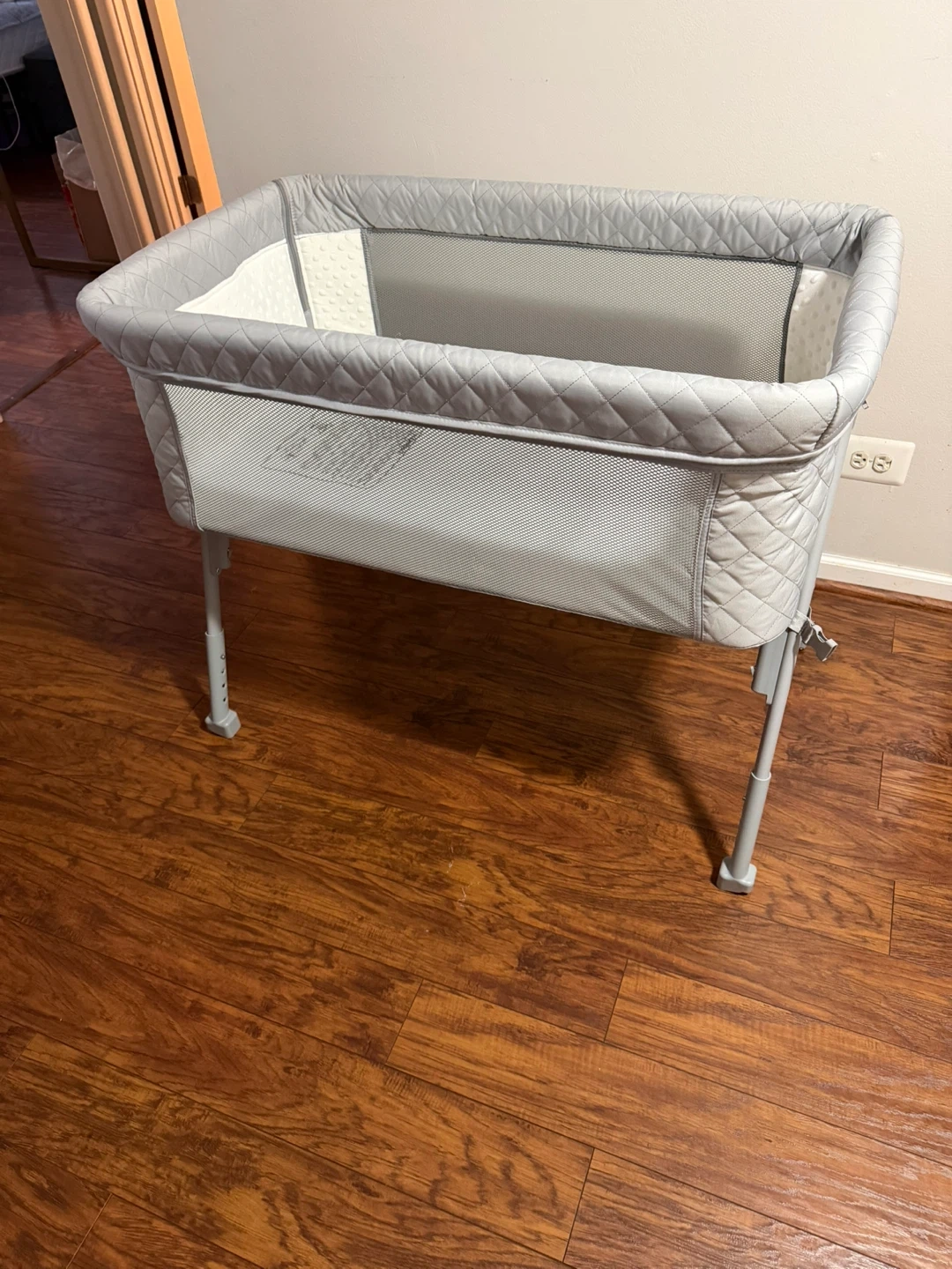 Selling an AirClub Beside Sleeper bassinet in gray! It's in perfect condition and comes with the original packaging and instructions. The bassinet is adjustable in height, making it perfect for bedside use. It's lightweight and portable, so it's easy to move around the house. Used very gently for 3 months. No stains in a pet free and smoke free place.