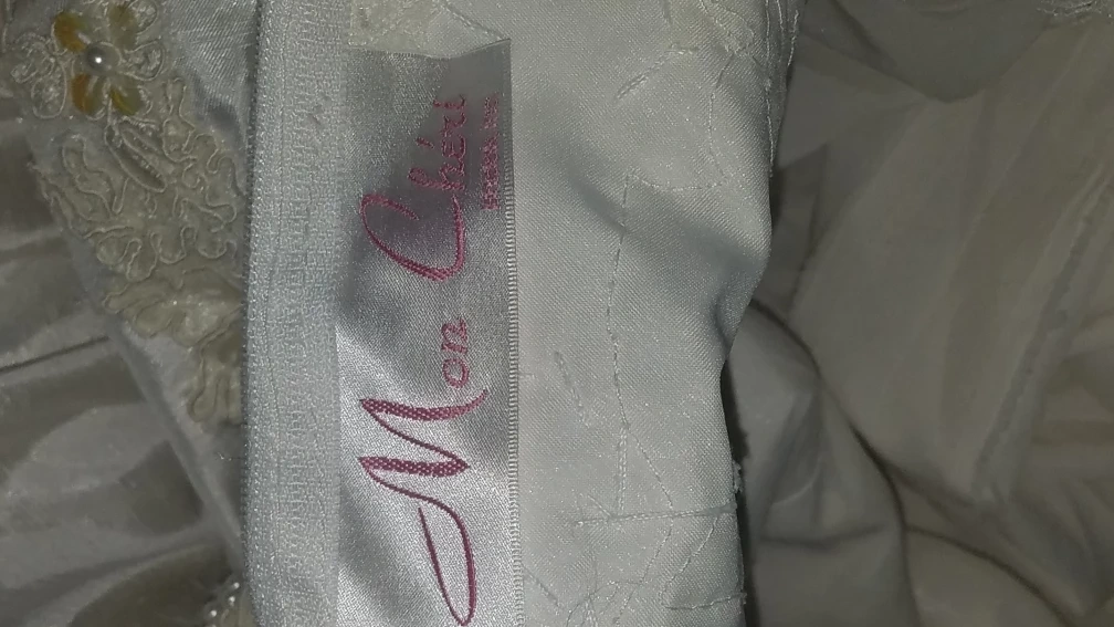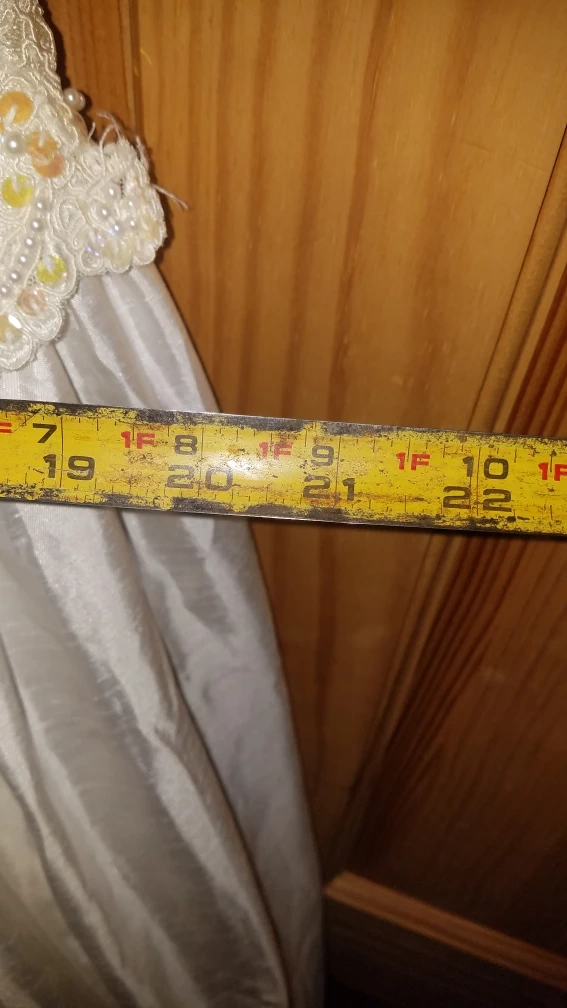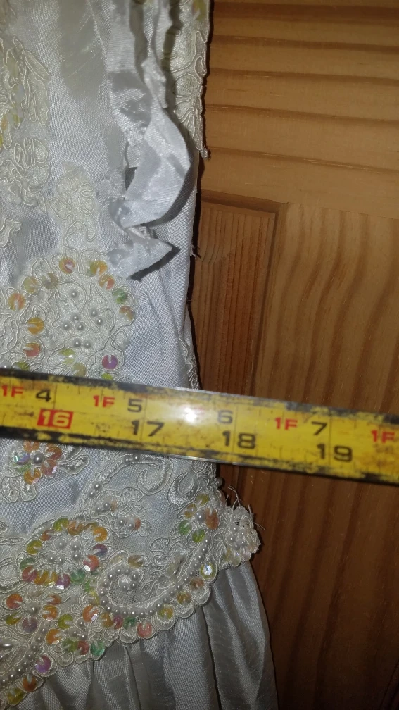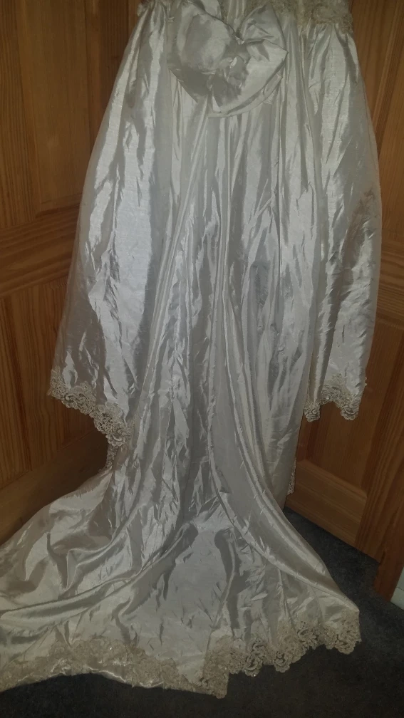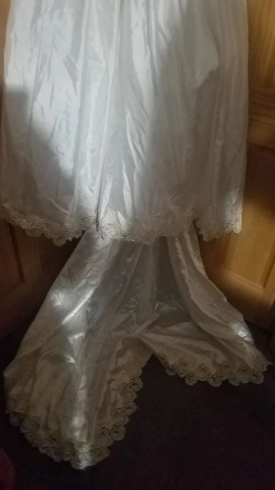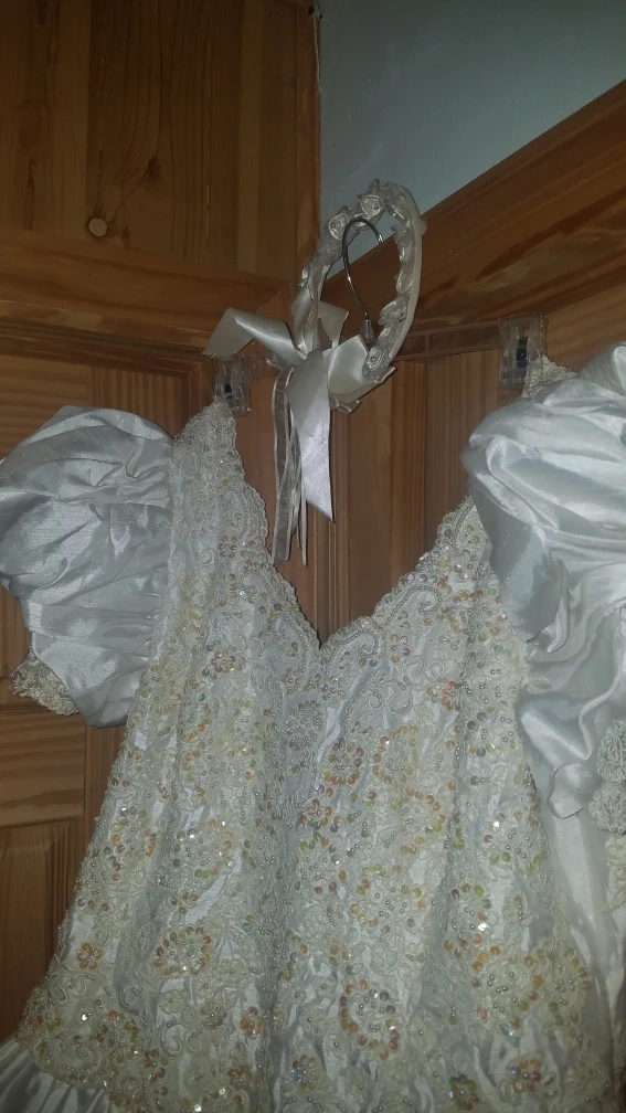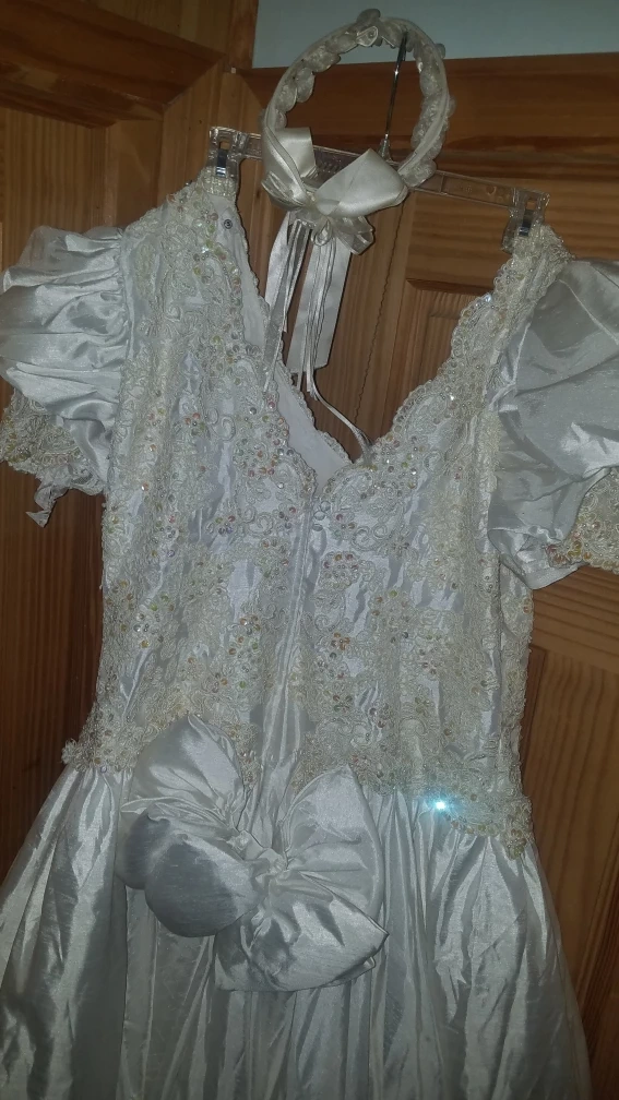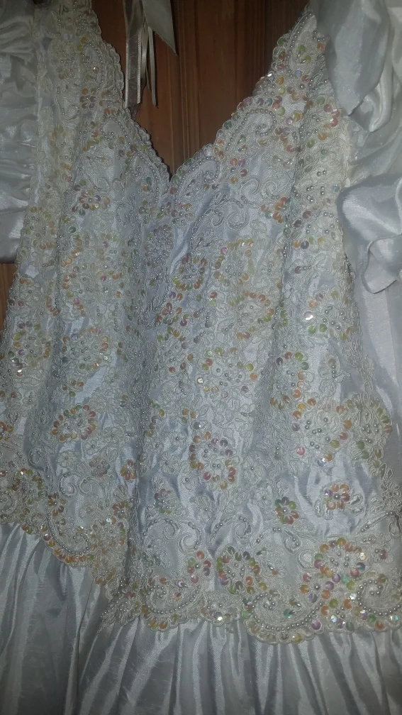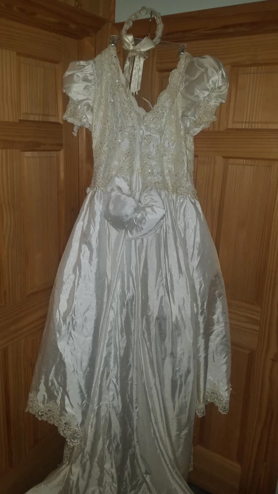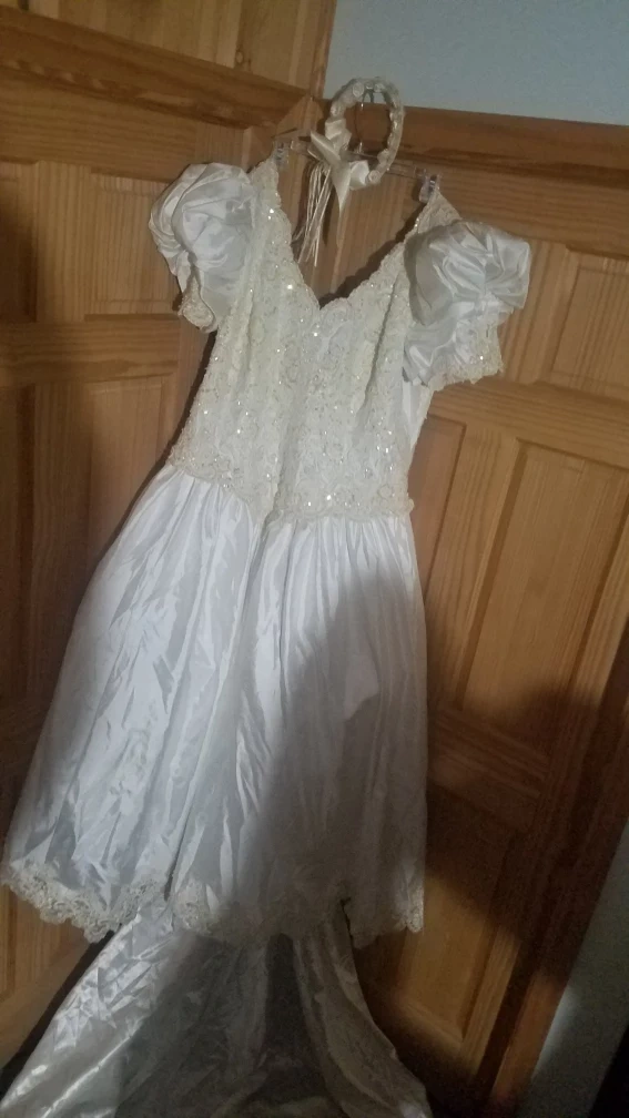 Beautiful vintage wedding dress. Features a v-neck, puff sleeves, and beaded bodice. Long train with lace trim. Size and material unknown.