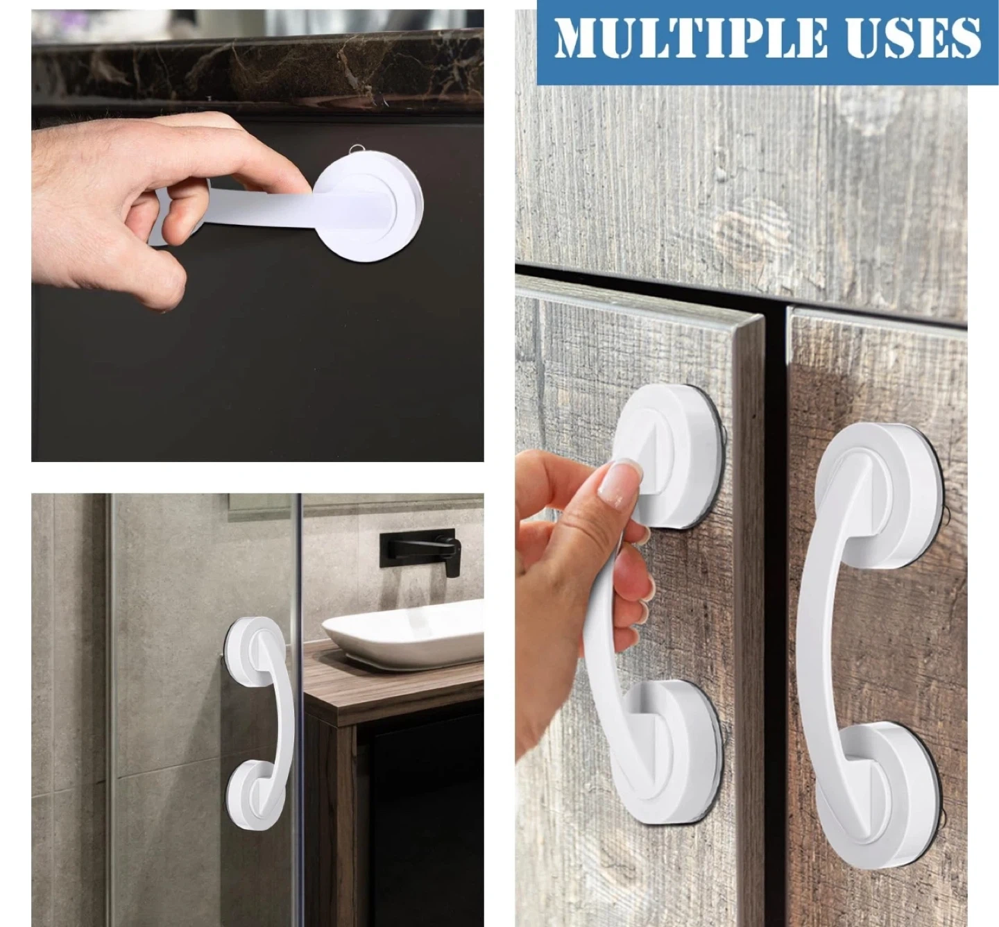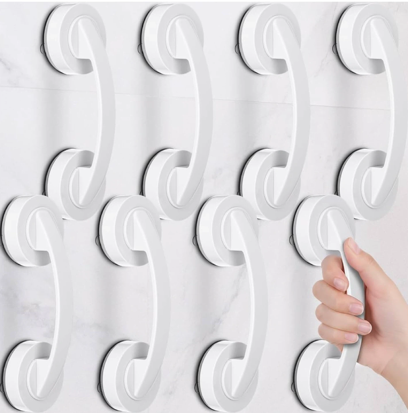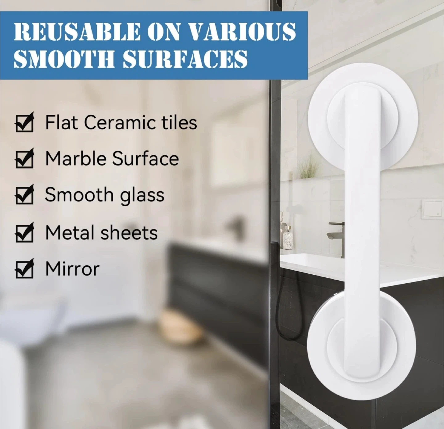 This white suction cup grab bar handle offers easy installation and removal without damage. It's reusable on various smooth surfaces like ceramic tiles, marble, glass, metal sheets, and mirrors. The non-slip handle is ergonomically designed for safety and reliability. Its push-lock buckle allows for one-step, easy installation.