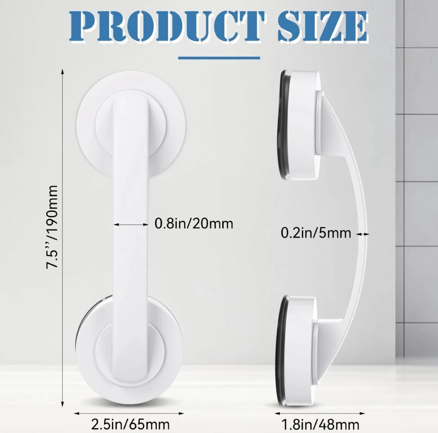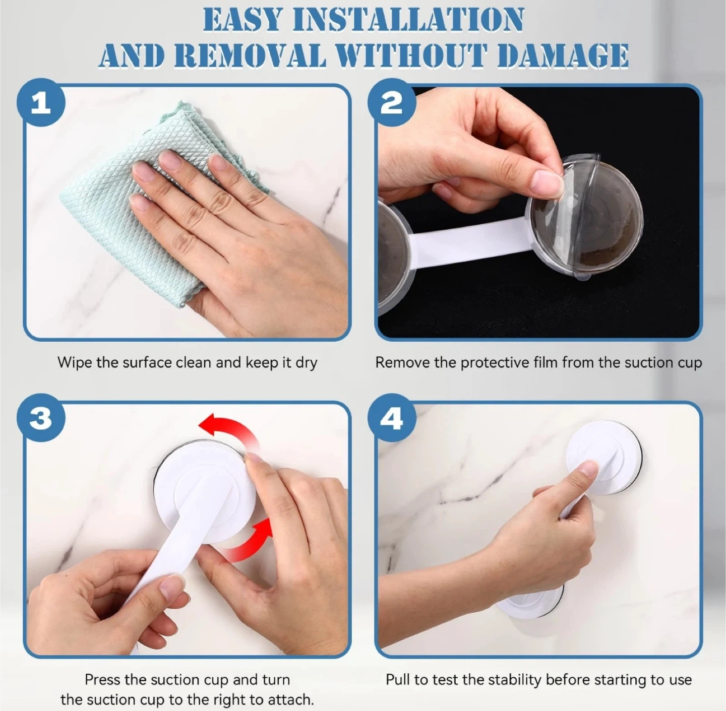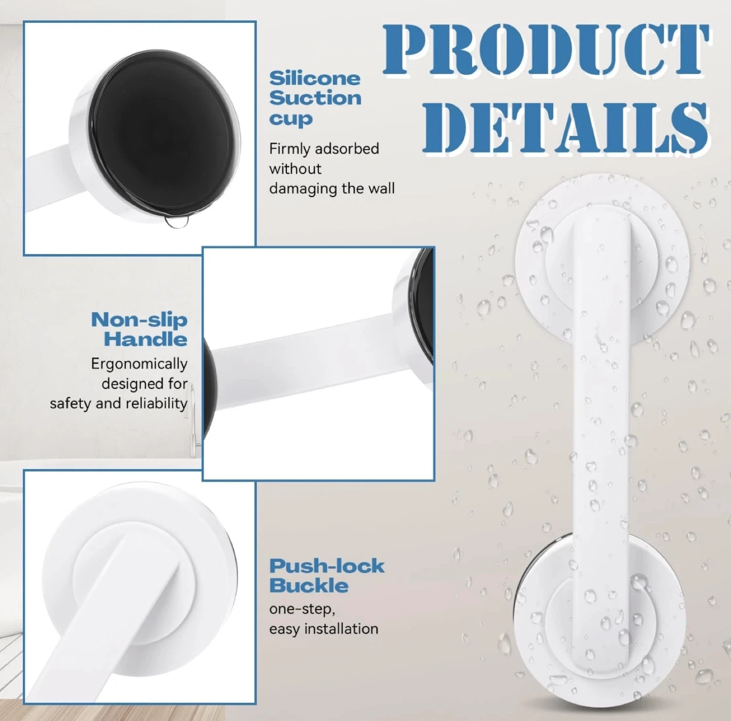 This white suction cup grab bar handle offers easy installation and removal without damage. It's reusable on various smooth surfaces like ceramic tiles, marble, glass, metal sheets, and mirrors. The non-slip handle is ergonomically designed for safety and reliability. Its push-lock buckle allows for one-step, easy installation.