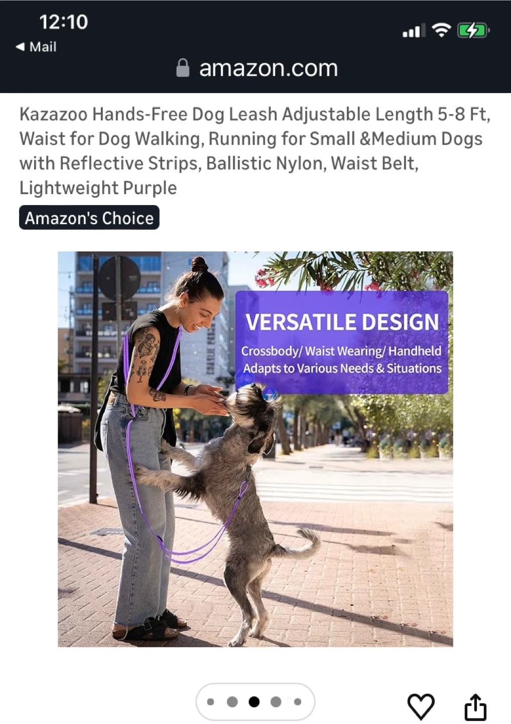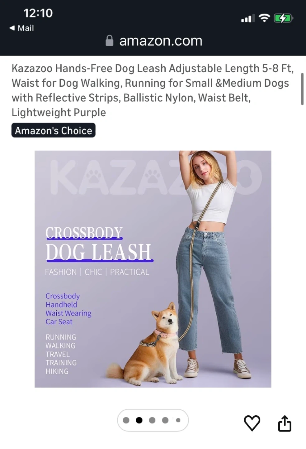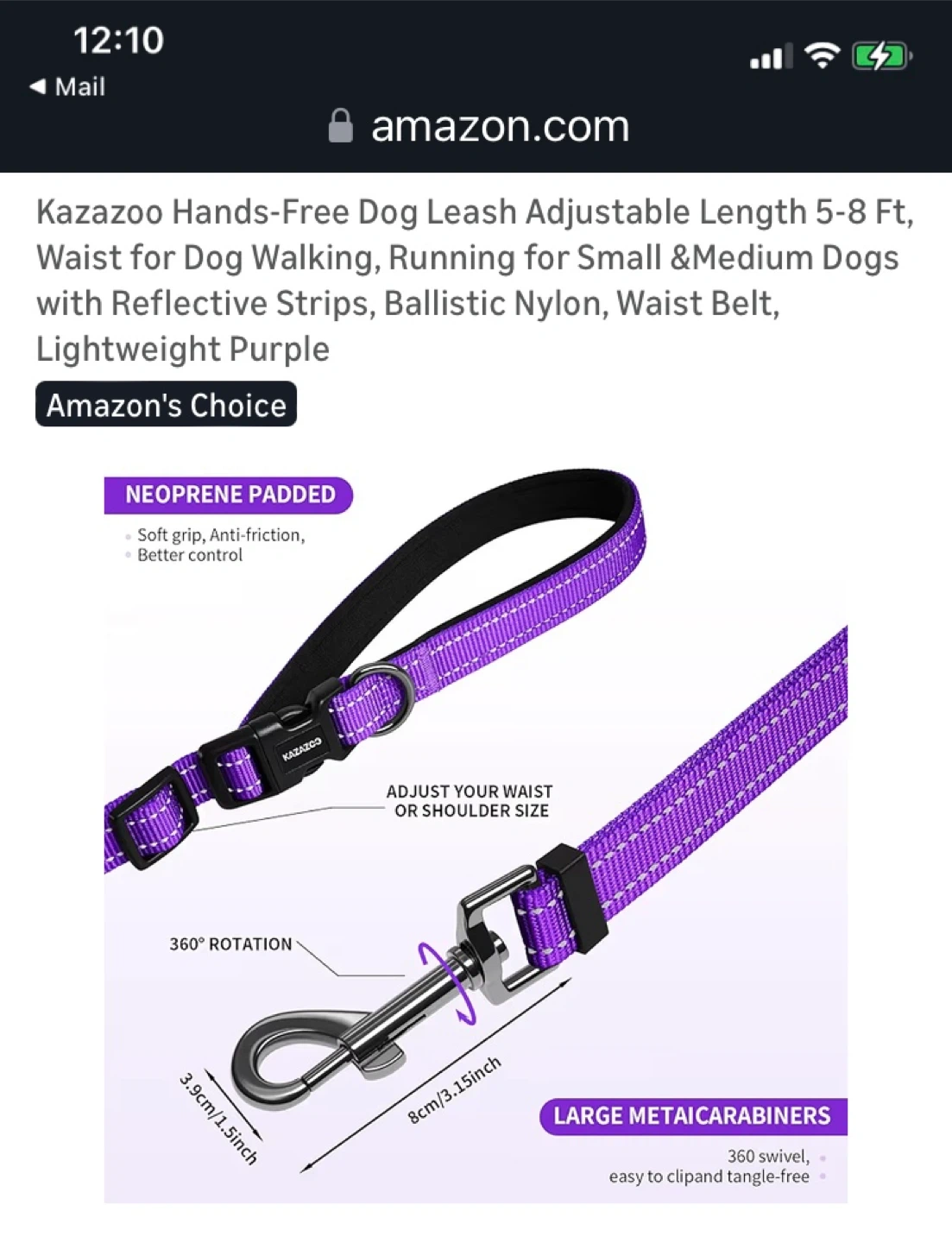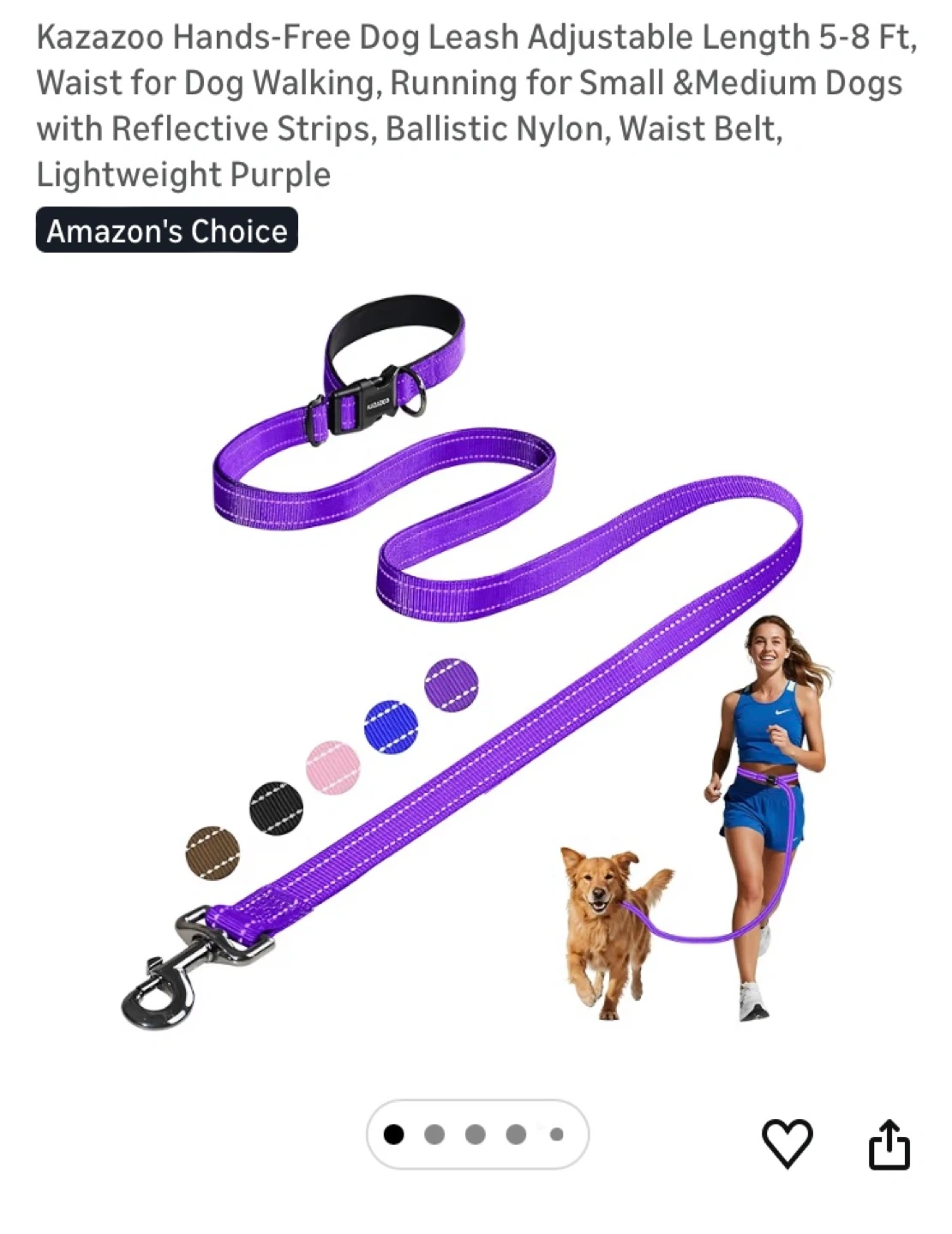 This Kazazoo hands-free dog leash is made from durable, lightweight purple nylon. It's adjustable from 5-8 ft and features reflective strips for visibility. The leash is designed for small to medium dogs and includes a comfortable waist belt for walking or running.