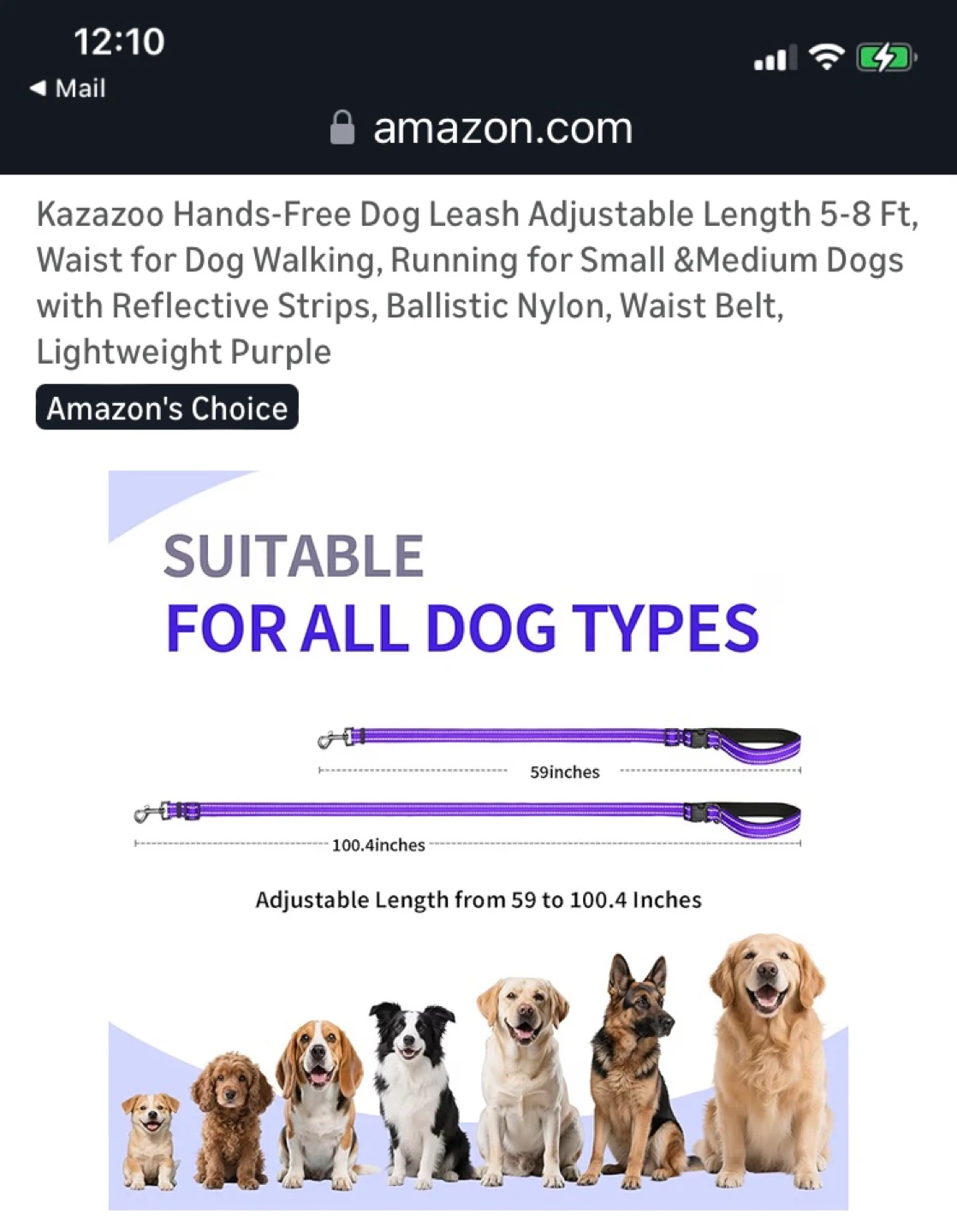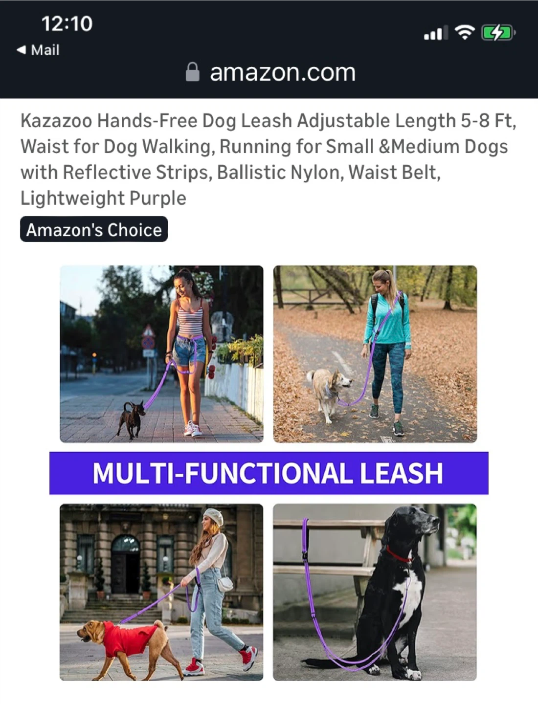 This Kazazoo hands-free dog leash is made from durable, lightweight purple nylon. It's adjustable from 5-8 ft and features reflective strips for visibility. The leash is designed for small to medium dogs and includes a comfortable waist belt for walking or running.