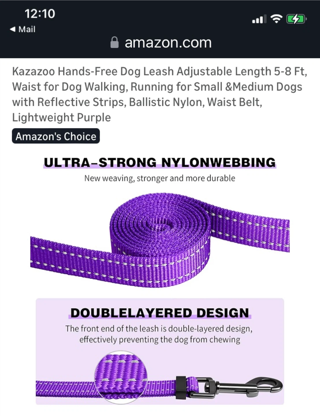 Kazazoo Hands-Free Dog Leash - Adjustable Purple Nylon