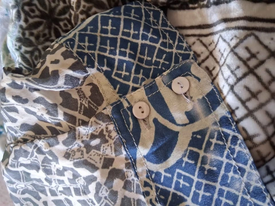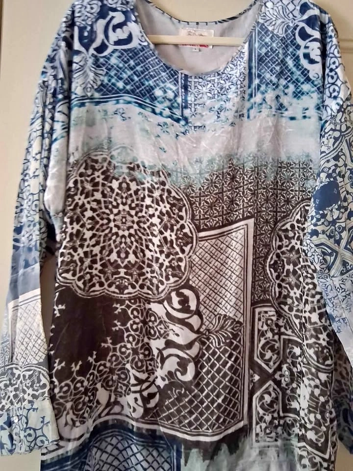 This beautiful top is light and dark blues and grey. It is lined and oversized. PTP is 28. Very light and breezy! LOCKPORT