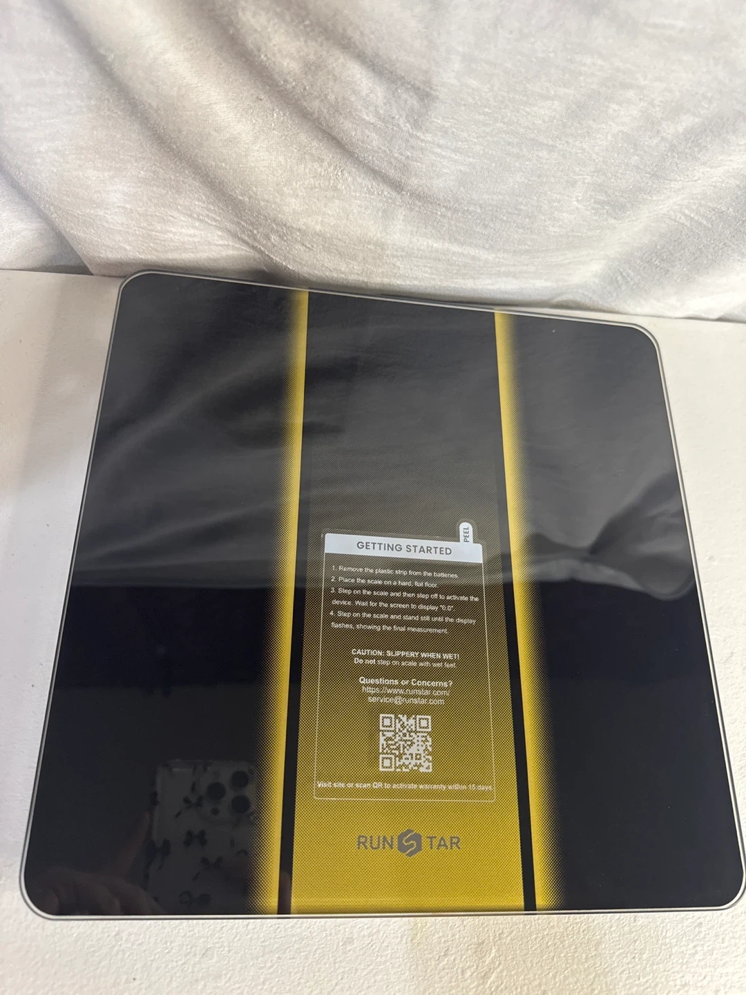 This Run Star digital weight scale features a 6mm tempered glass platform. It has a weight capacity of 400 lb / 180 kg / 28 st. Increments are 0.1 lb / 50 g.