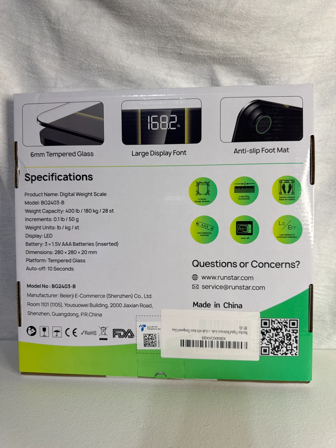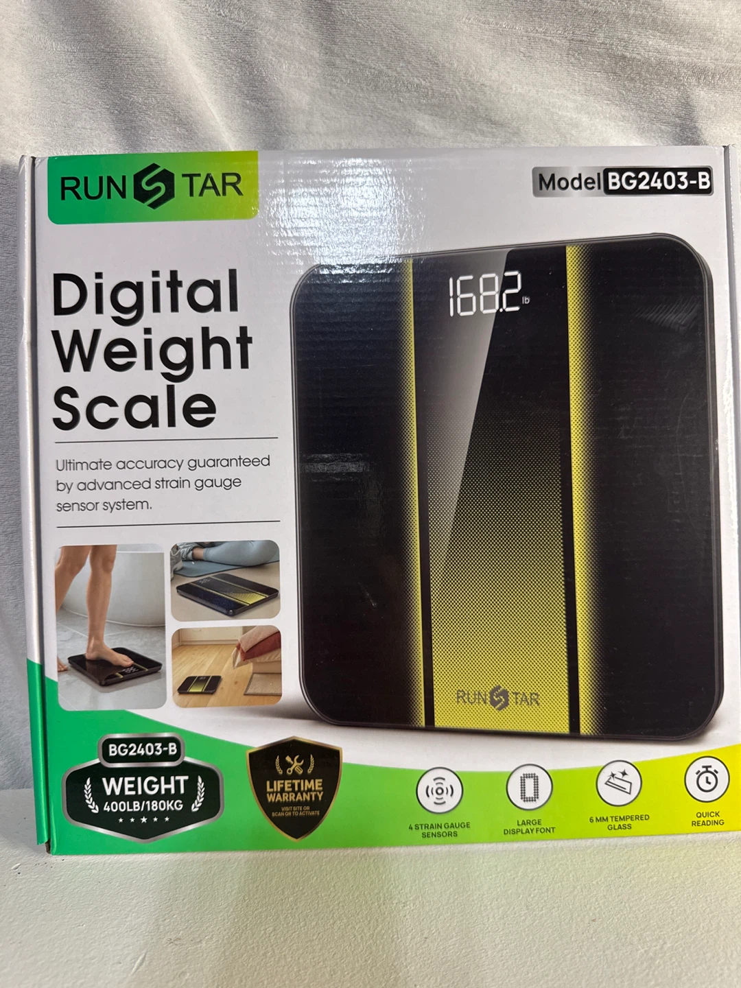 This Run Star digital weight scale features a 6mm tempered glass platform. It has a weight capacity of 400 lb / 180 kg / 28 st. Increments are 0.1 lb / 50 g.