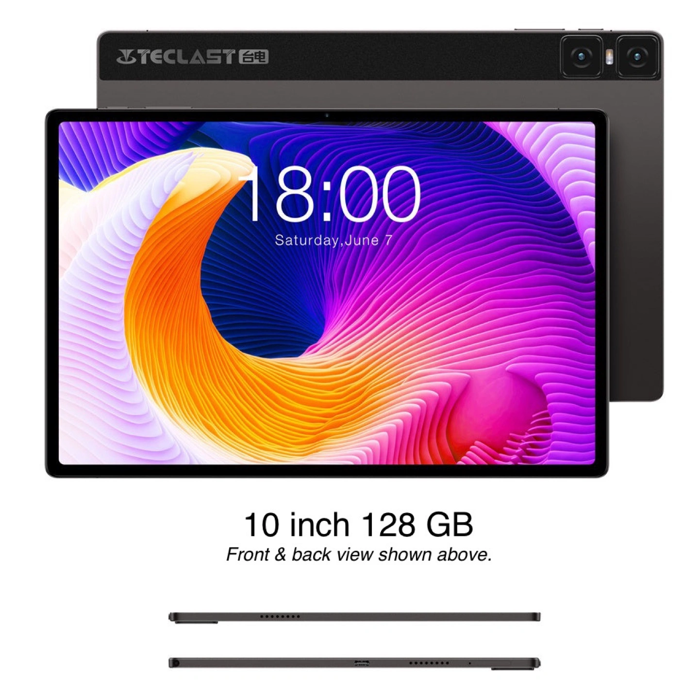 10 inch Android tablet. 128 GB storage. Dual rear cameras. Gray color.