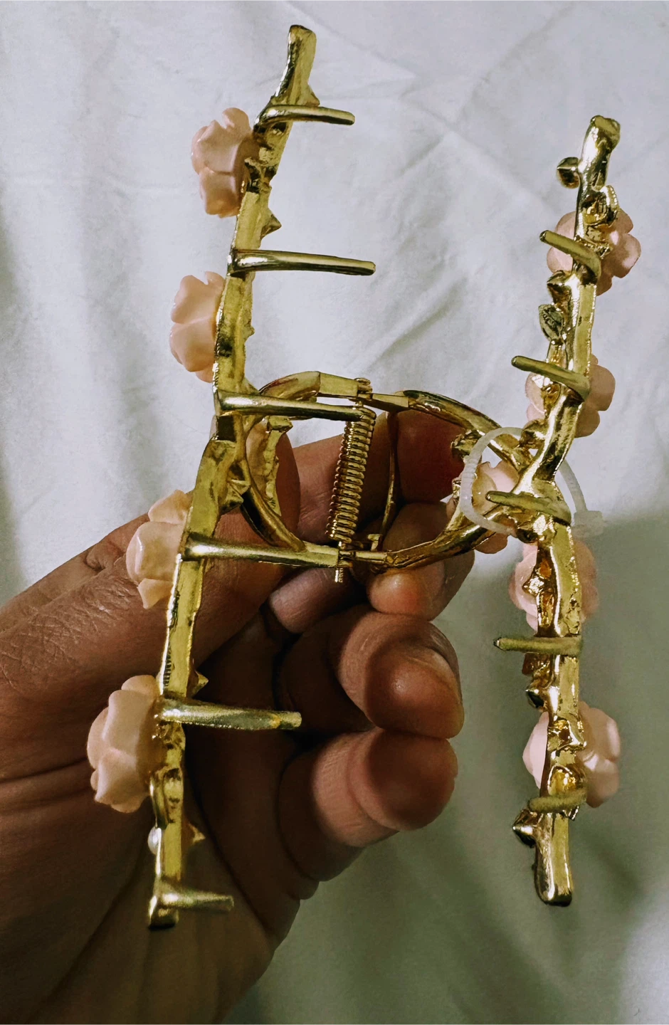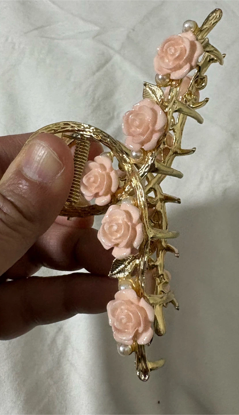 This stylish claw clip features a gold-tone metal design adorned with delicate pink rose accents and small pearl details. It's perfect for securing updos or adding a decorative touch to your hairstyle. The clip's strong spring mechanism ensures a secure hold.
