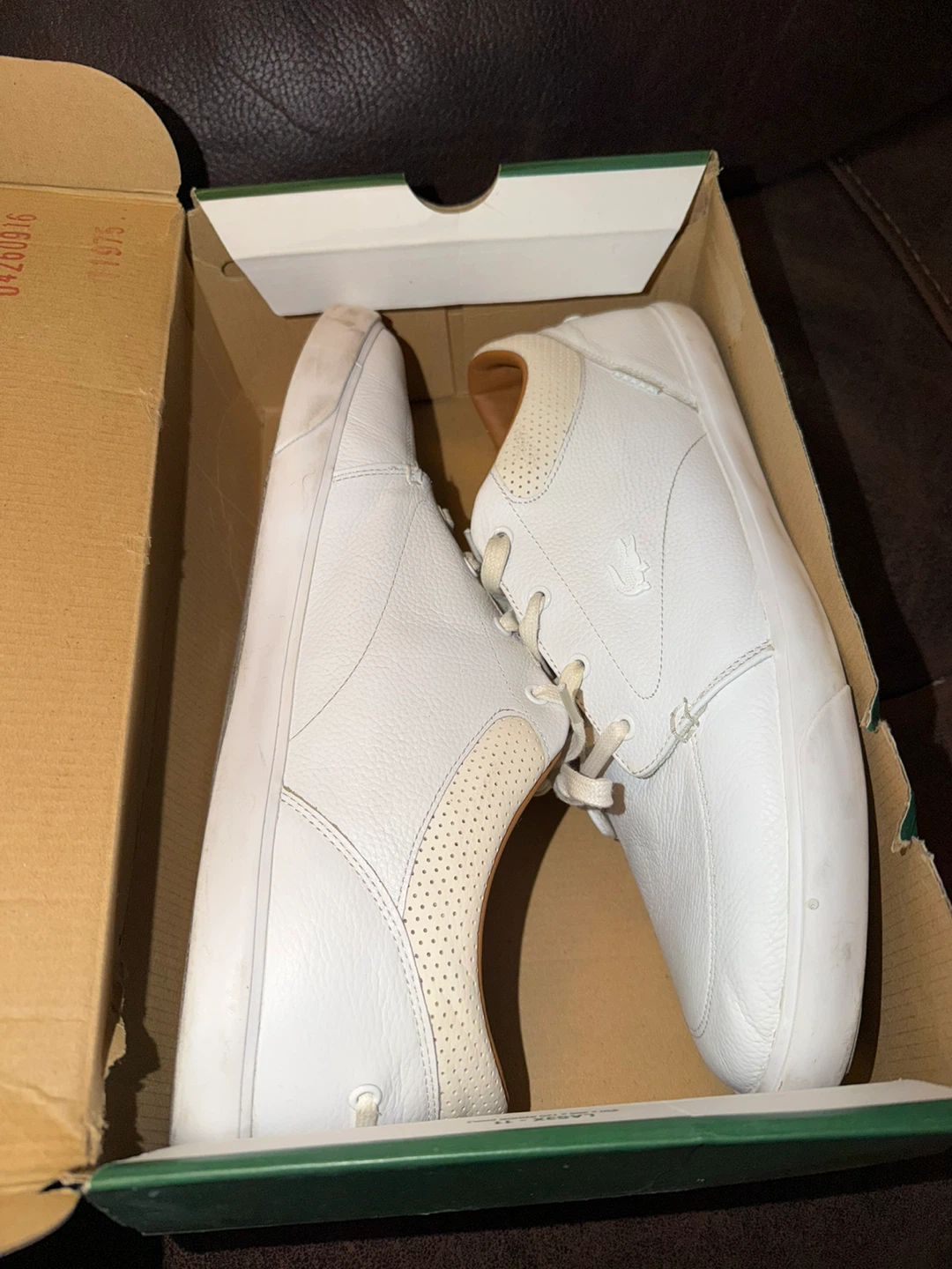 These are white leather sneakers from Lacoste. They feature a perforated detail on the heel and a classic lace-up closure. Includes original box.