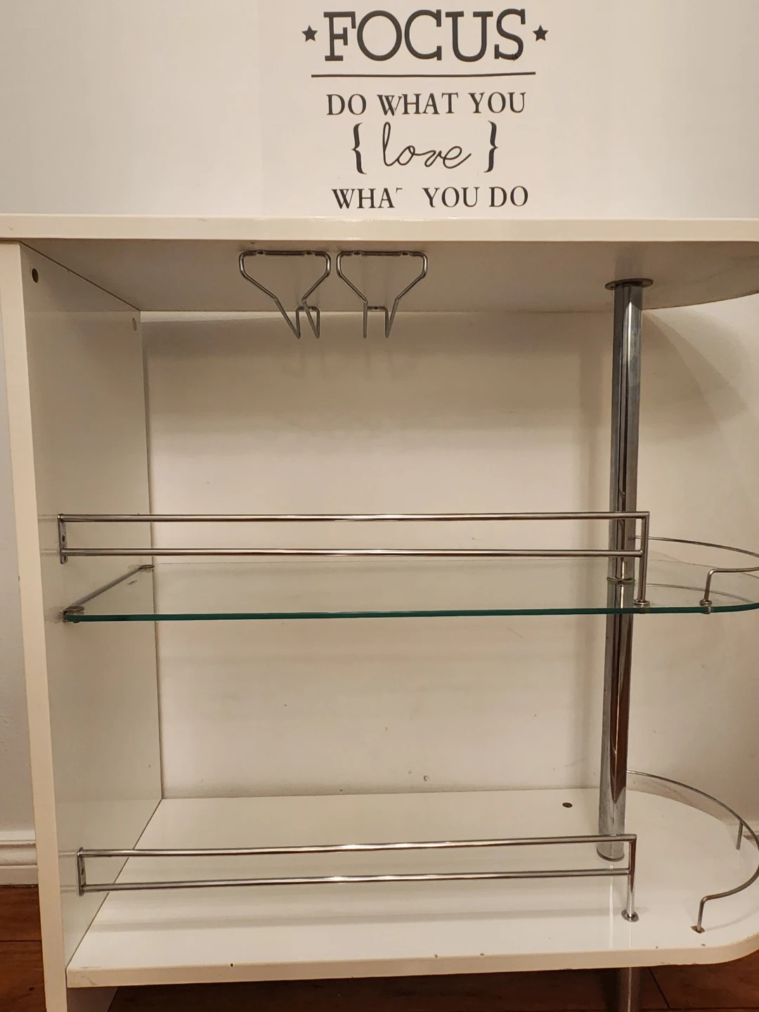 This white bar cart features two glass shelves and a chrome support pole. It includes a rack for hanging wine glasses. Great for entertaining!