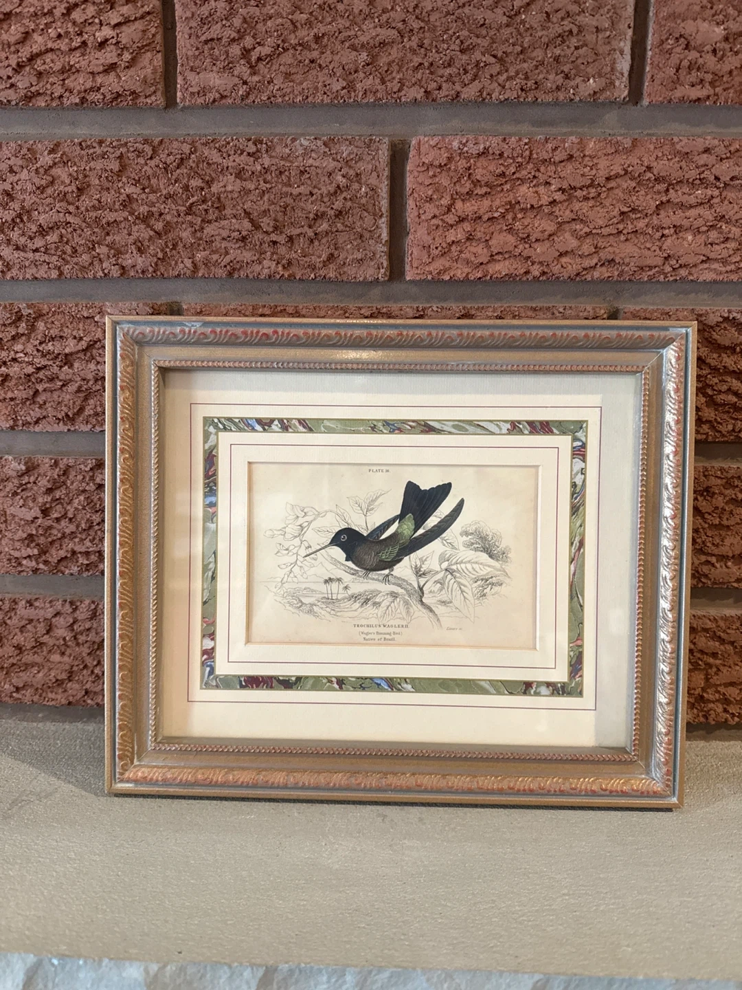This artwork shows a detailed illustration of the hummingbird with its distinctive features. It's matted with a marbleized border and ready to hang.