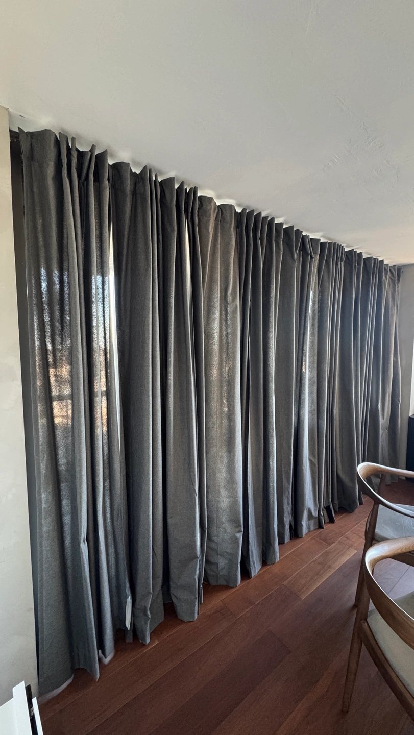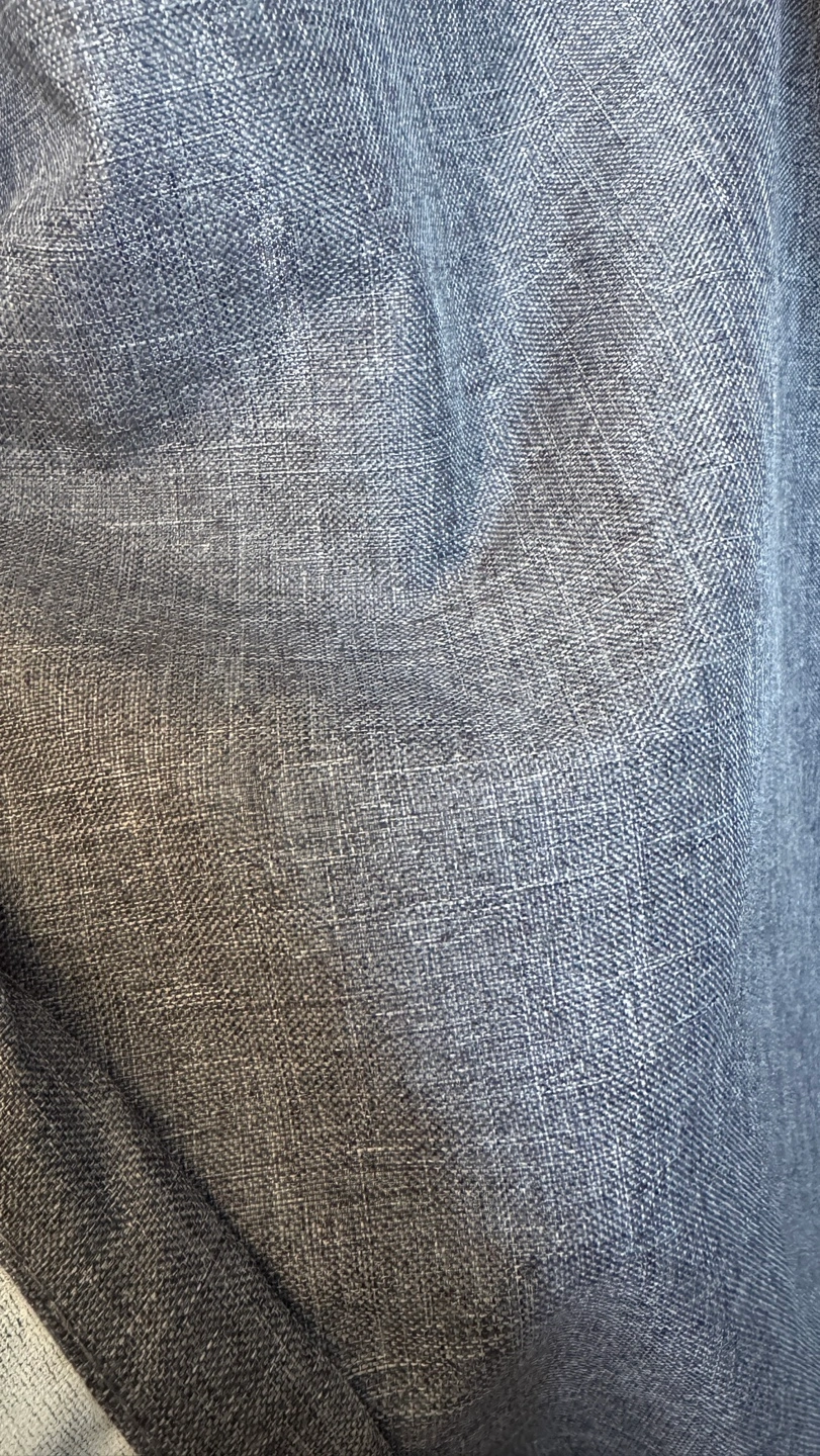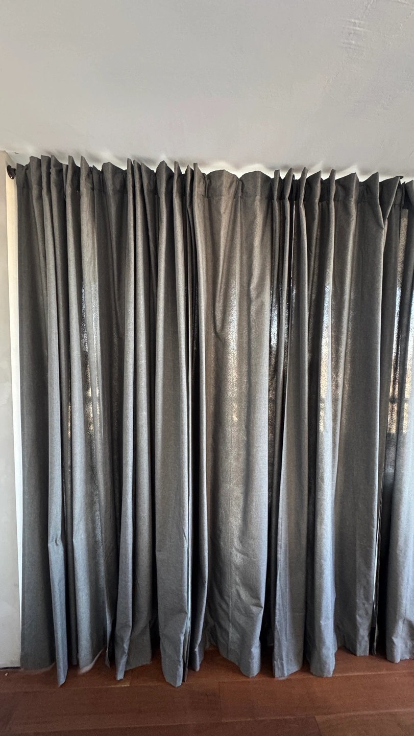 Set of long dark gray curtains. Linen blend fabric. Good condition. Rod pocket design. Adds a touch of elegance to any room.