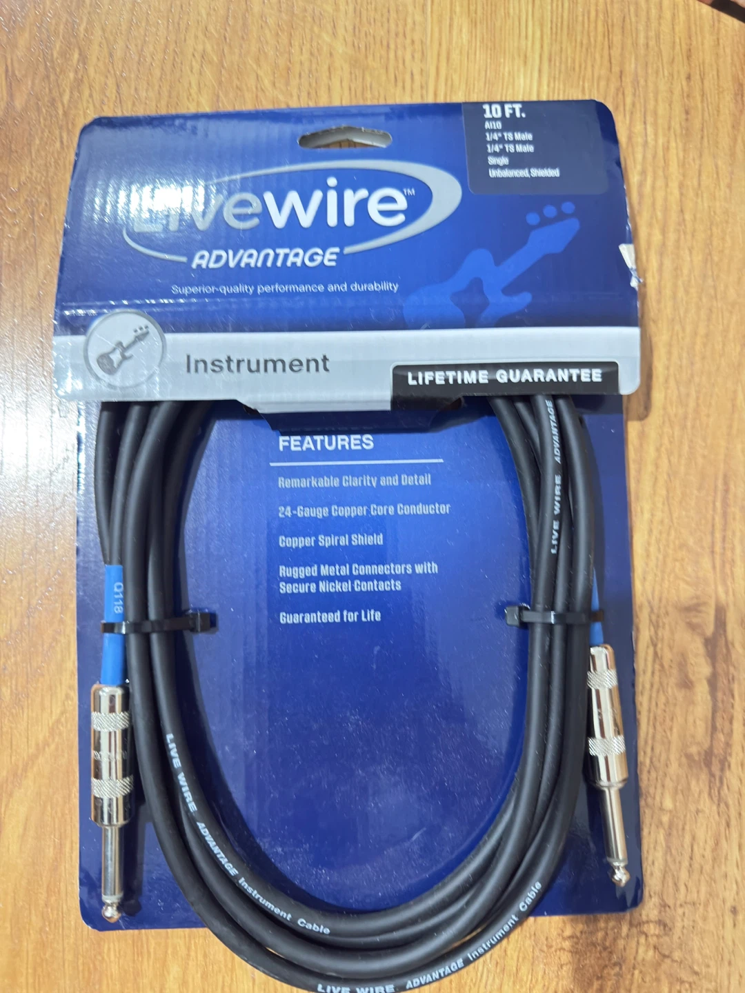Selling a Live Wire Advantage instrument cable, 10 ft long. It has remarkable clarity and detail with a 24-Gauge Copper Core Conductor and Copper Spiral Shield. It also has Rugged Metal Connectors with Secure Nickel Contacts. It's guaranteed for life!