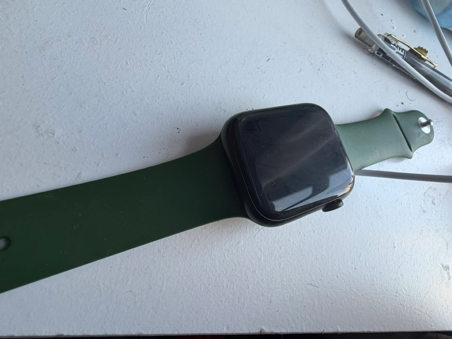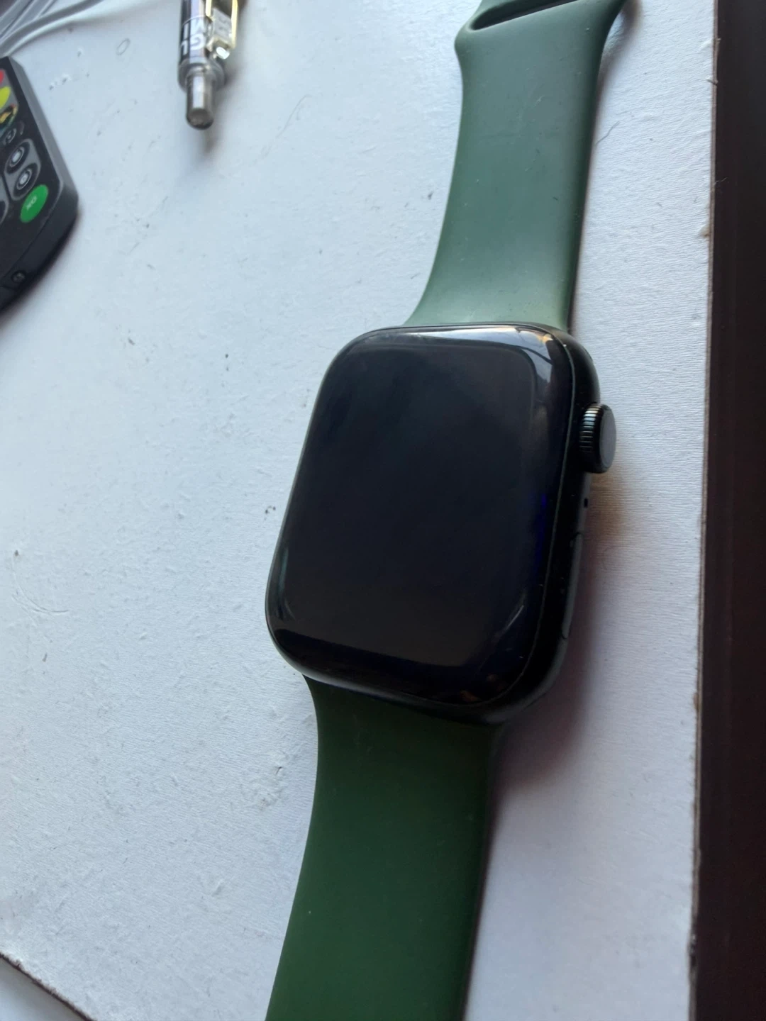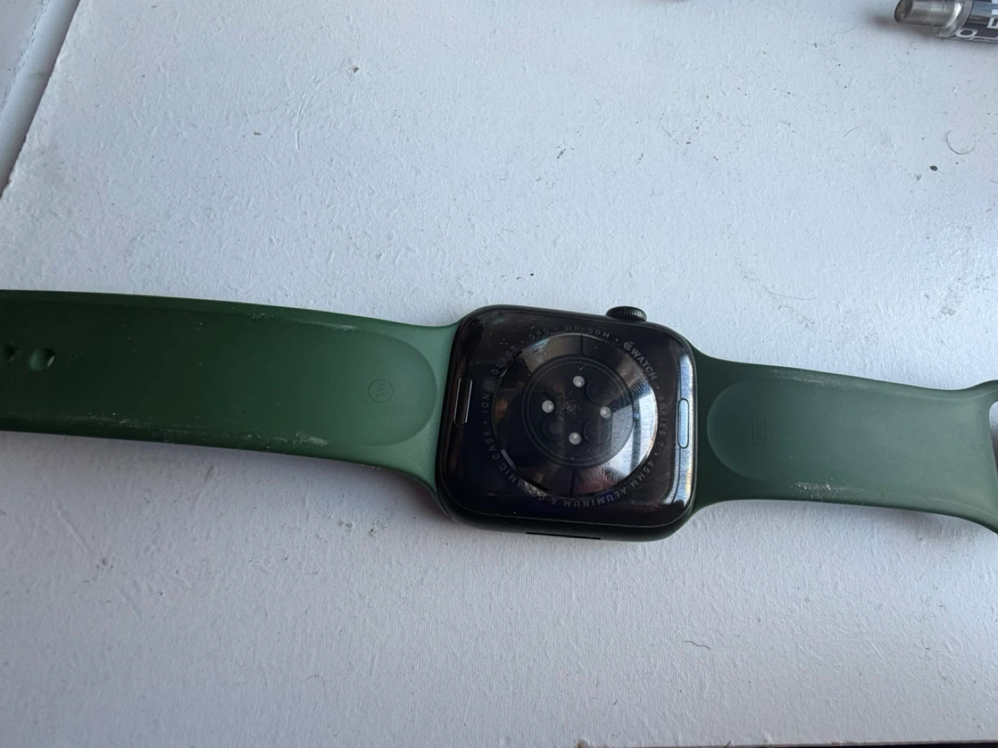 This is an Apple Watch Series 7 with GPS connectivity. It features a 45mm case size and comes with a green sport band. The watch body is aluminum.