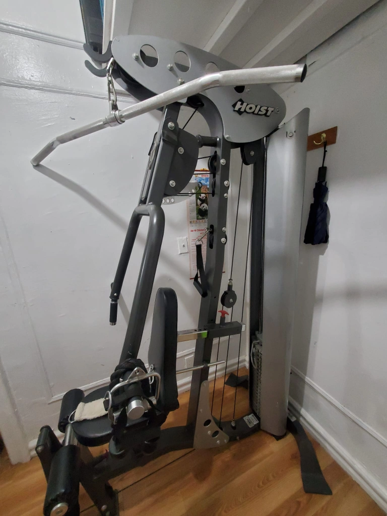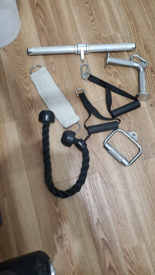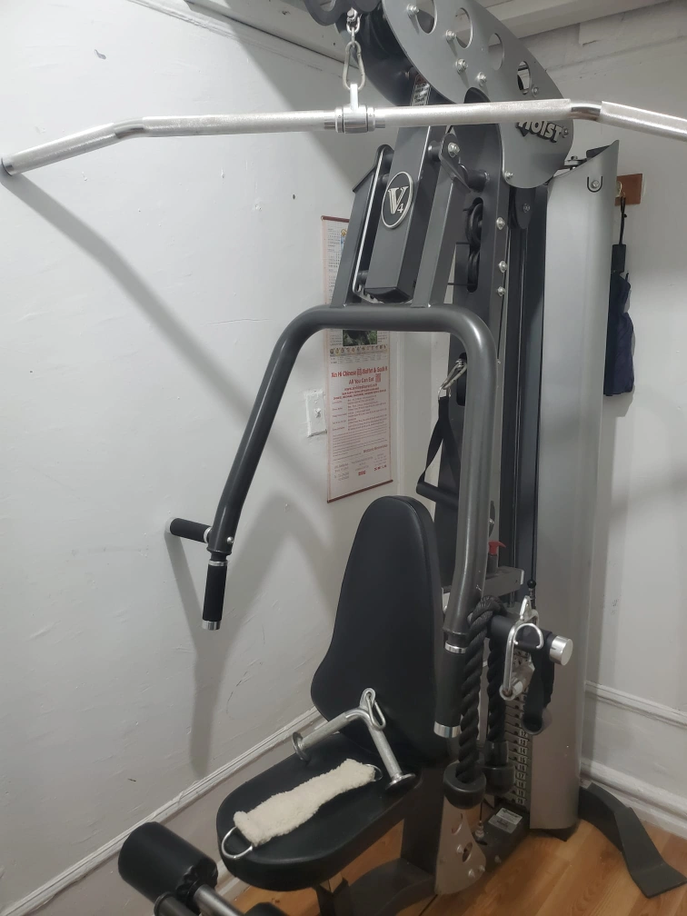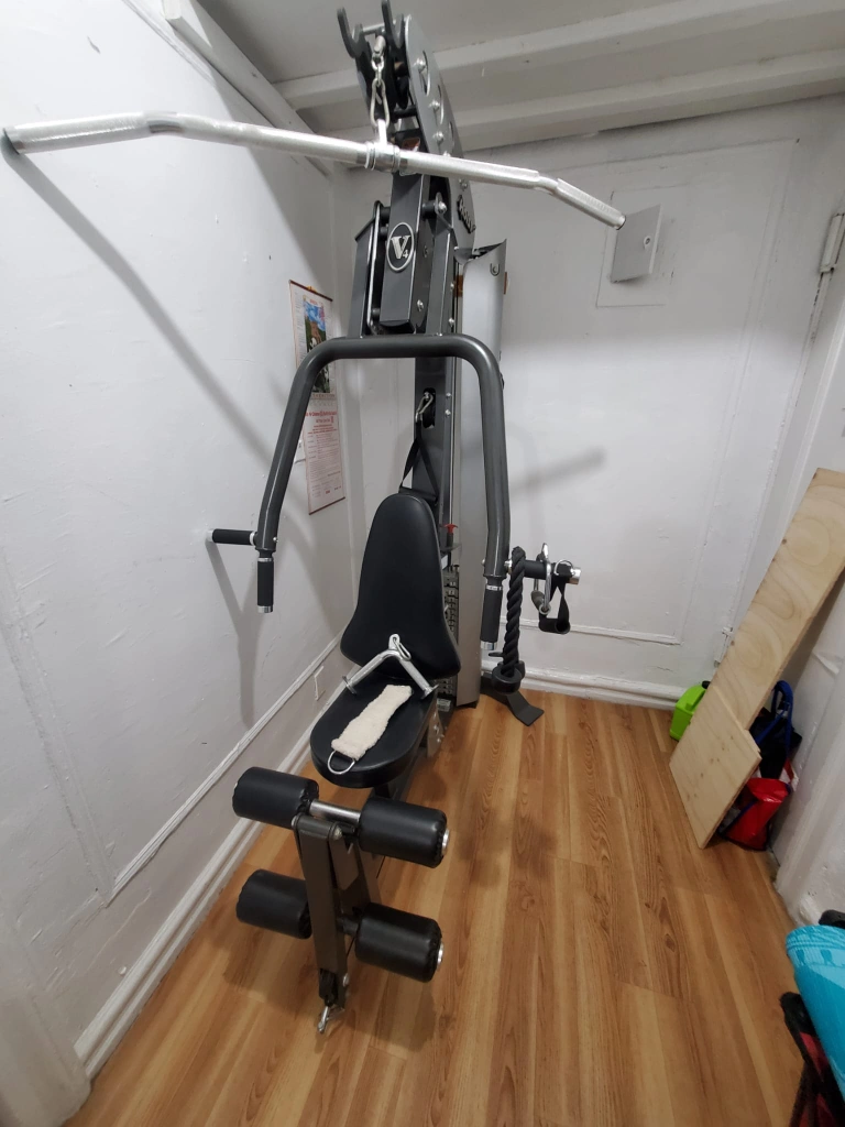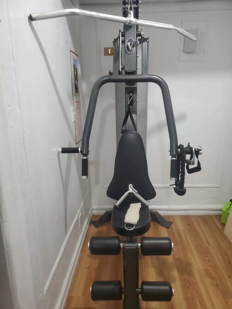 Selling a V home gym. It has a black seat and comes with various attachments as pictured. Great for a home workout!
