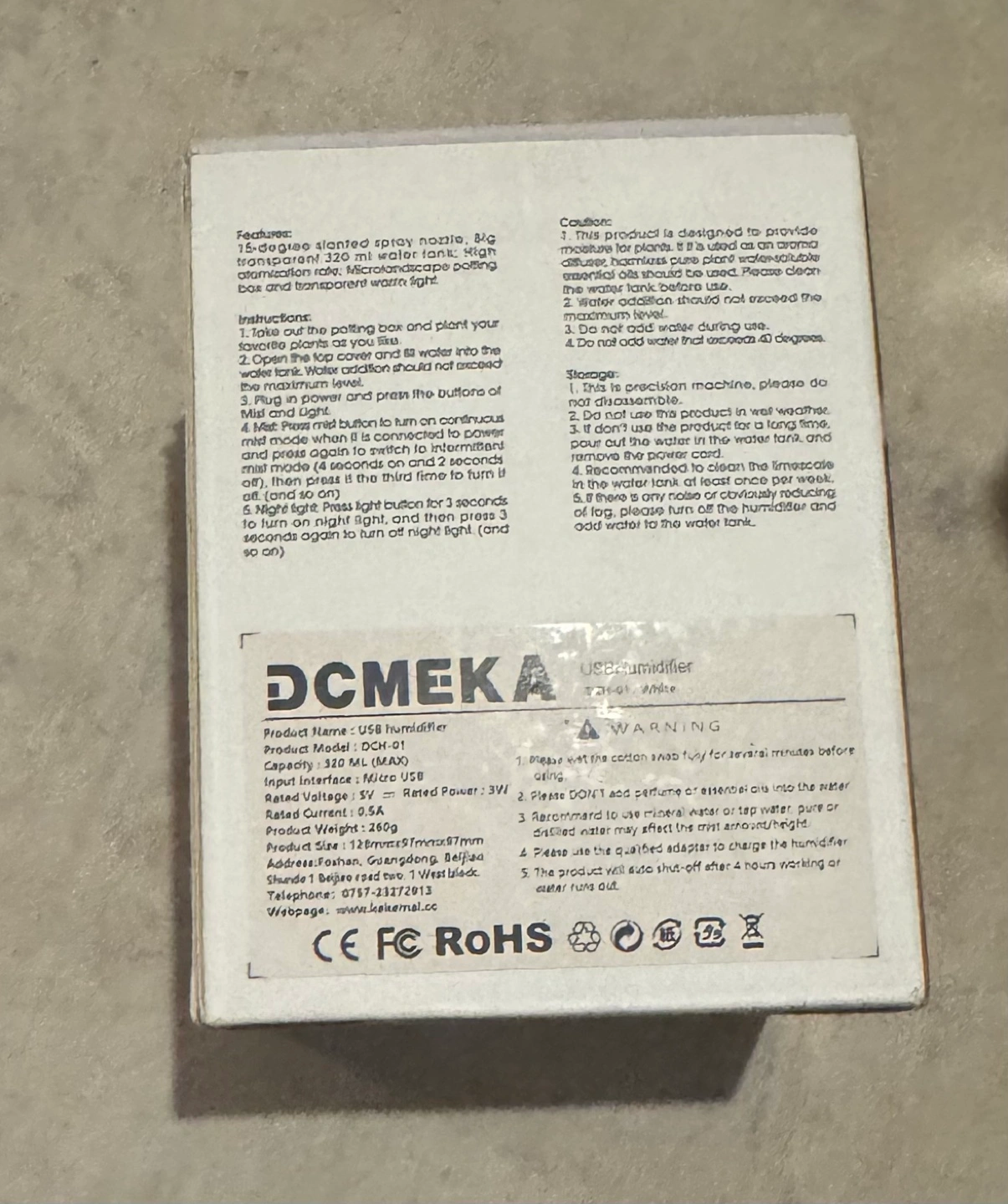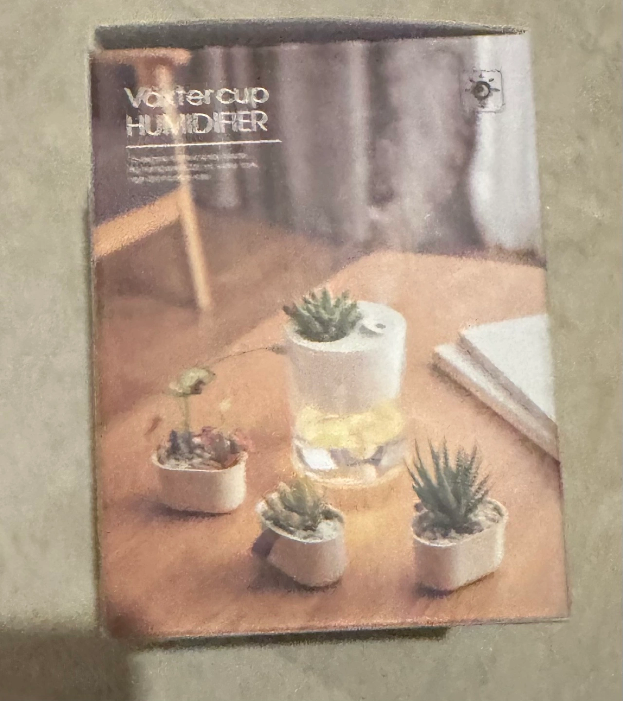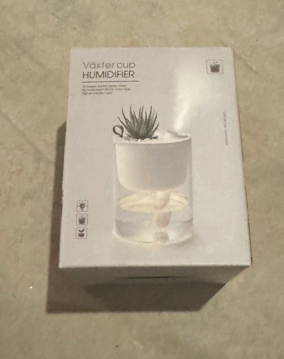 52Mini humidifier. 320 ml water tank. Slanted spray nozzle. Night light. Includes small decorative pots.