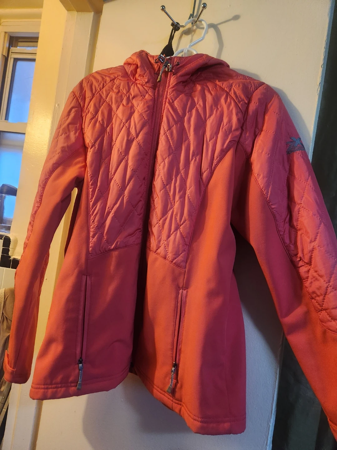 Claiborne microfiber jacket with a quilted front and sleeves. This coral pink jacket is size L. Made in Vietnam.