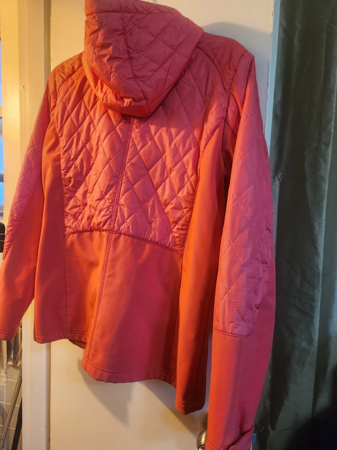 Claiborne microfiber jacket with a quilted front and sleeves. This coral pink jacket is size L. Made in Vietnam.