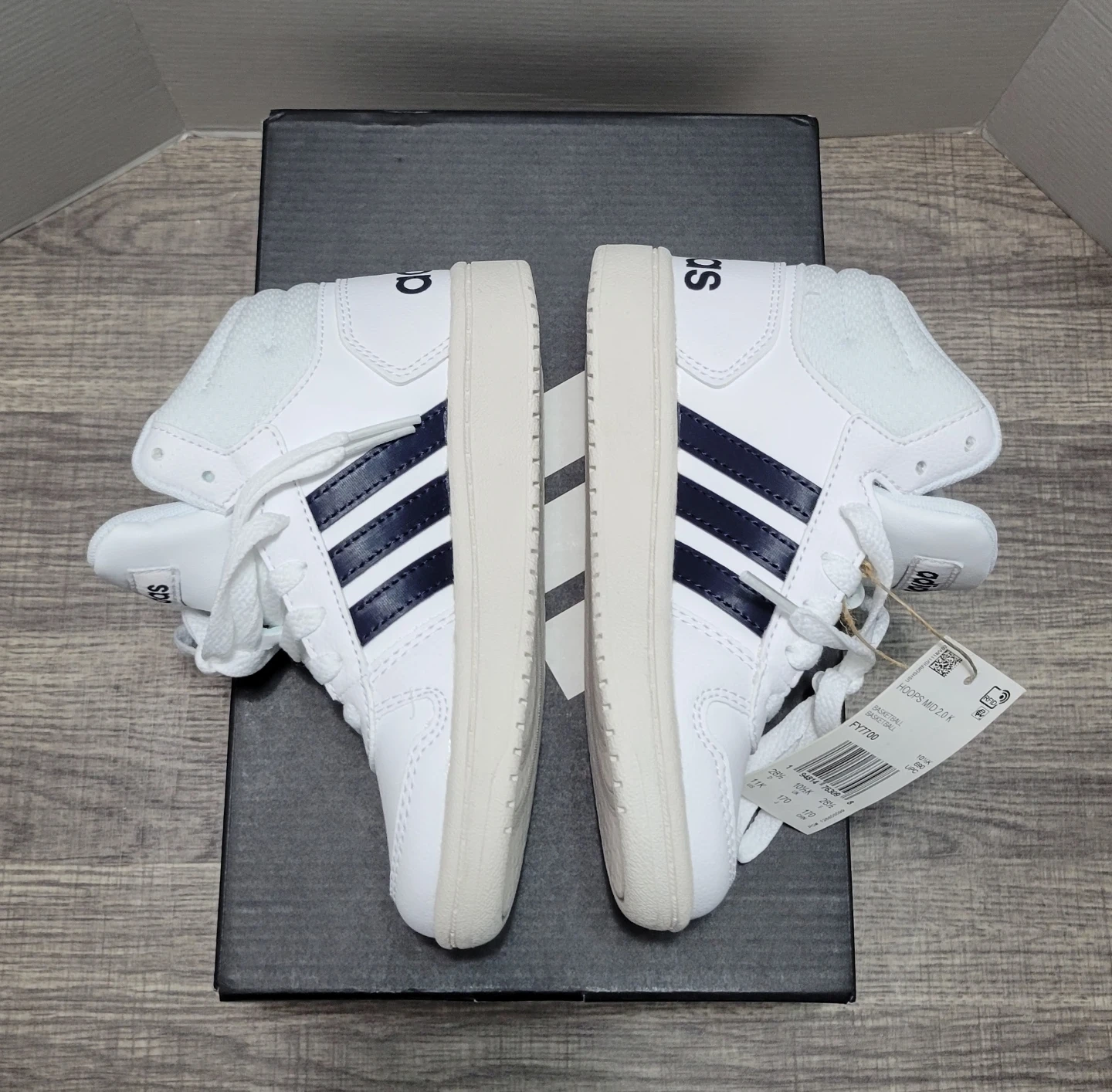 White Adidas high top sneakers for boys. Features classic three-stripe design and lace-up closure. Includes original box.