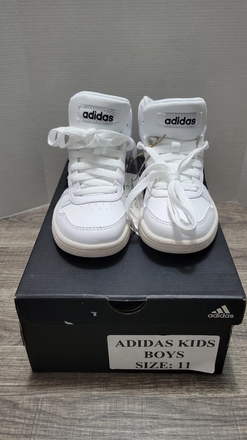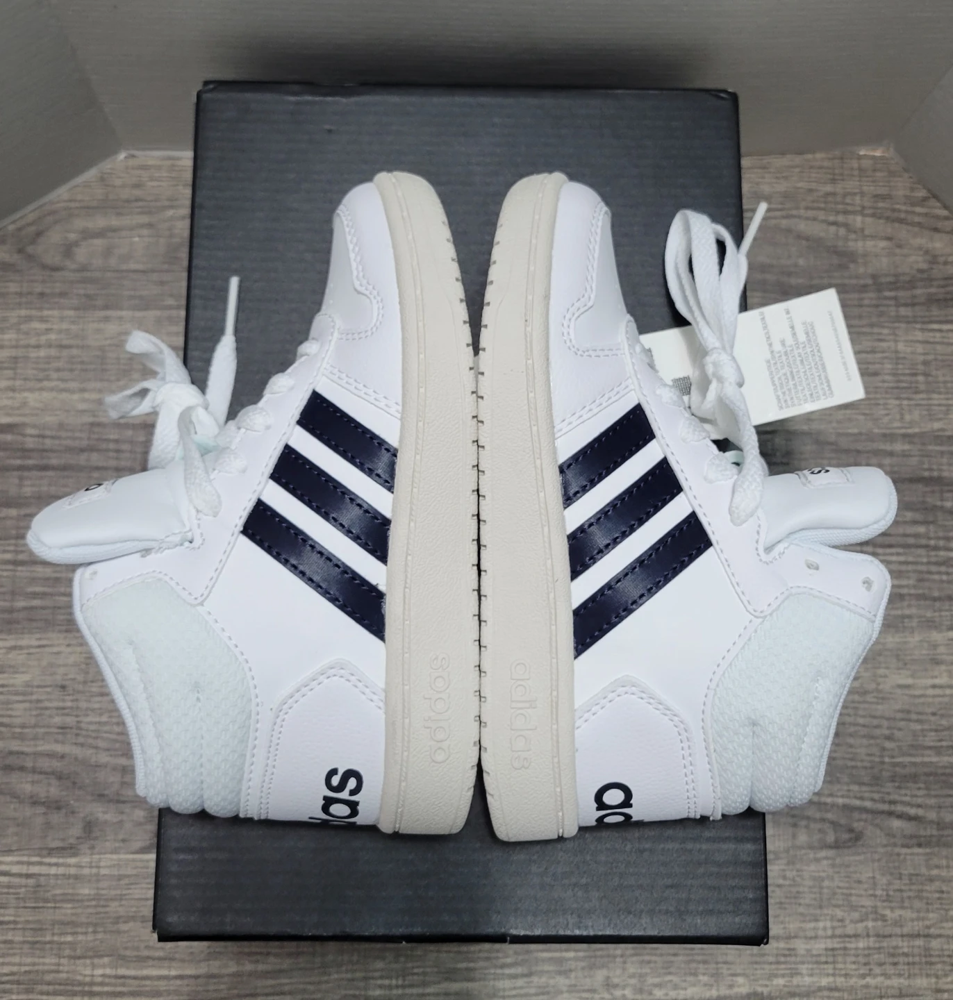White Adidas high top sneakers for boys. Features classic three-stripe design and lace-up closure. Includes original box.