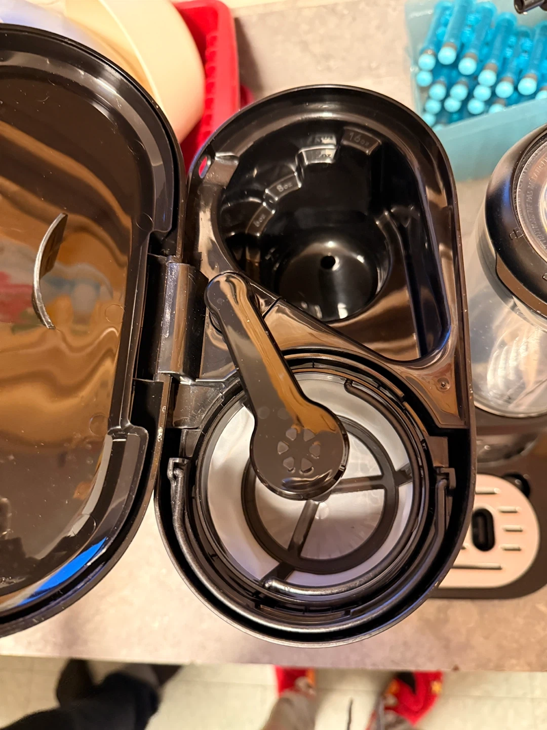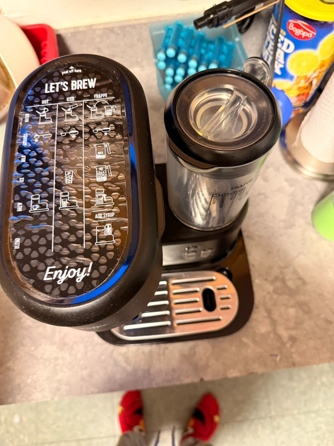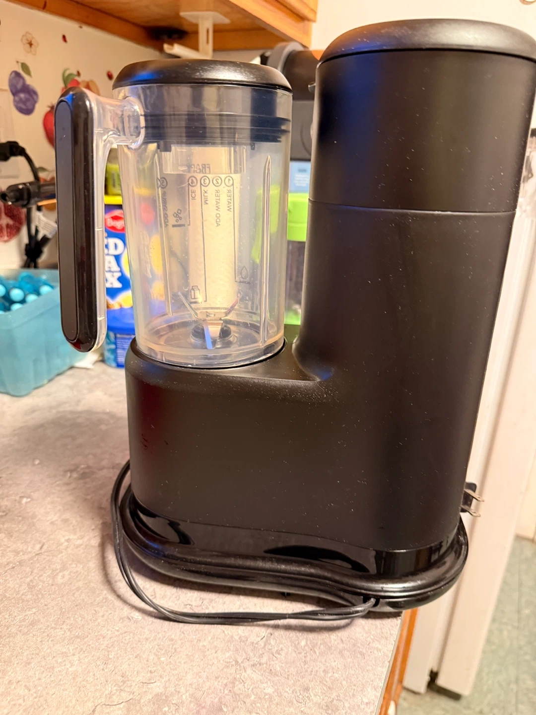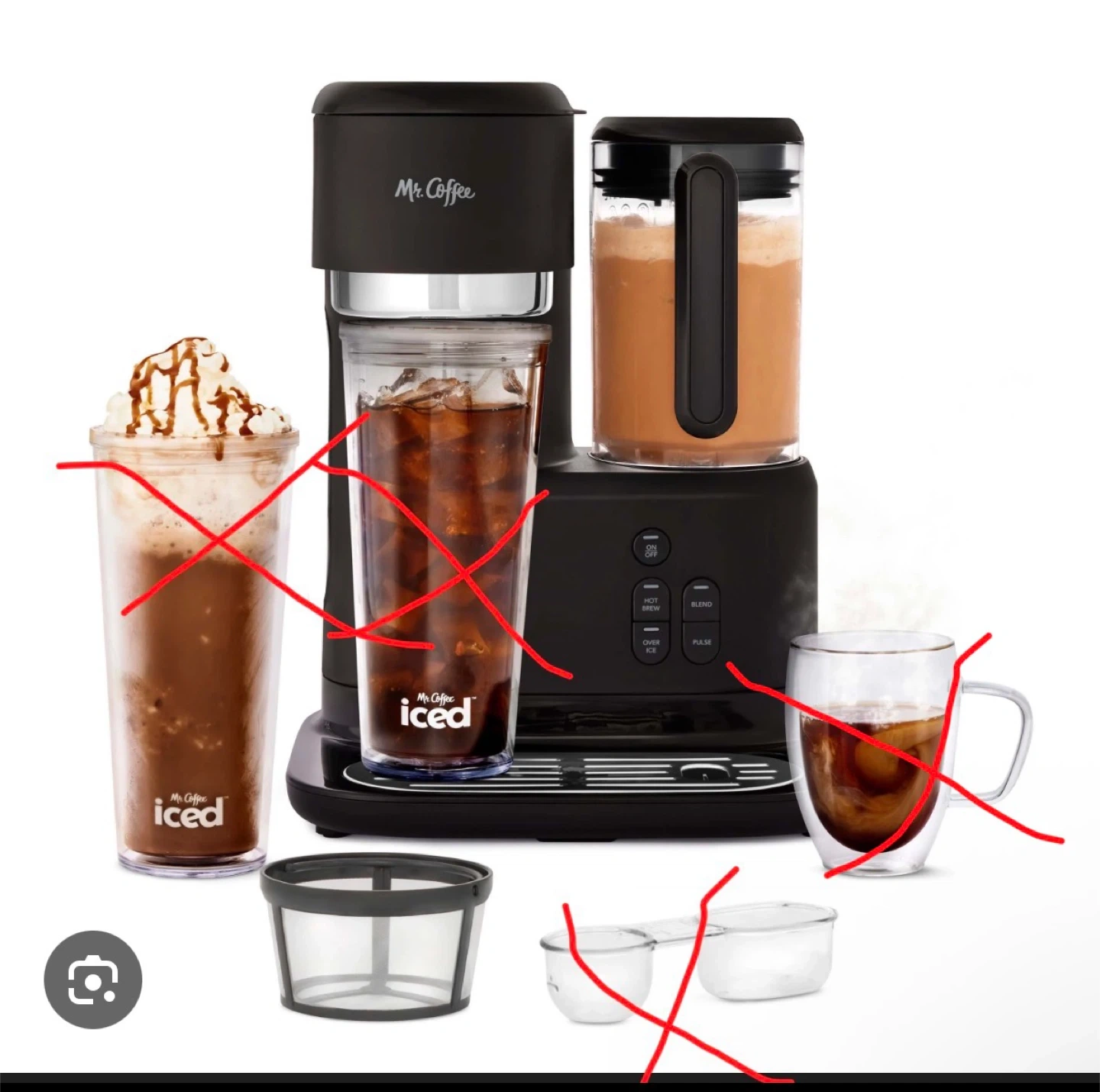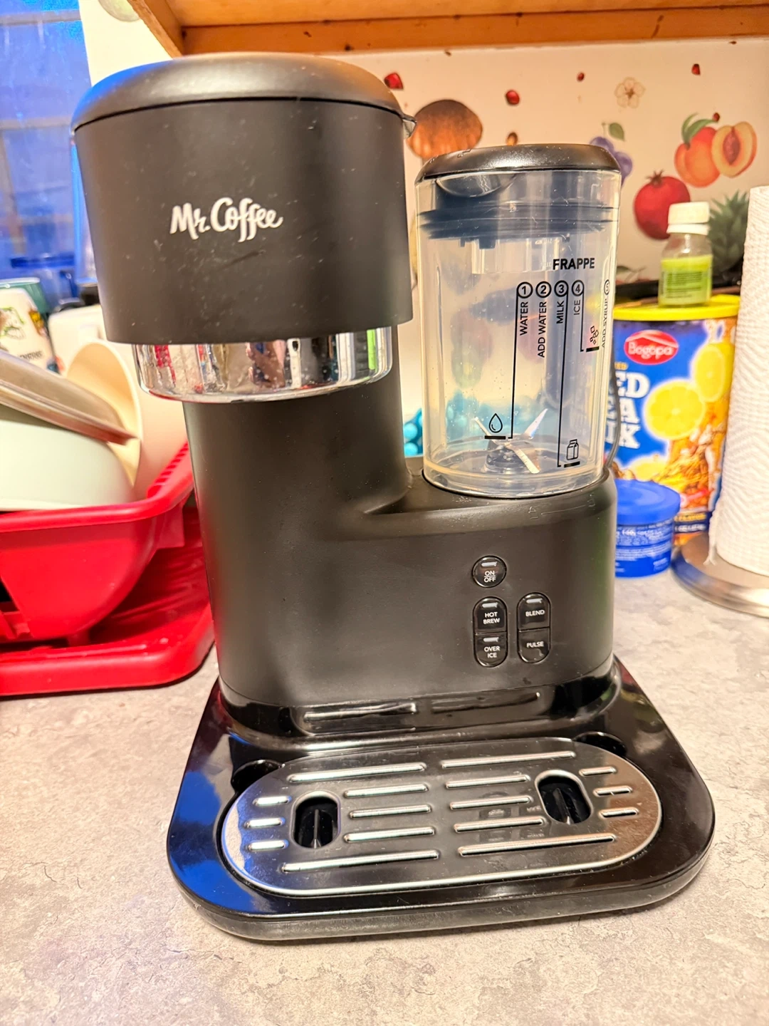 Mr. Coffee drink maker with controls for hot brew, over ice, blend, and pulse functions. Comes with a reusable ice tray and a removable splash tray. Perfect for making a variety of beverages at home! A few missing cups used twice regular price $170 it’s a great deal.
