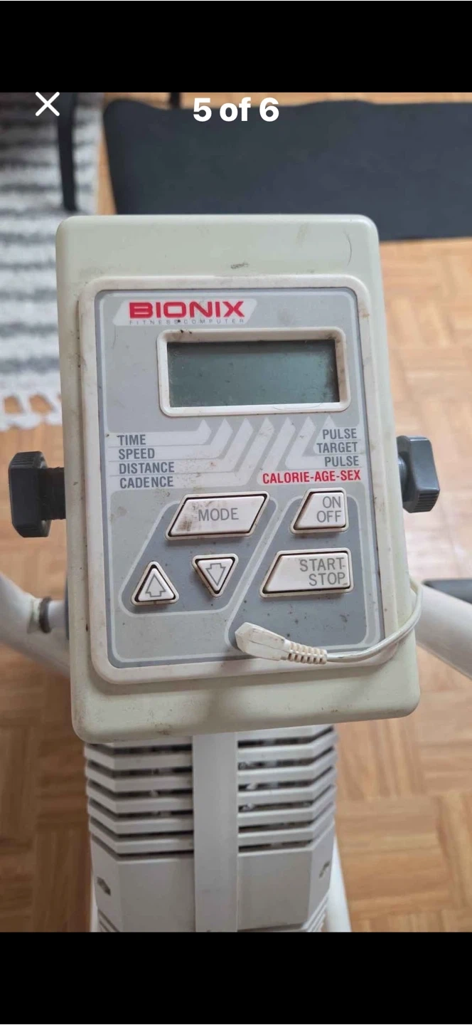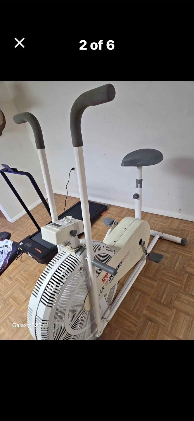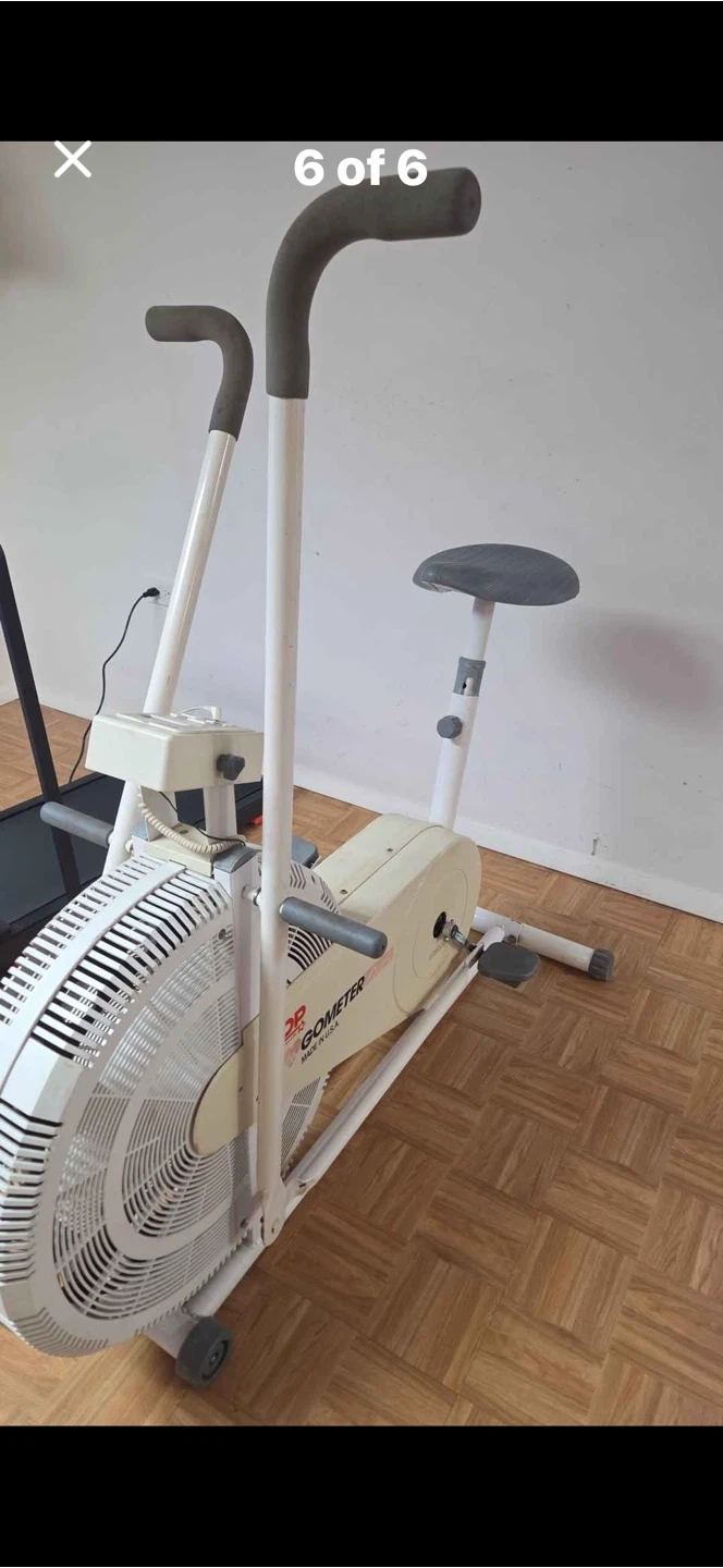 This DP Air Gometer exercise bike is designed for home workouts. It features a fan for resistance and a digital console that tracks time, speed, distance, cadence, pulse, and calories. Made in USA.