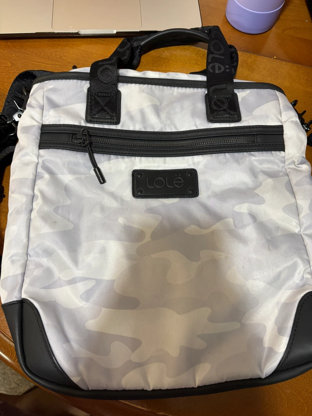Lole camo tote bag in perfect condition, comes with the wallet still & she is full of life with one minor stain, no wear and tear at all other than that.