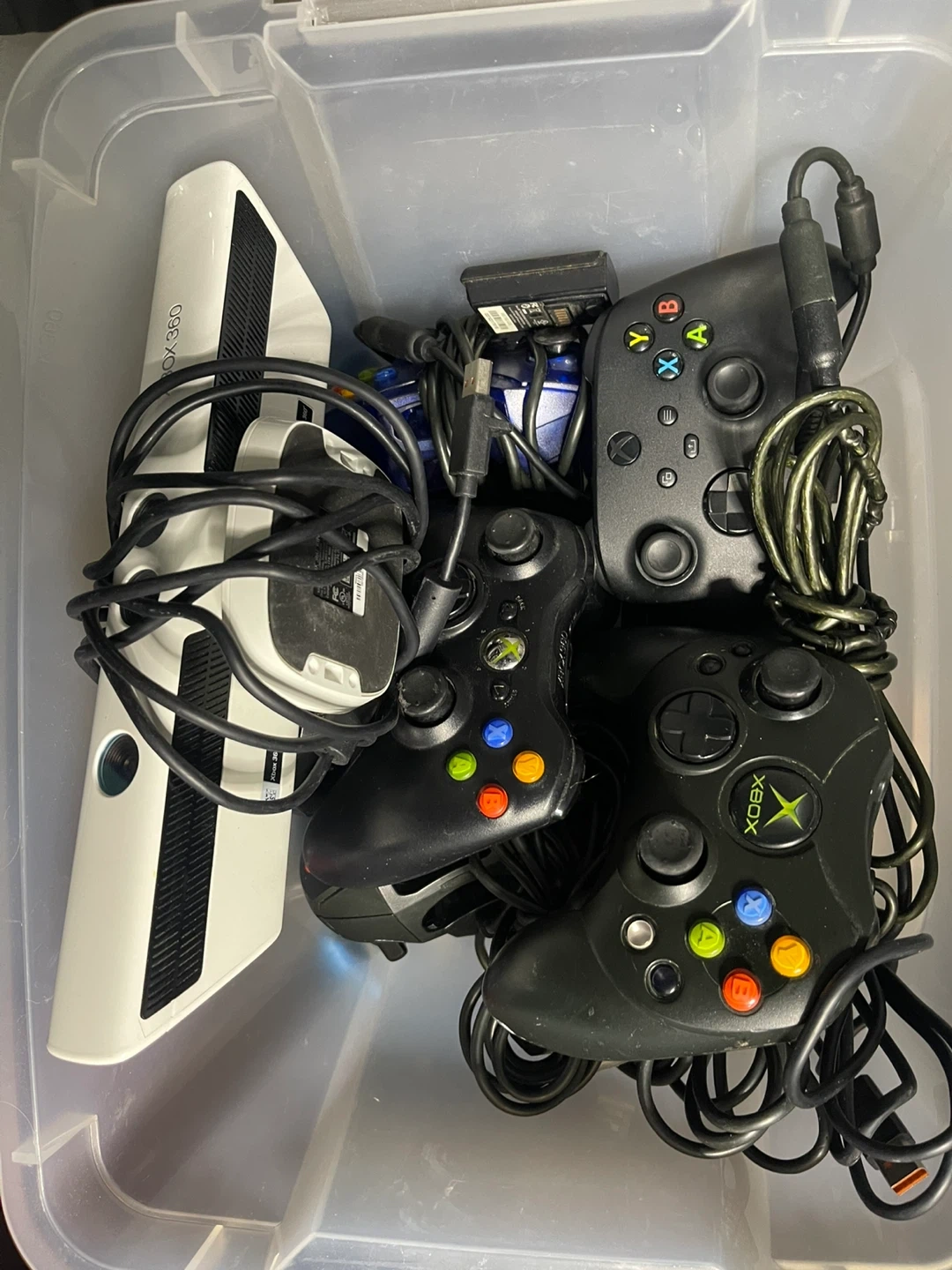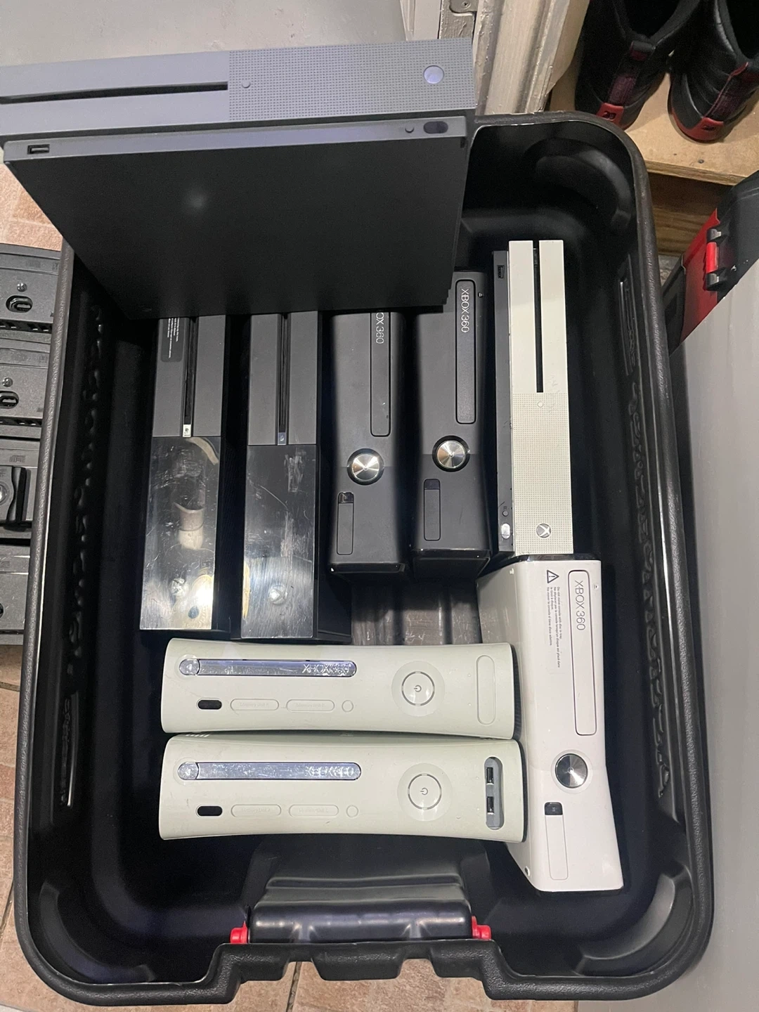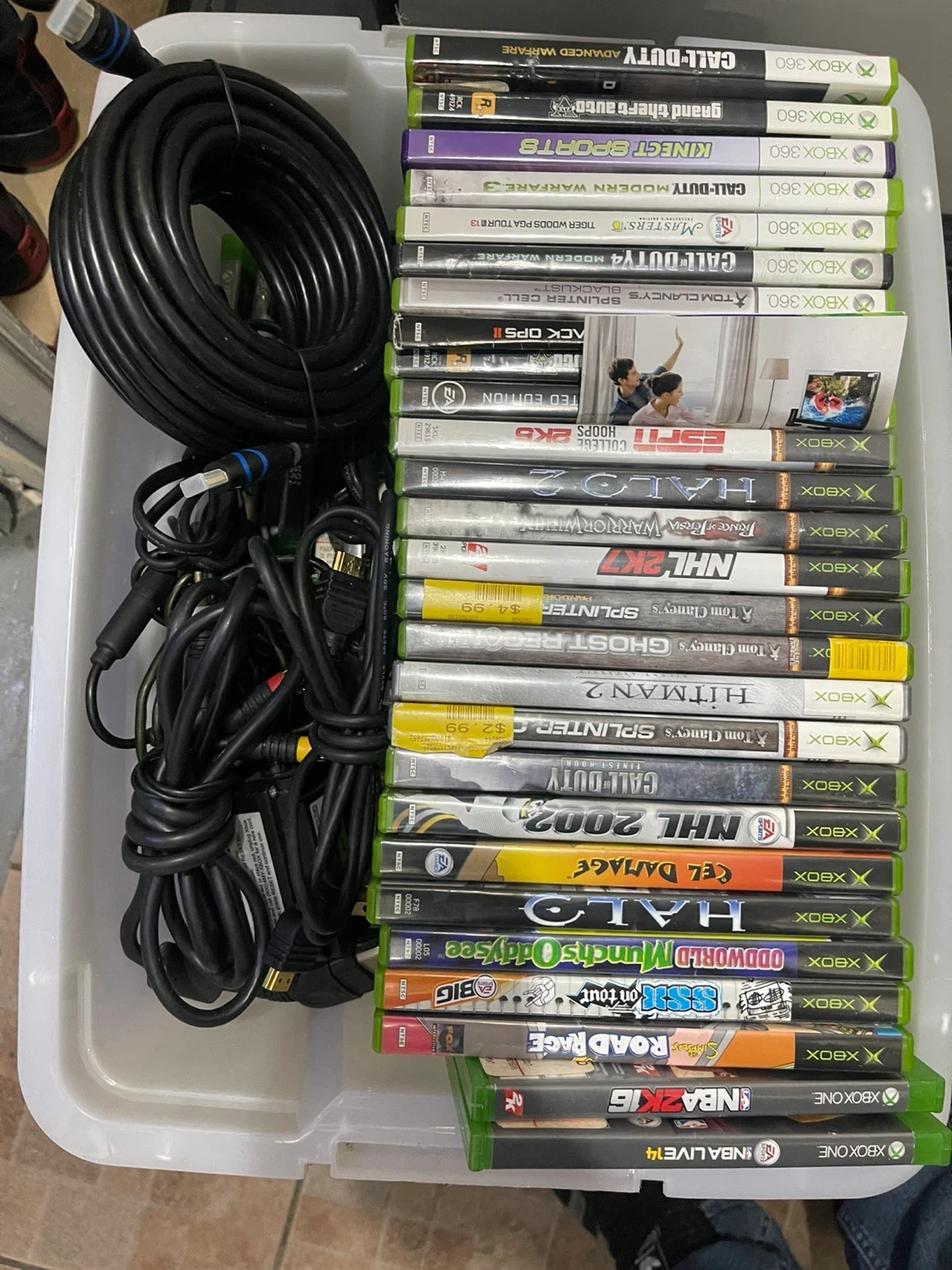 This lot includes multiple Xbox 360 consoles, various controllers, and a collection of games. It also comes with necessary cables and power supplies for the consoles. Perfect for anyone looking to expand their gaming collection or set up multiple gaming stations! TAKE ALL GAME LOT