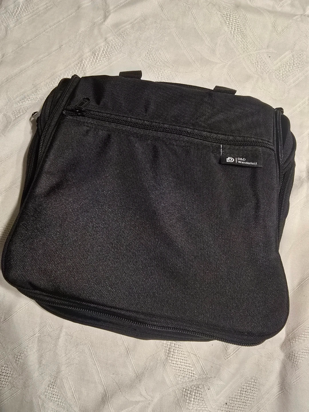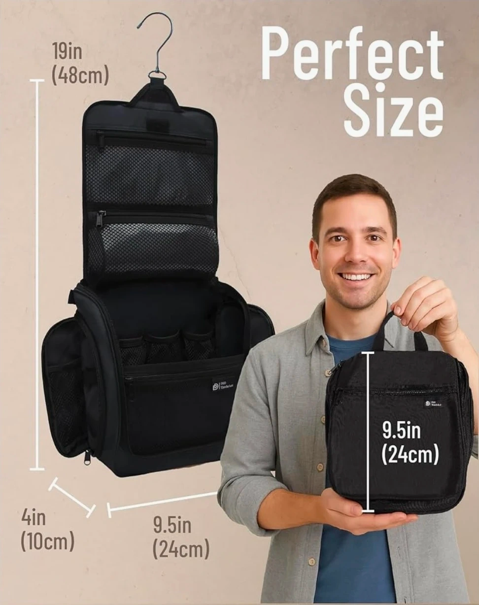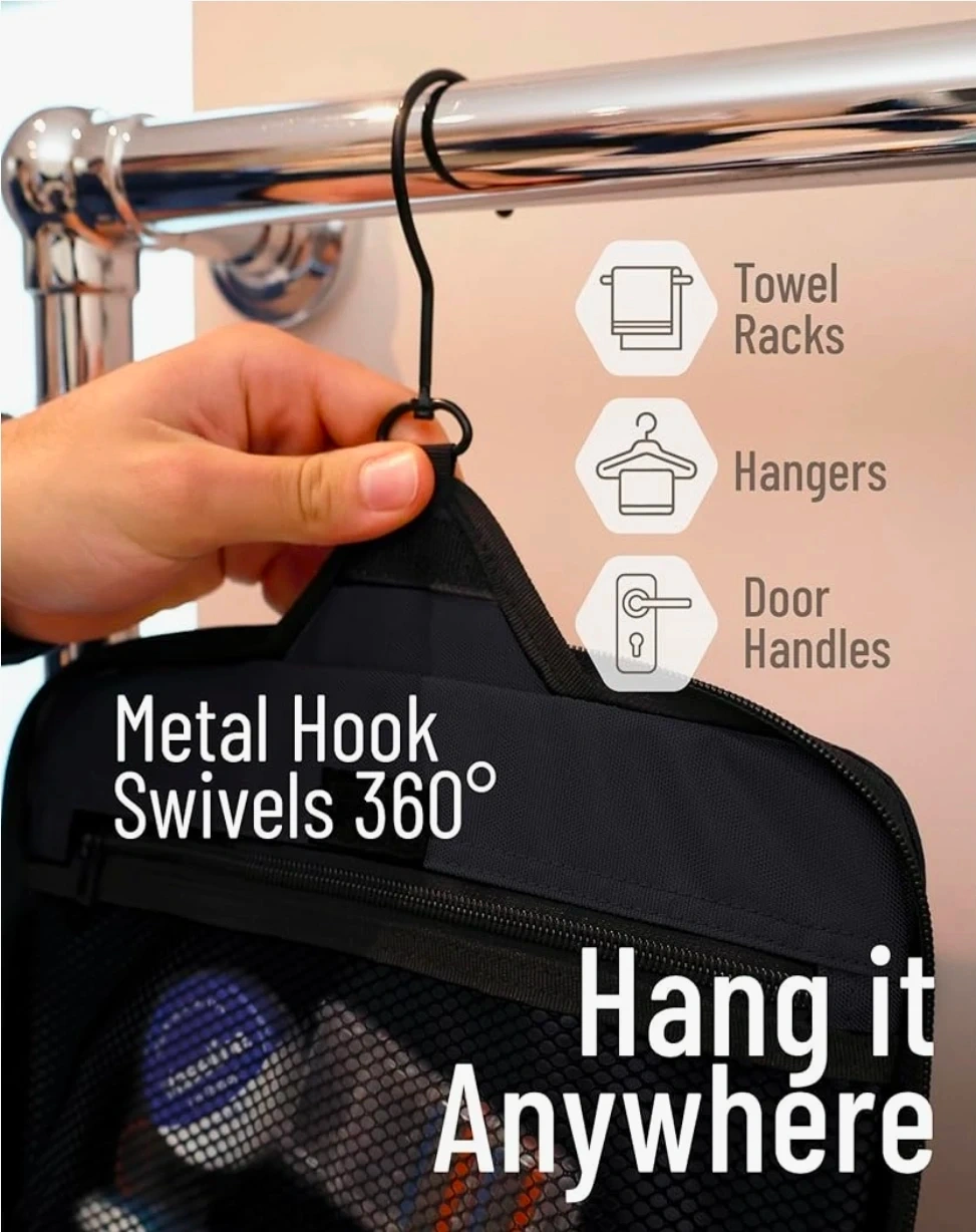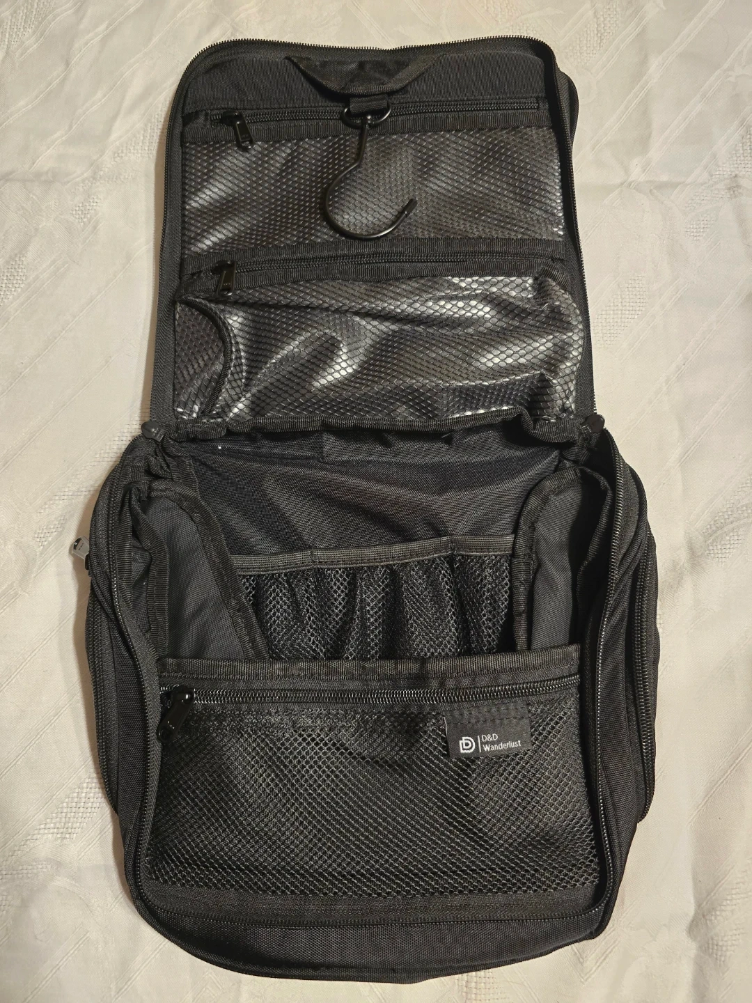 This D&D Wanderlust toiletry bag is black and features multiple zippered pockets and mesh compartments for easy organization. It includes a durable, 360-degree swiveling metal hook, making it easy to hang in bathrooms or closets. It's water-resistant and built to hold all your essentials.
