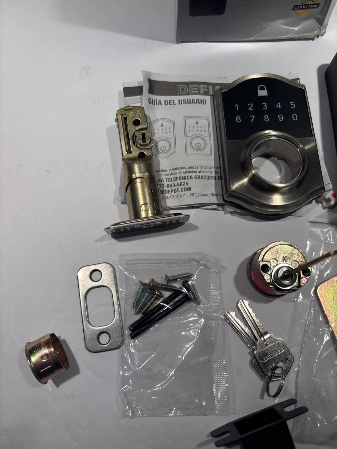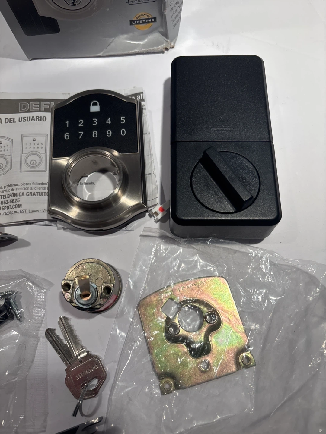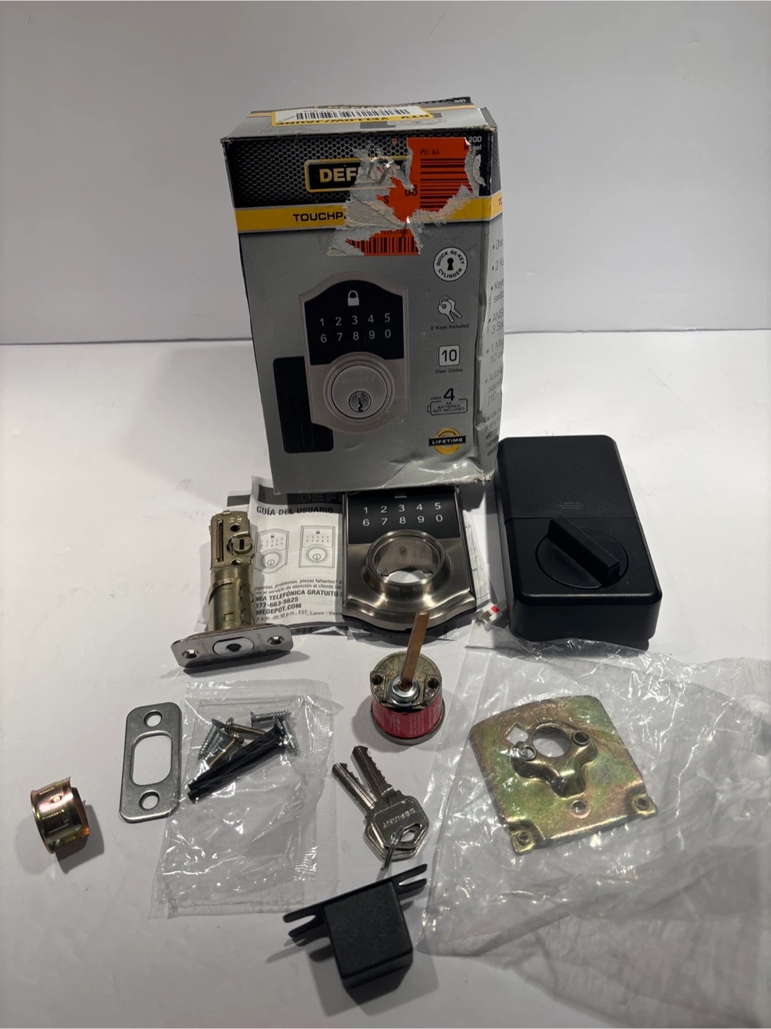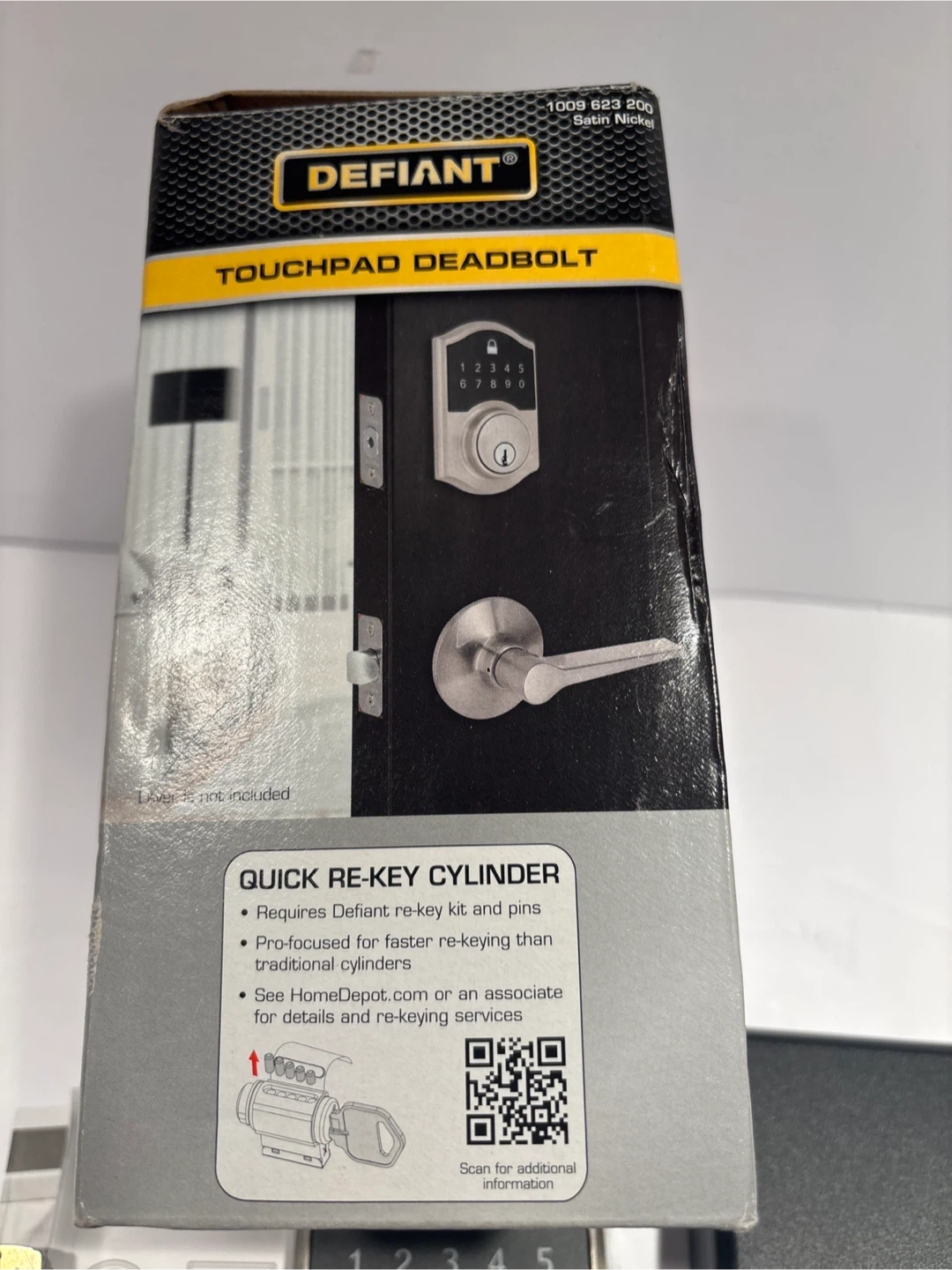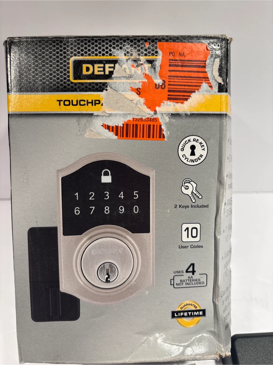 This is a Defiant Satin Nickel Touchpad Deadbolt. It supports up to 10 user codes. Batteries are not included. This lock features a quick re-key cylinder.