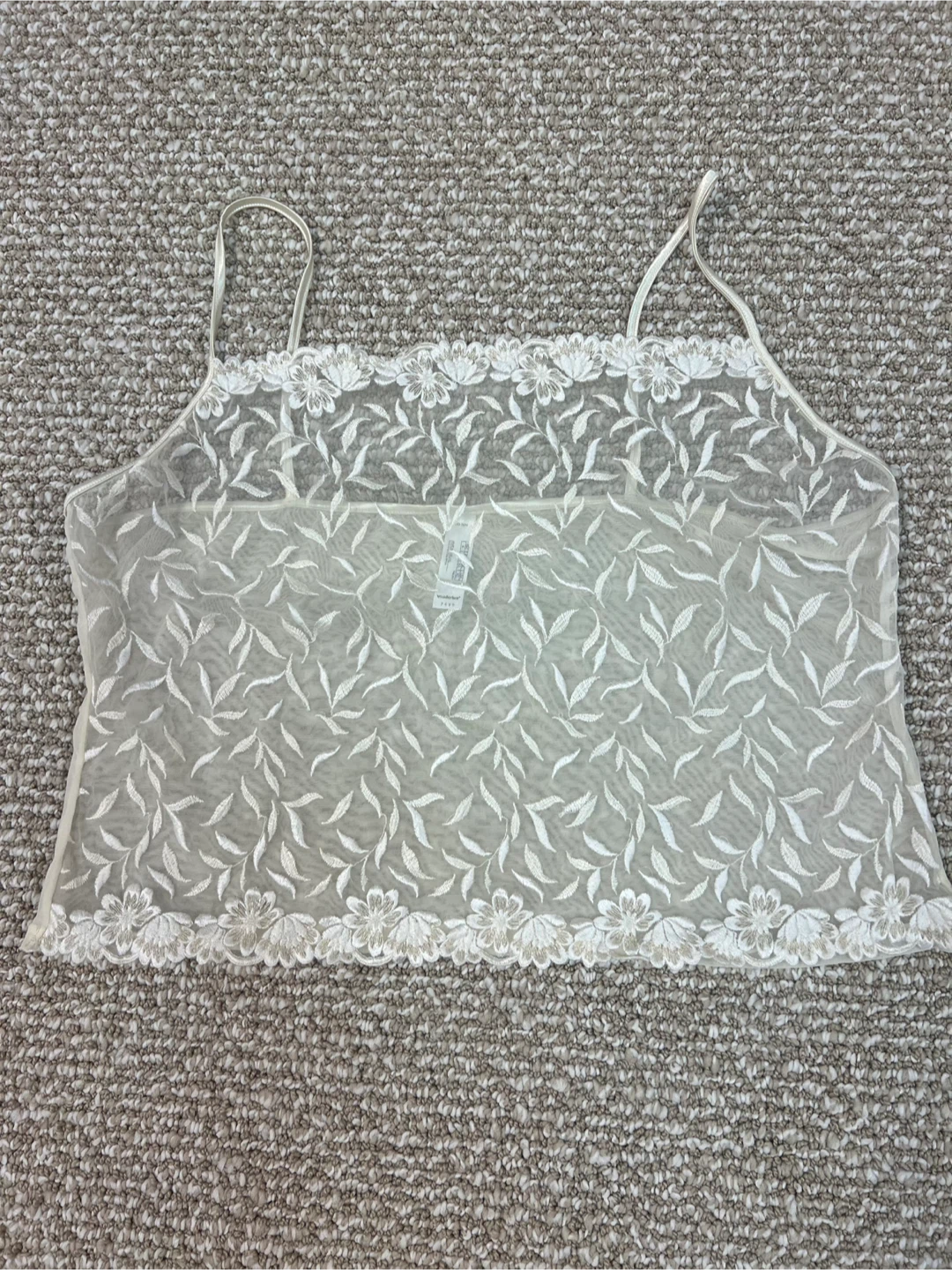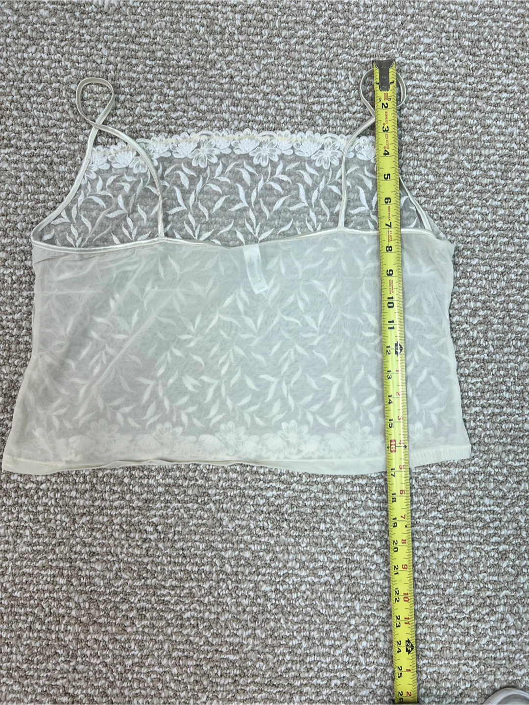This is a white Wonderbra cami top. Floral lace detailing throughout the sheer fabric. XL and made of a mesh material. New tags is missing