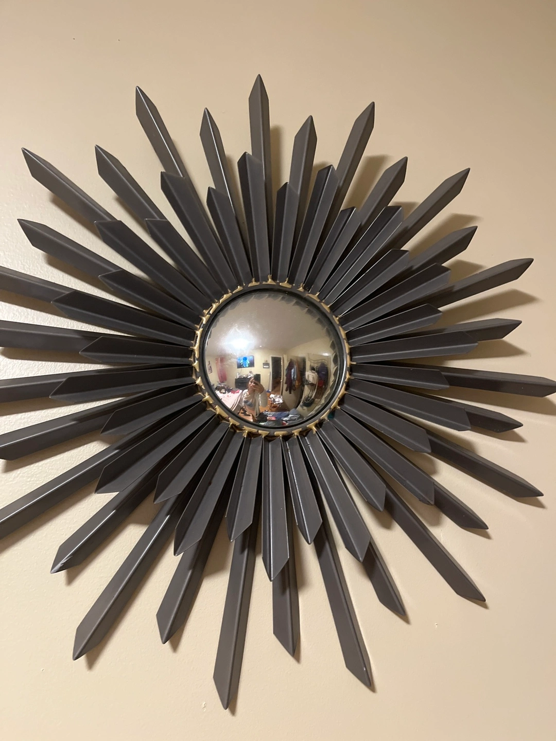 A large sunburst mirror with a round mirror in the center and metal rays. The mirror is in a dark gray finish and has a gold accent around the center mirror.