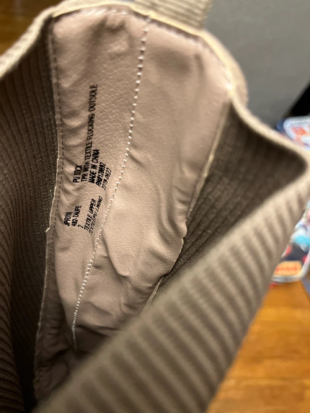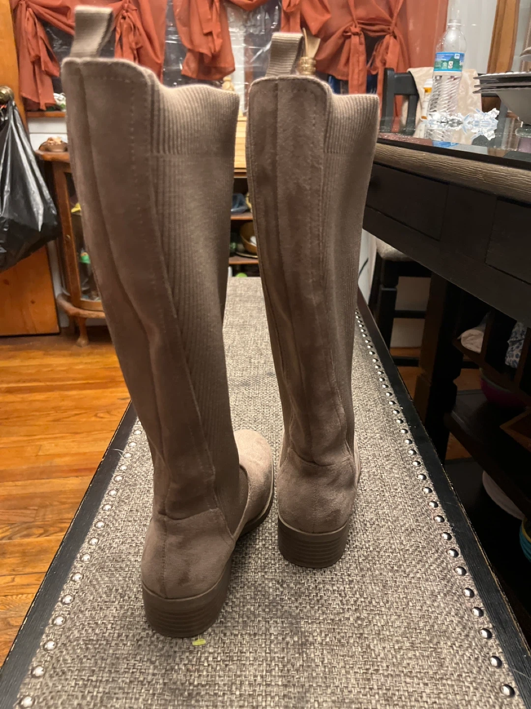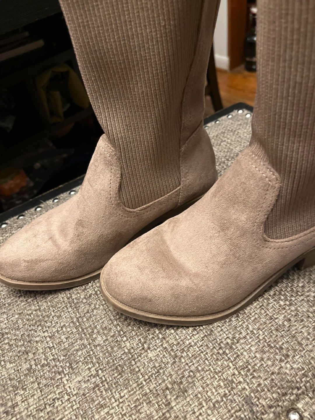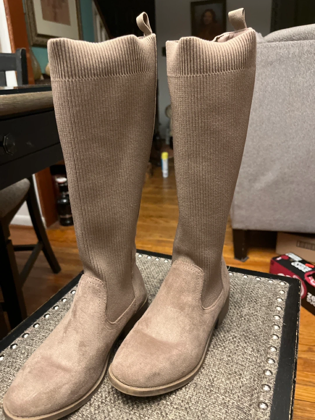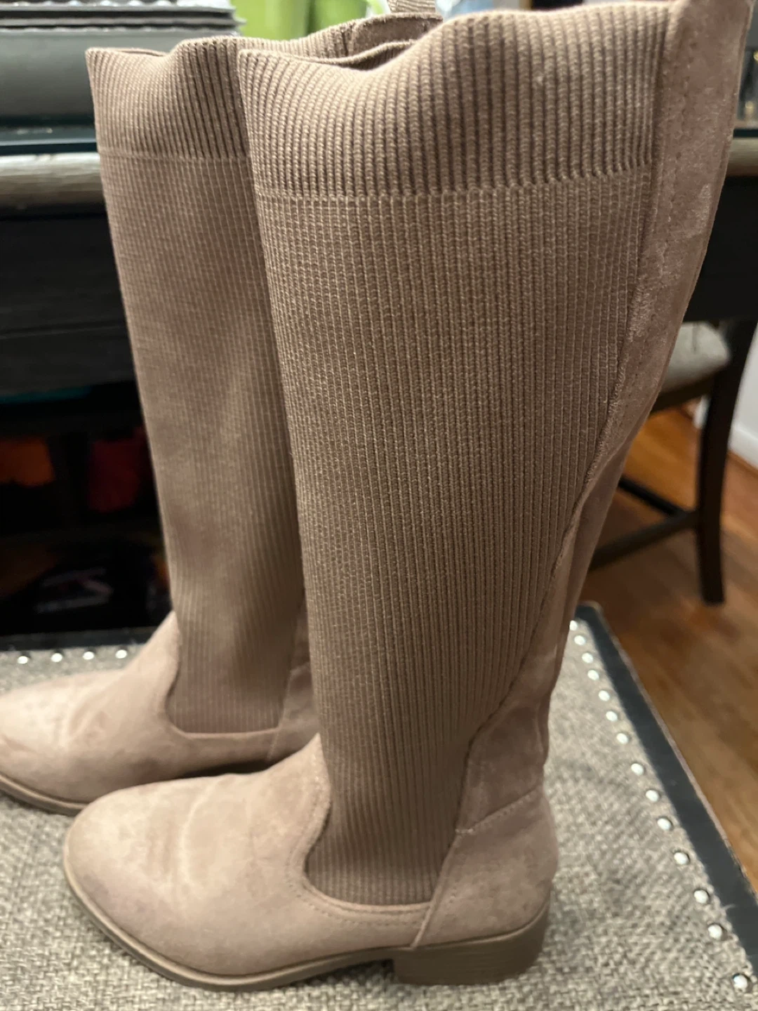 These are a pair of taupe knee high boots. They have a suede-like material on the foot and a ribbed knit shaft. They are in good condition and ready for a new owner!