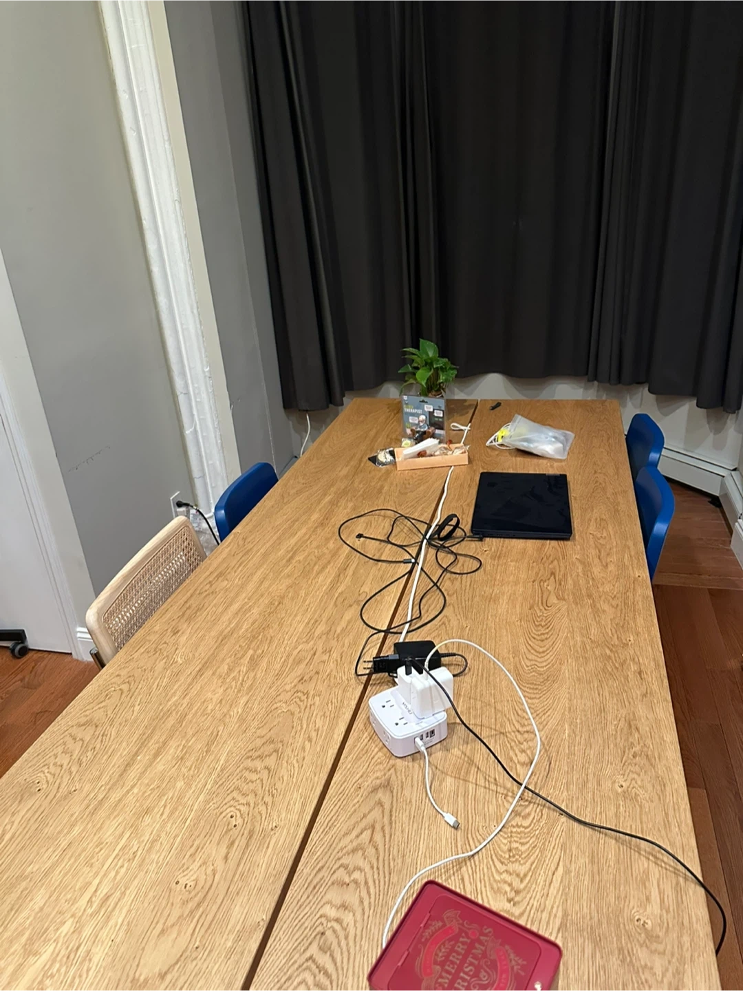 This is an IKEA SKOGSTA table with an acacia wood finish. It measures 92 1/2 inches long by 39 3/8 inches wide. It's a sturdy dining or work table.