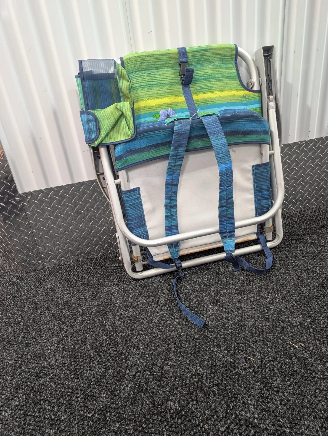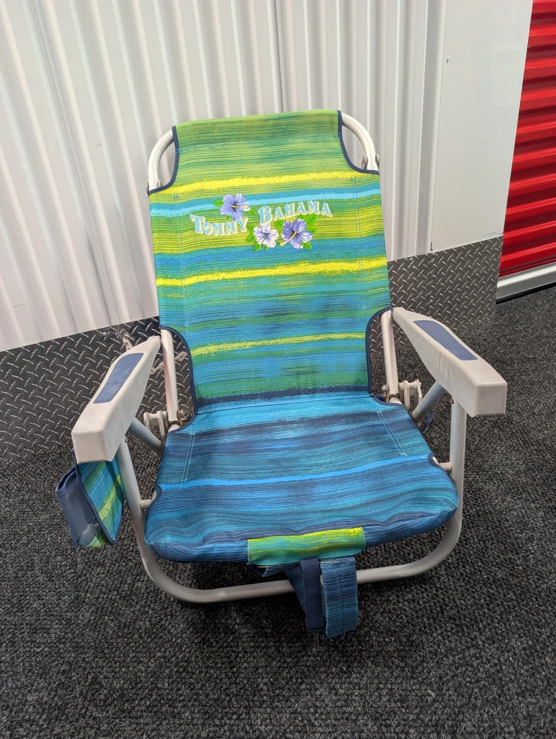This Tommy Bahama beach chair features a colorful striped design with blue and green hues. It's a foldable chair with adjustable straps, making it easy to carry. It has a built-in cup holder and a small pouch on the side. It's perfect for relaxing at the beach or by the pool!