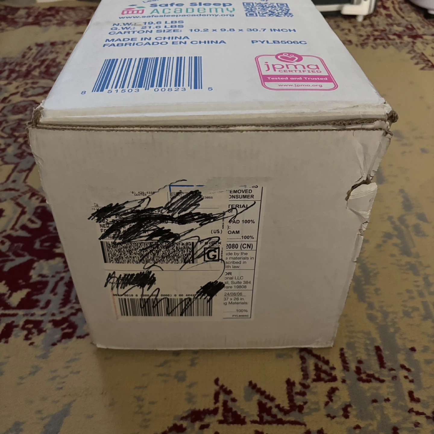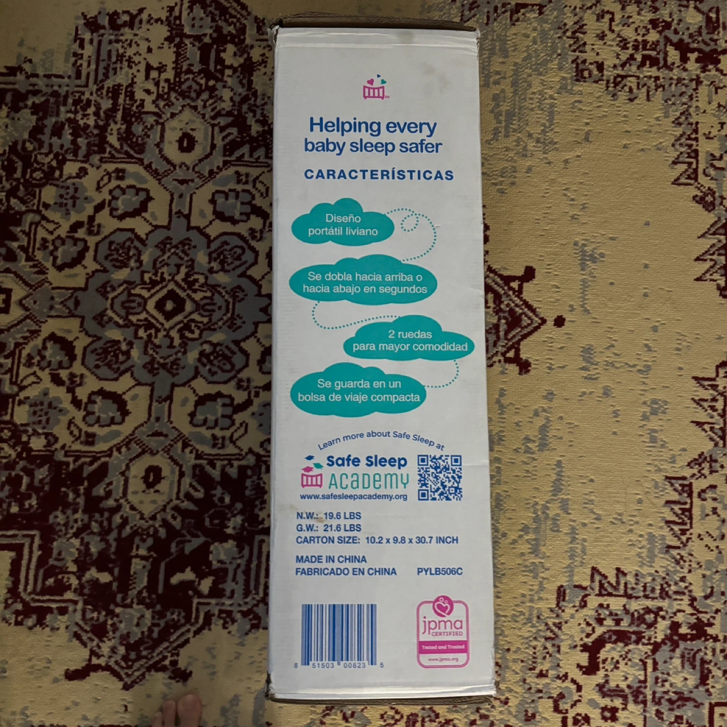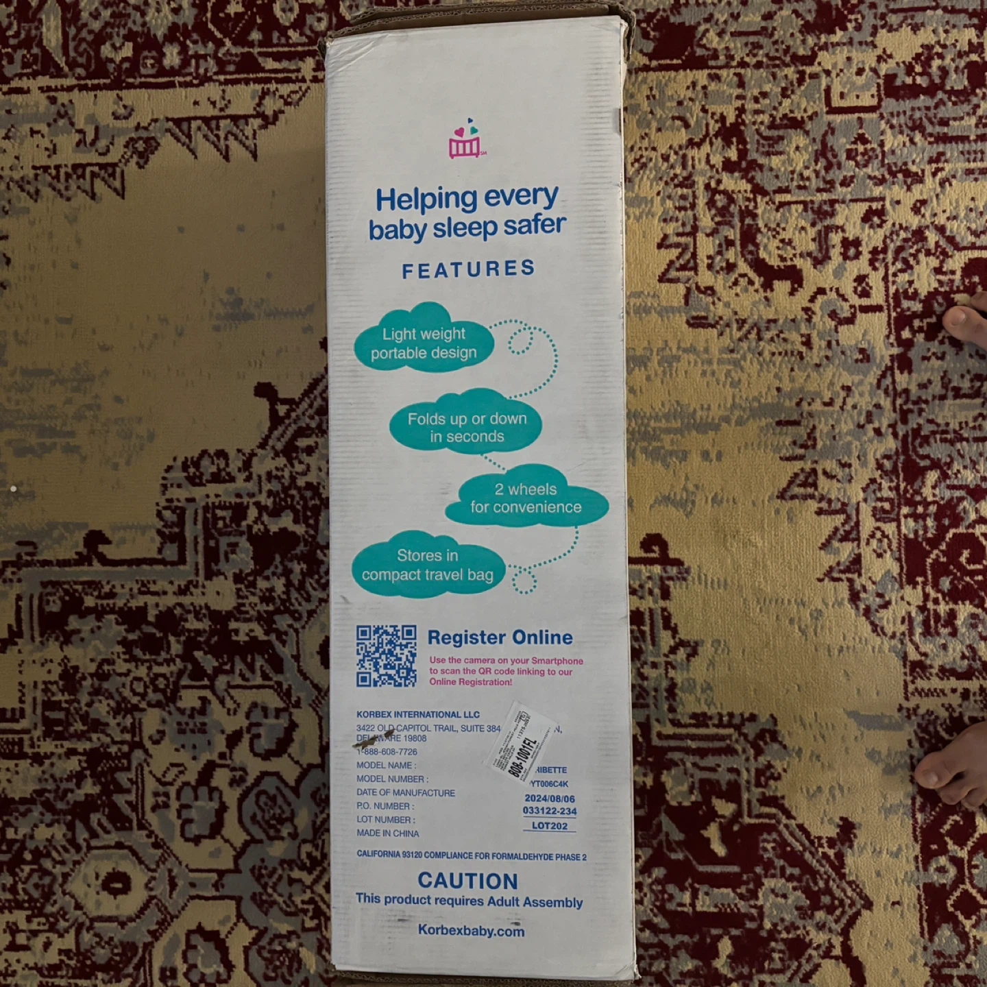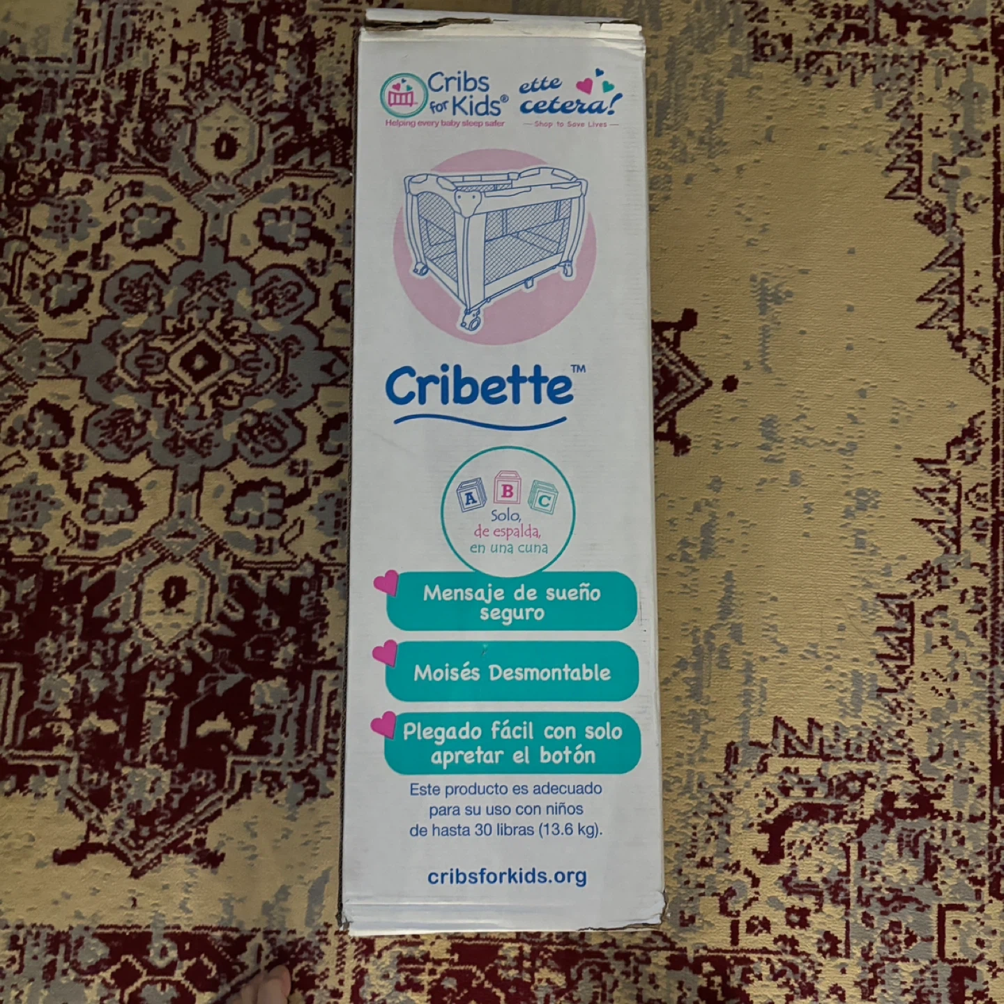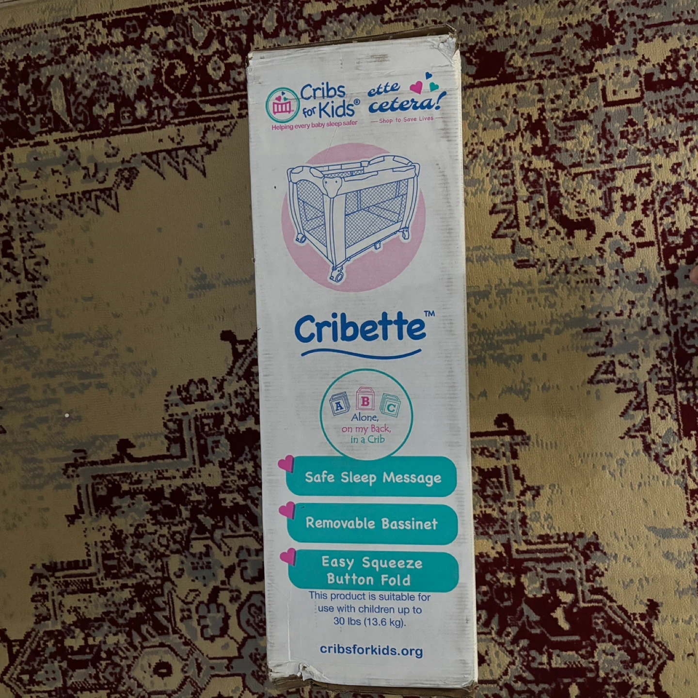 Selling a Cribette portable crib! It's lightweight and folds up or down in seconds. It also has wheels for convenience and stores in a compact travel bag. The box indicates a manufacturing date of 2023 August 06. This product is suitable for use with children up to 30 lbs (13.6 kg)