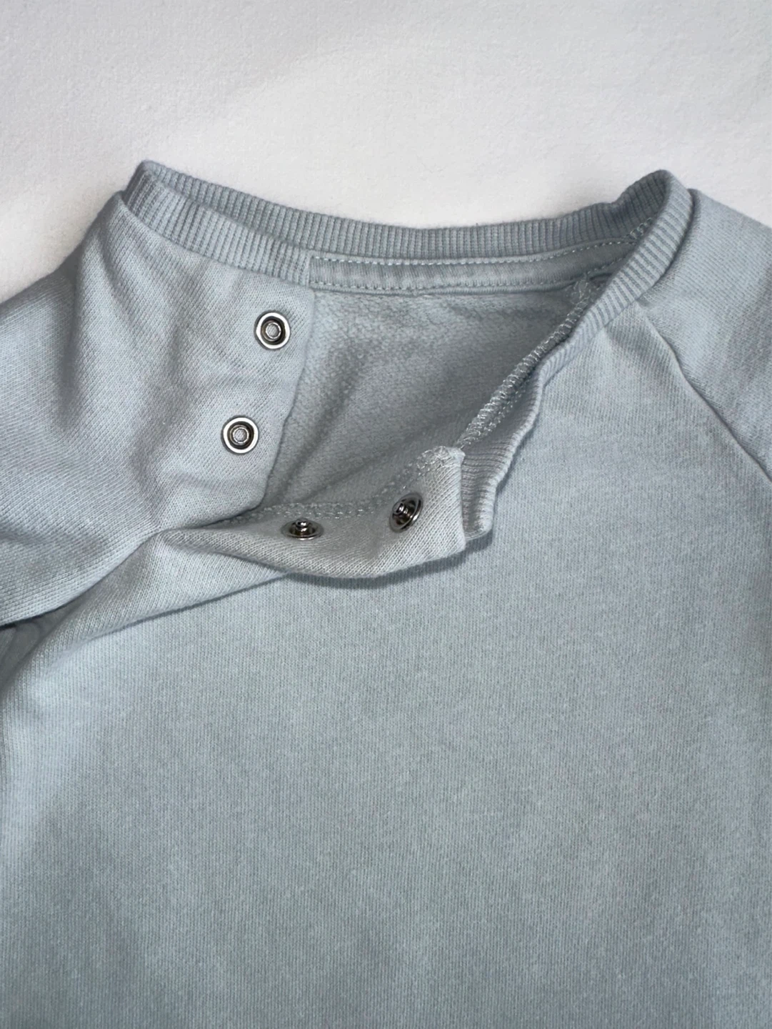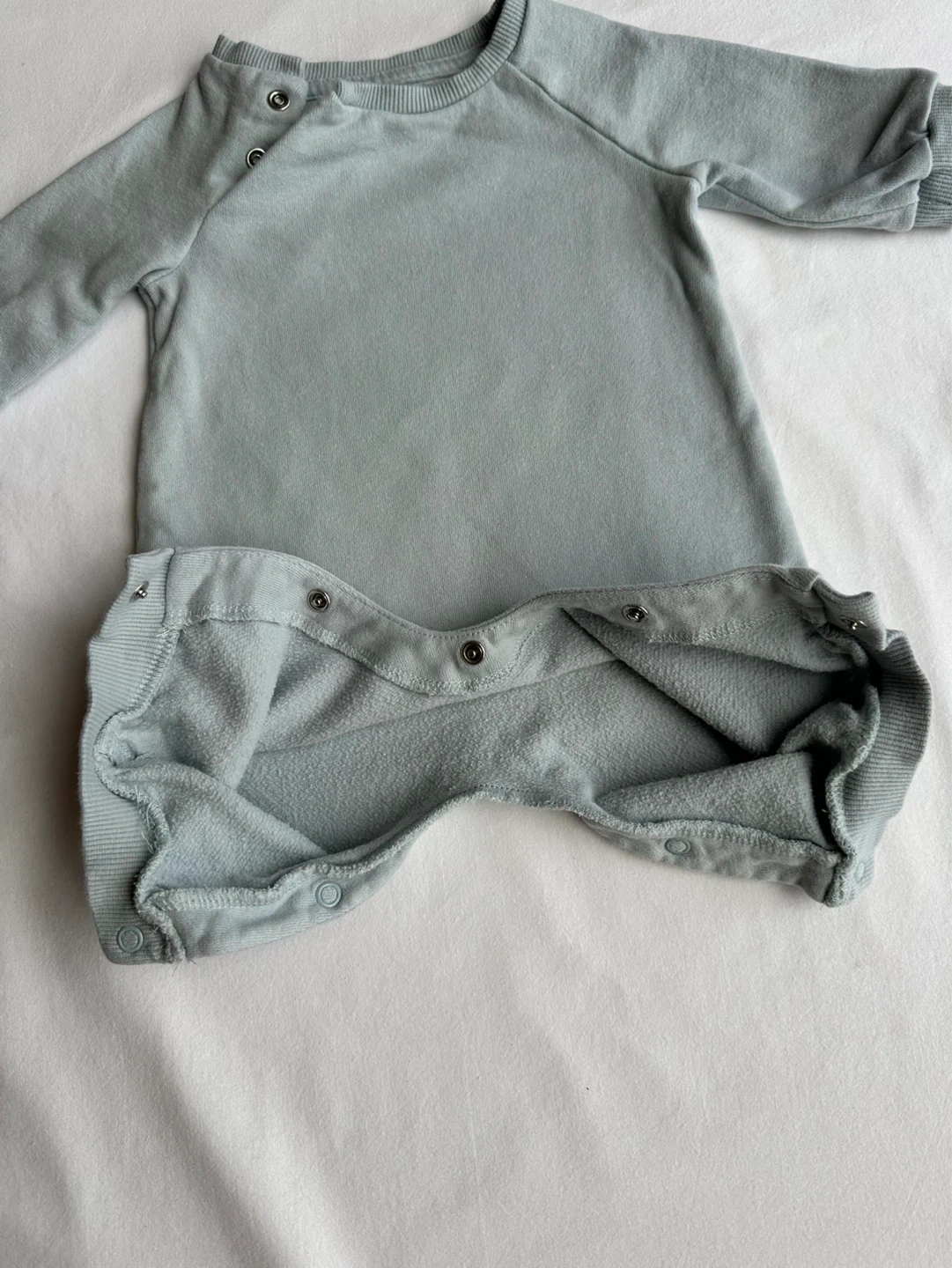 Soft light blue baby romper with snap closures at the shoulder and inseam. Made from a comfortable cotton blend material. Perfect for everyday wear.