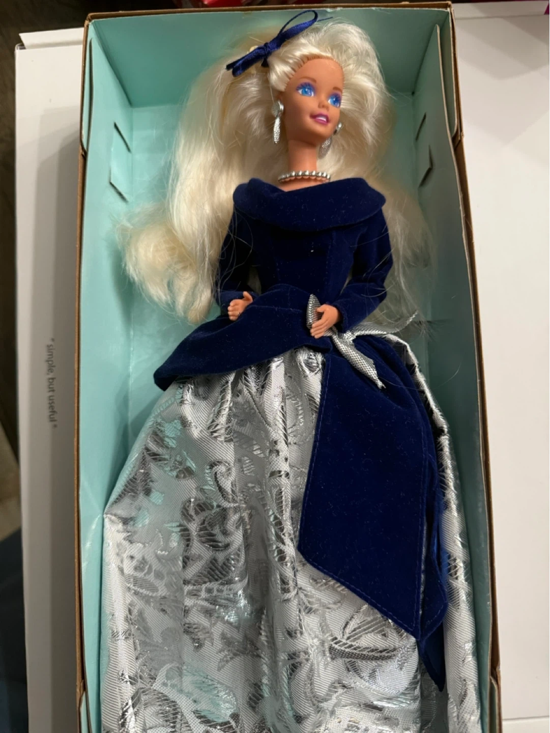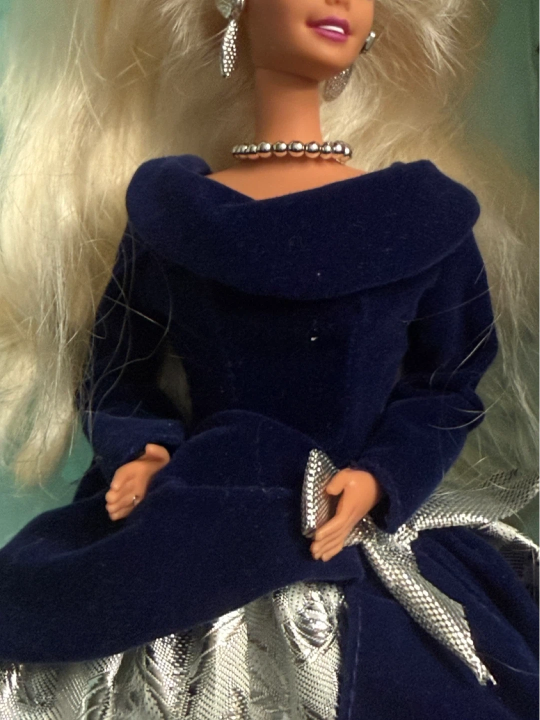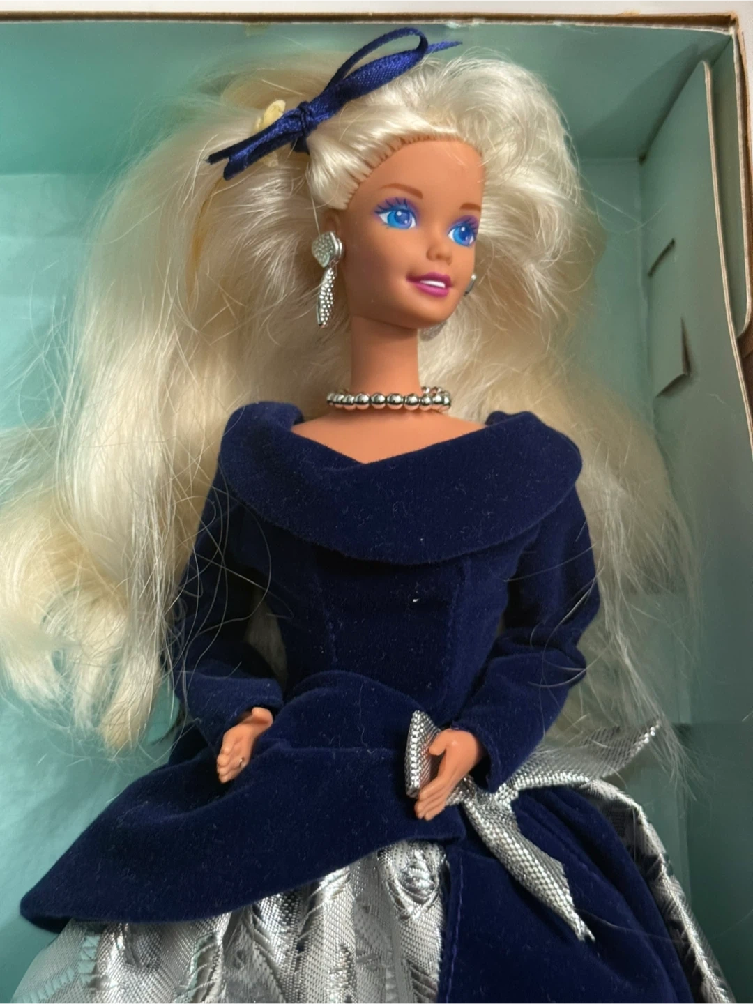 Selling a beautiful Vintage Barbie doll dressed in a stunning blue velvet gown with silver accents! She comes with matching jewelry and a ribbon in her hair. This 1995 Barbie is from the Avon Collection. A lovely addition to any Barbie collection