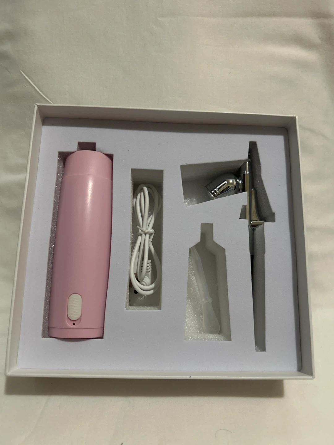 This portable airbrush kit includes a pink handheld compressor and airbrush gun. It comes with a USB charging cable and a stand. Great for makeup or crafting applications!