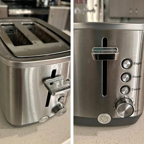 This GE 2-slice stainless steel toaster features extra-wide slots, perfect for bagels, breads, waffles, and more. It has 7 adjustable shade settings and a removable crumb tray for easy cleaning.