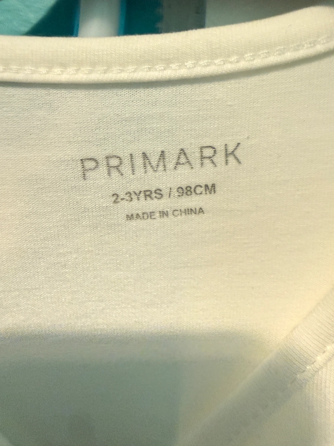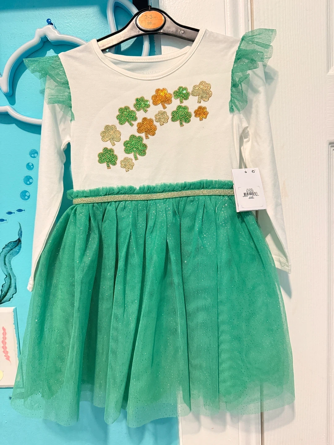 This white long-sleeve shirt dress features a sparkly green tulle skirt with shamrock details on the bodice. It's a size 2-3YRS / 98CM. Made in China.