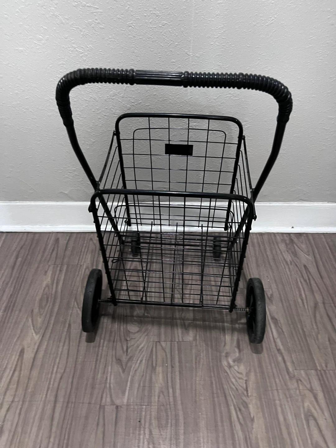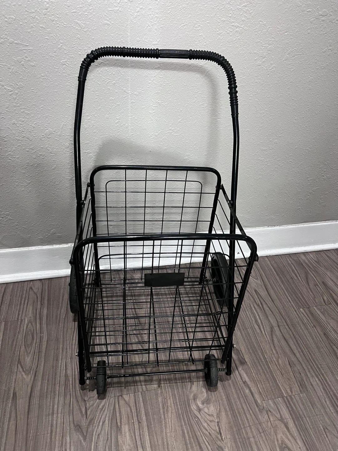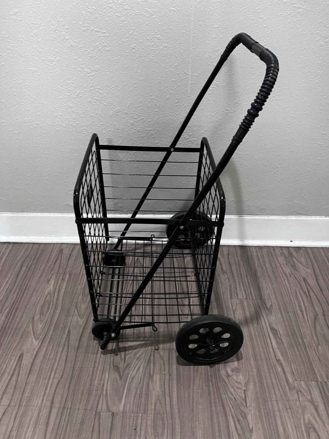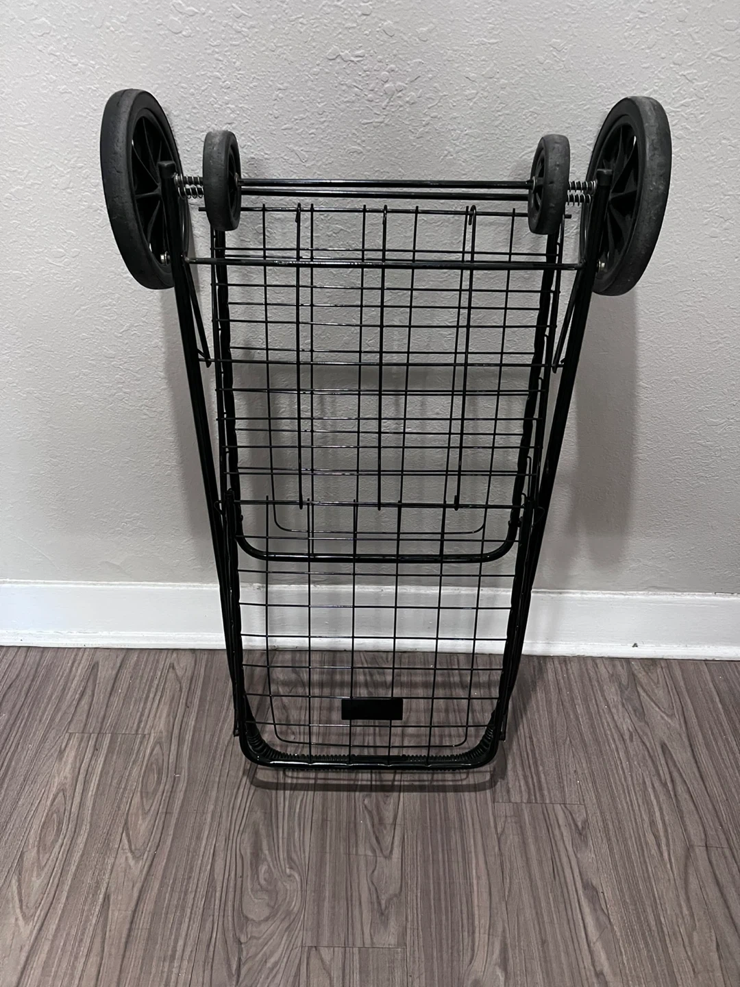This black shopping cart features a sturdy wireframe construction and two wheels for easy transport. It folds flat for convenient storage. Great for carrying groceries or laundry!
