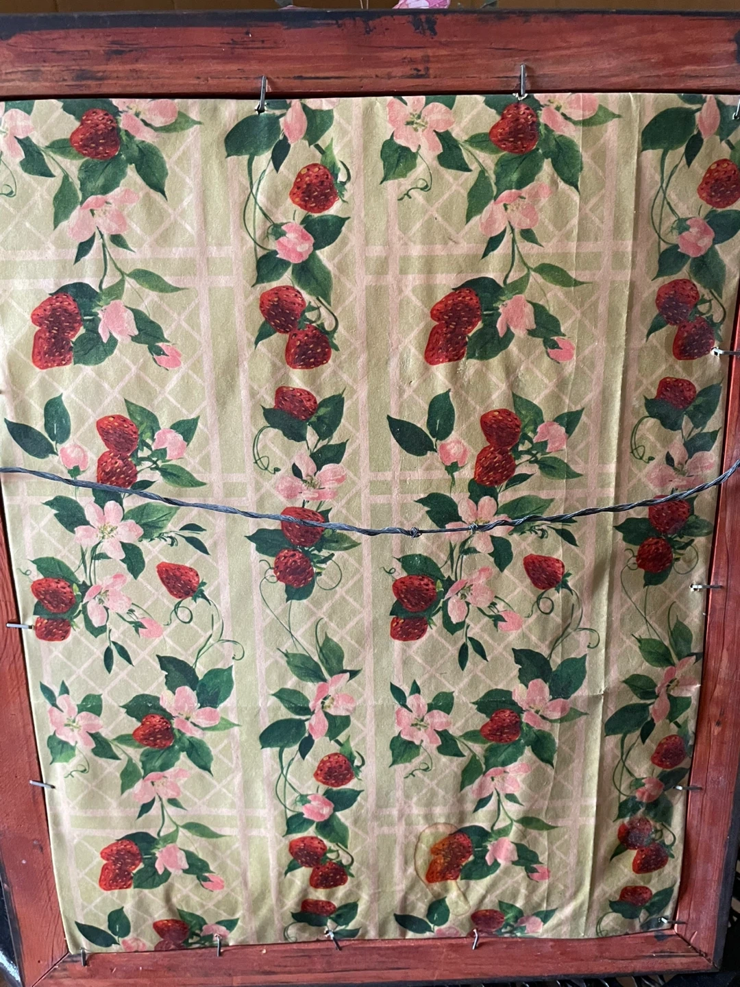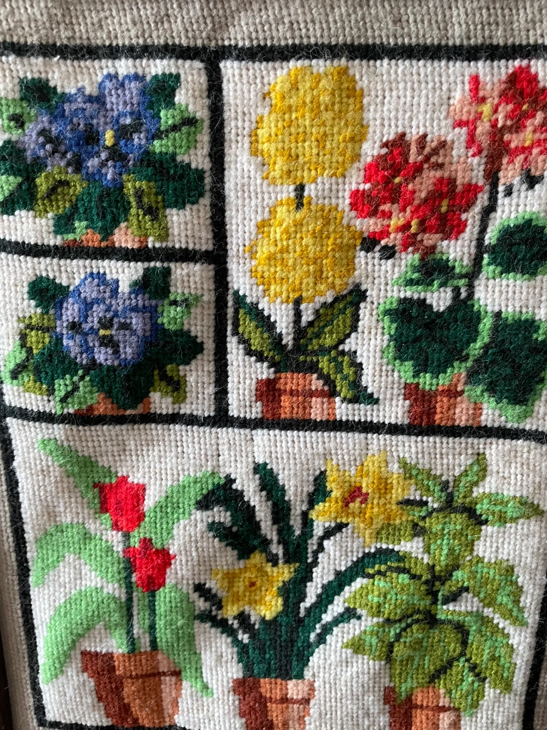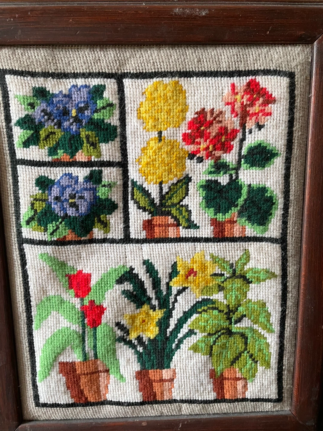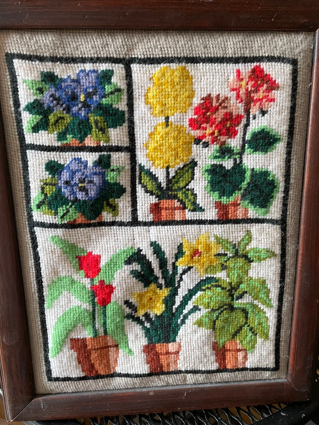 This is a charming framed needlepoint depicting potted flowers. It's a lovely piece with a strawberry and floral patterned backing. Ready to hang and add a touch of vintage charm to any room!