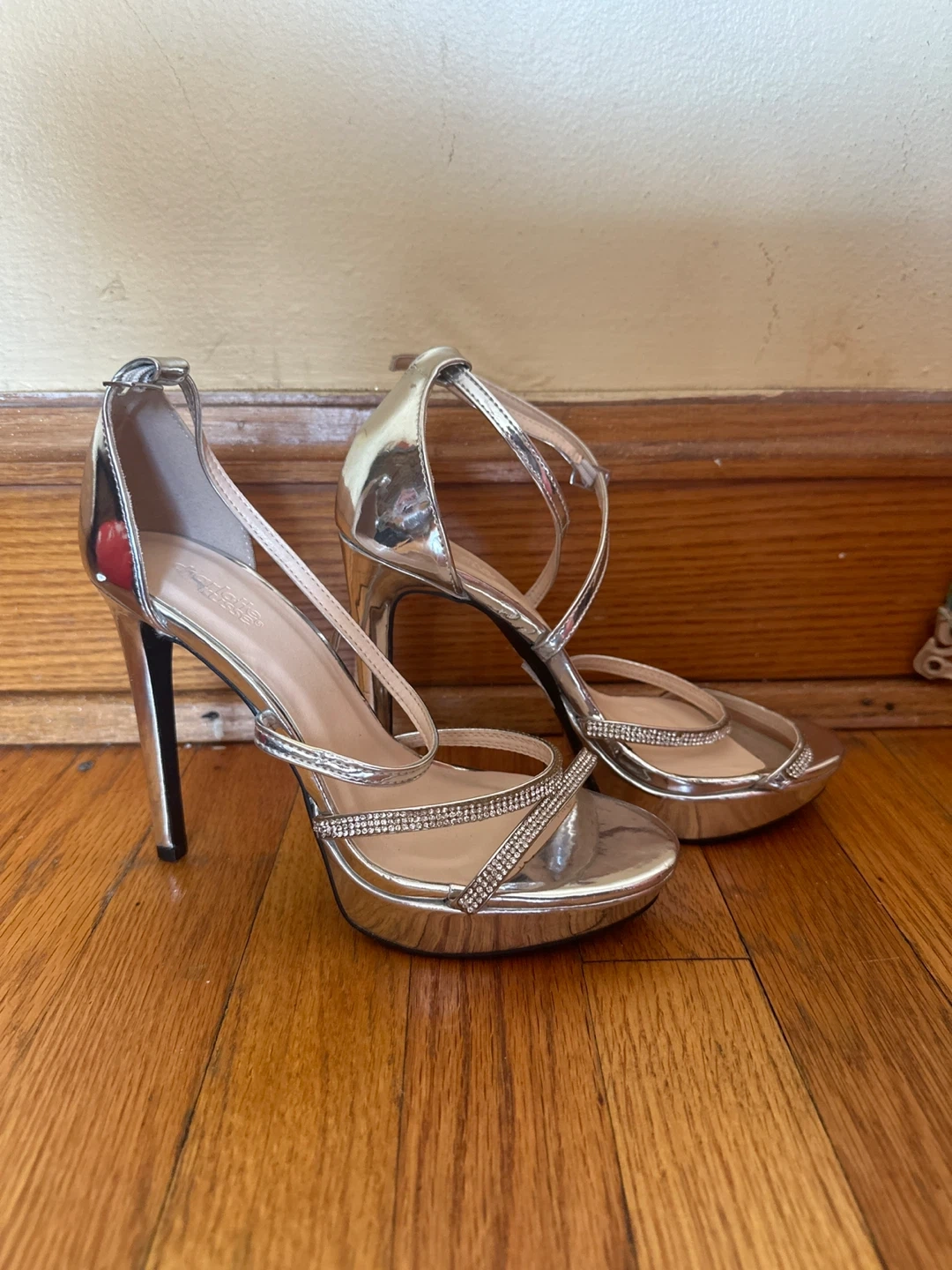 These are a pair of Wild Fable silver heels in a women's size 8.They feature a sparkly strap across the toes and an ankle strap. Perfect for a night out!