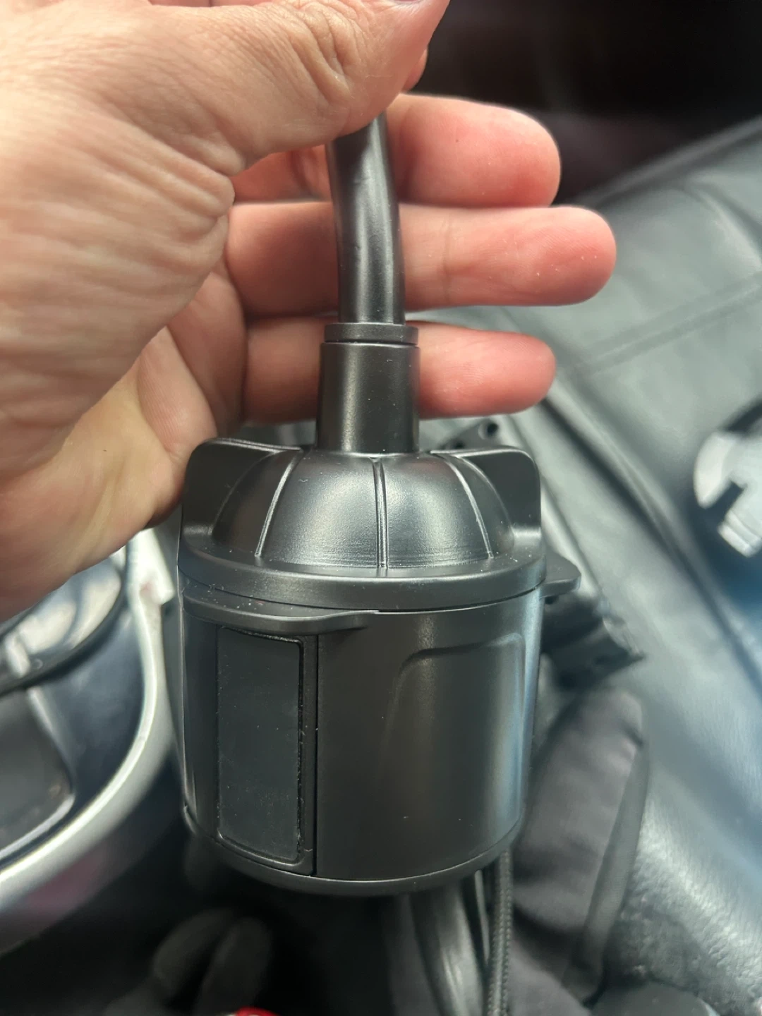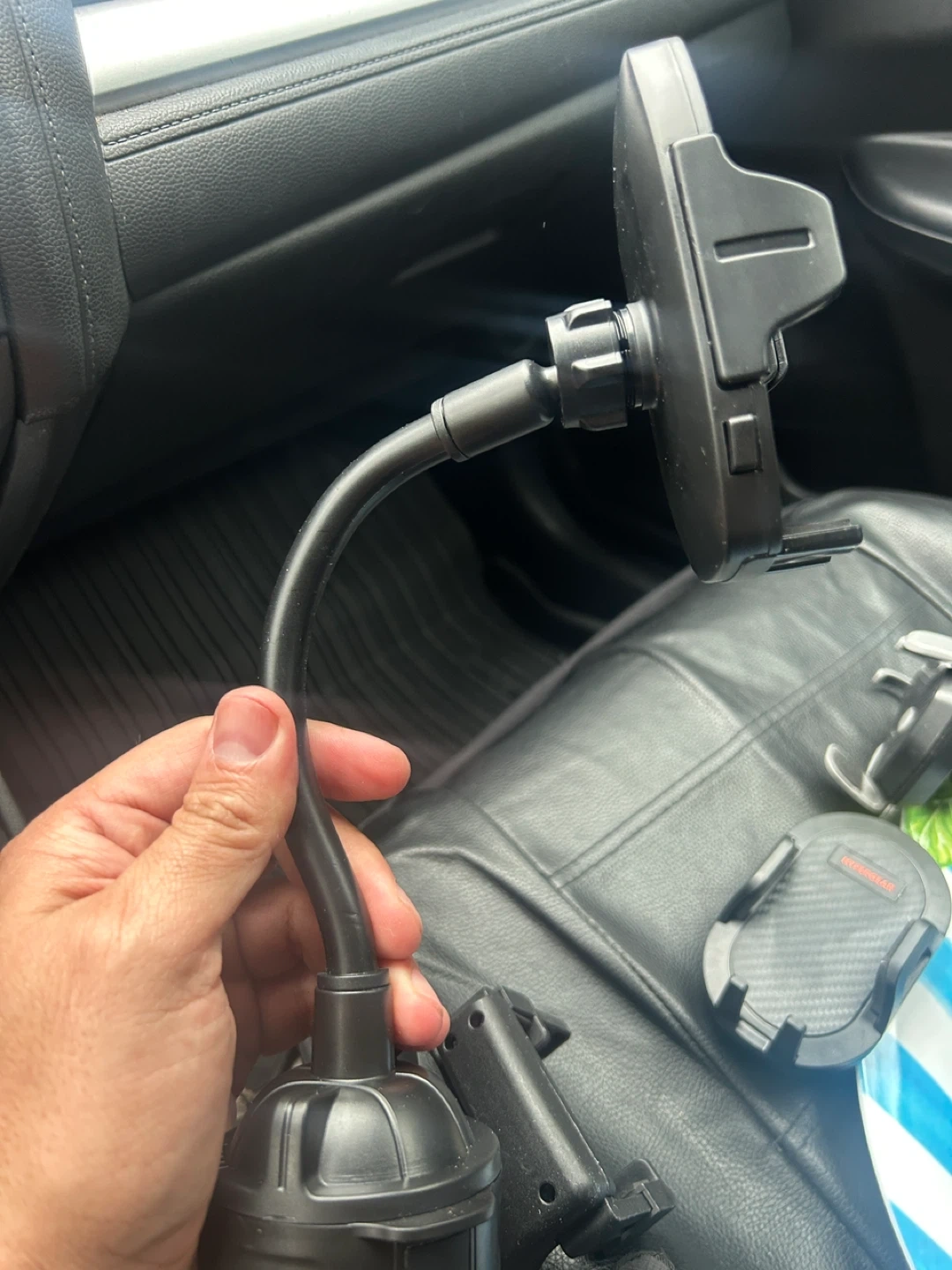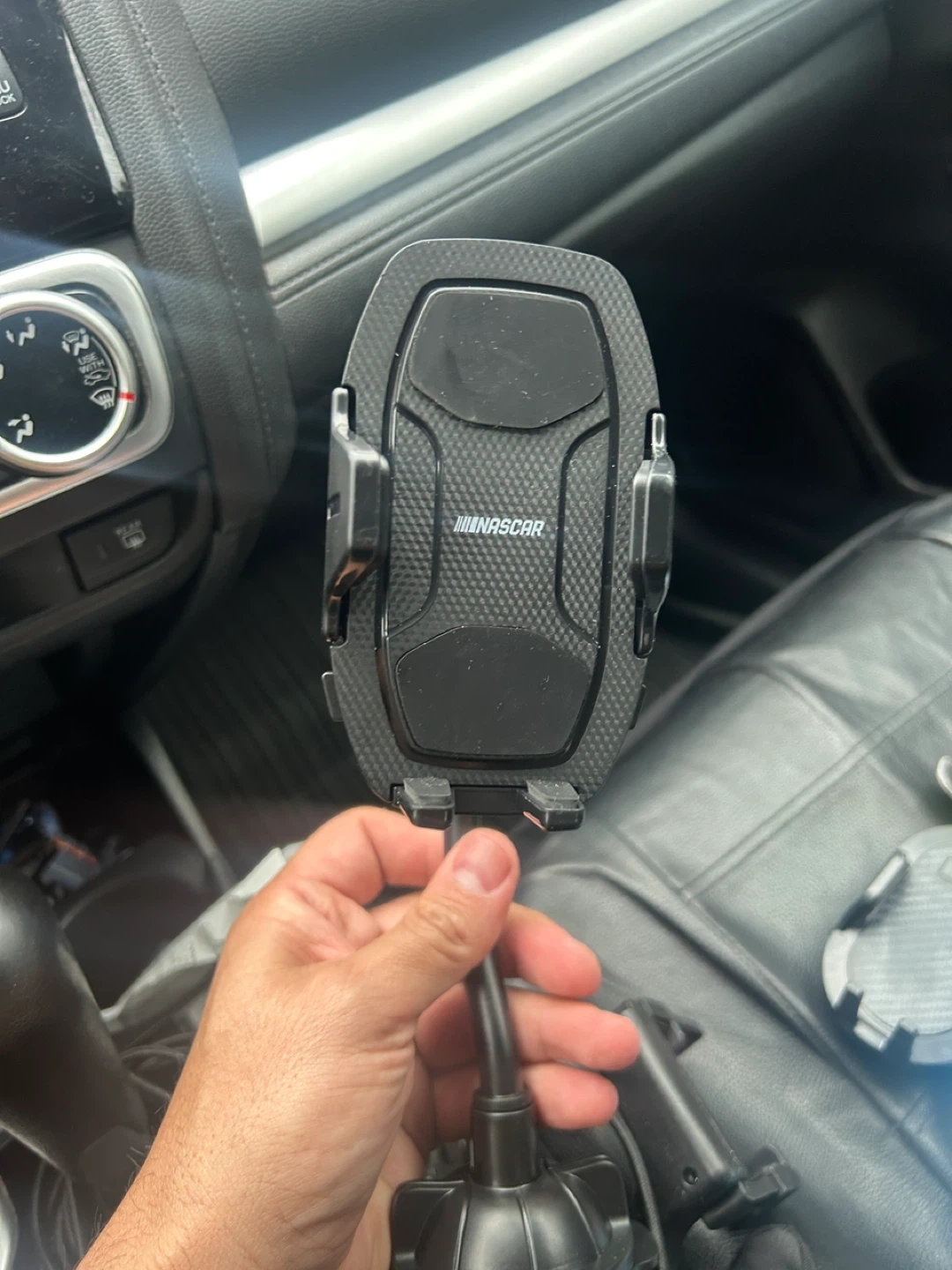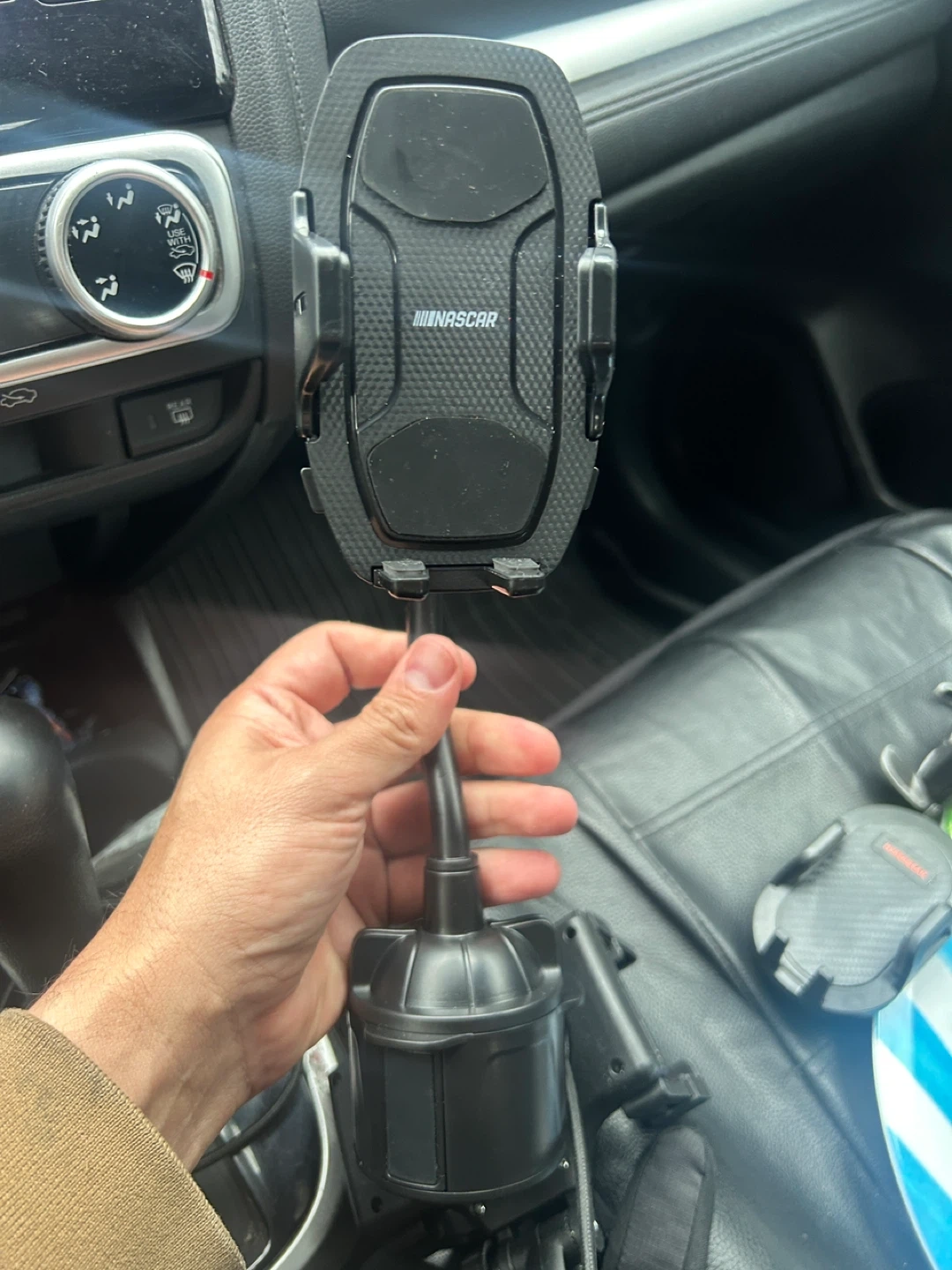 This is a NASCAR branded cup holder phone mount. It features an adjustable gooseneck for optimal phone positioning. The mount's base fits securely into most car cup holders.