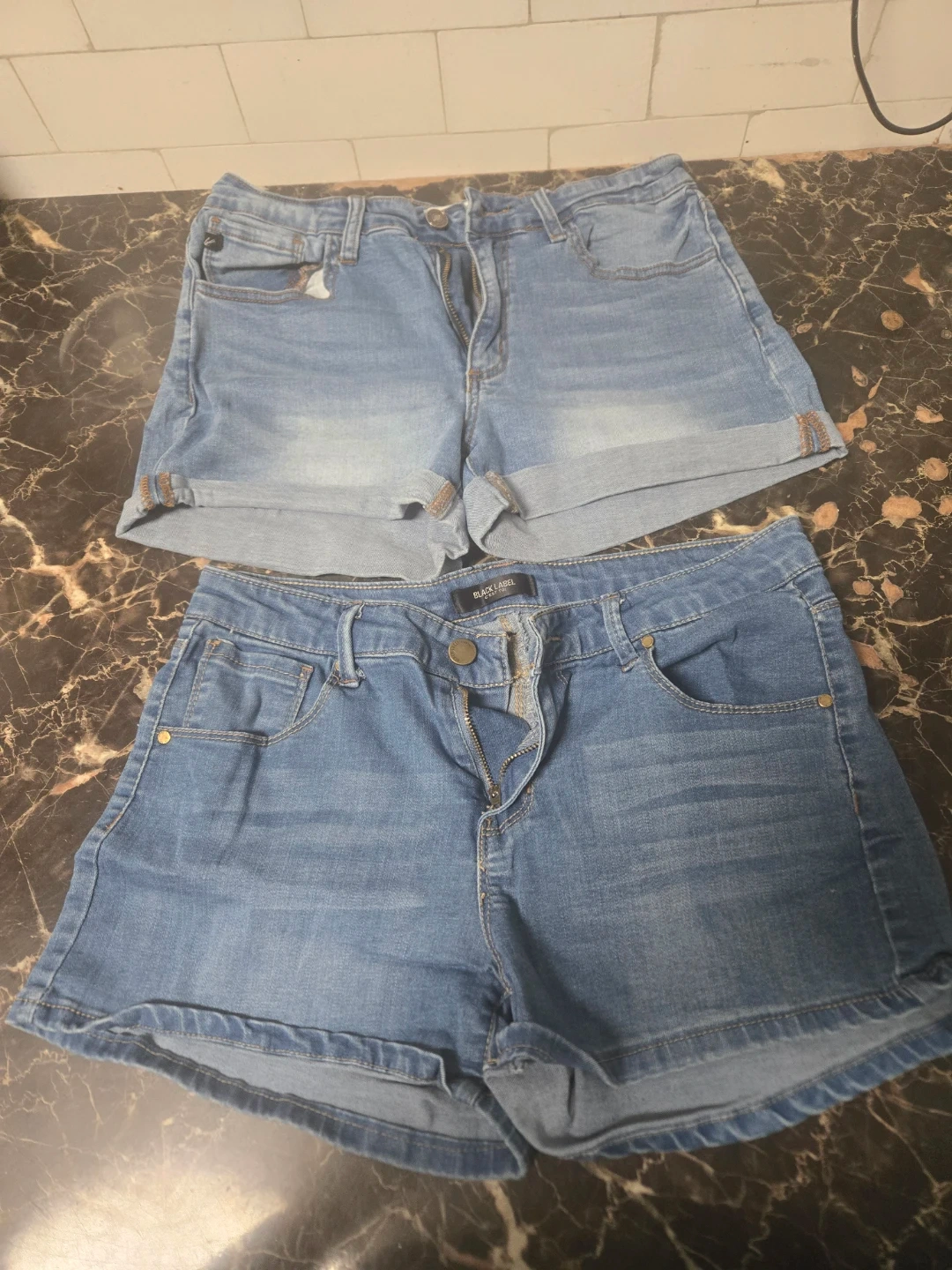 Selling two pairs of denim shorts. One pair is Kancan brand and the other is Black Label brand. Both are in good condition and ready for a new home!
